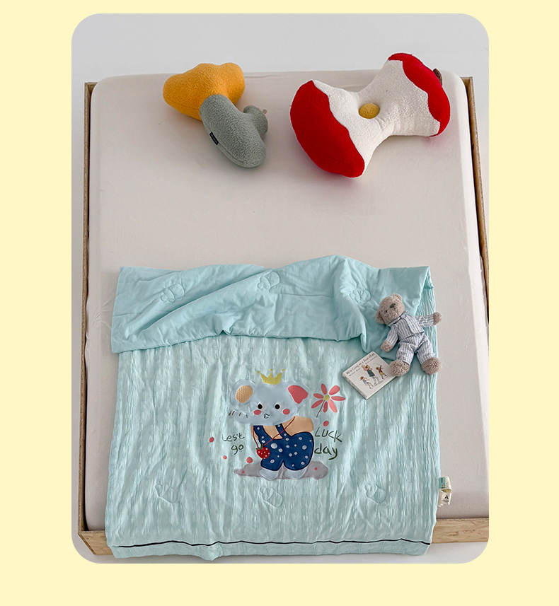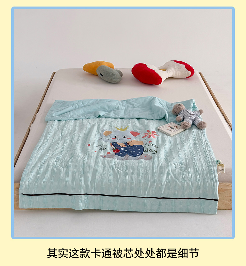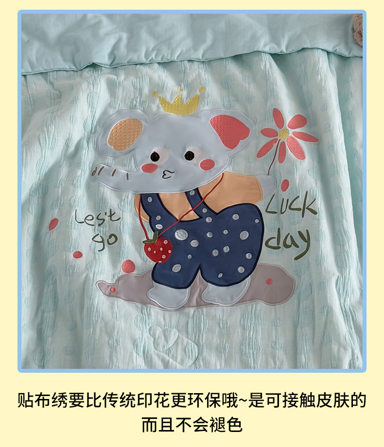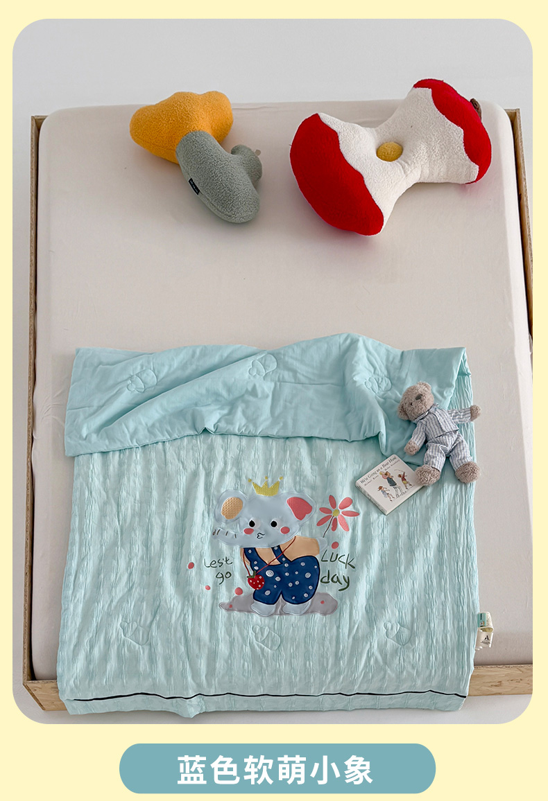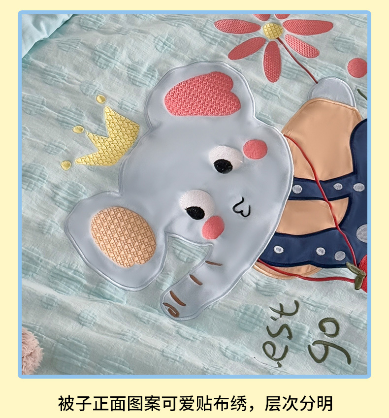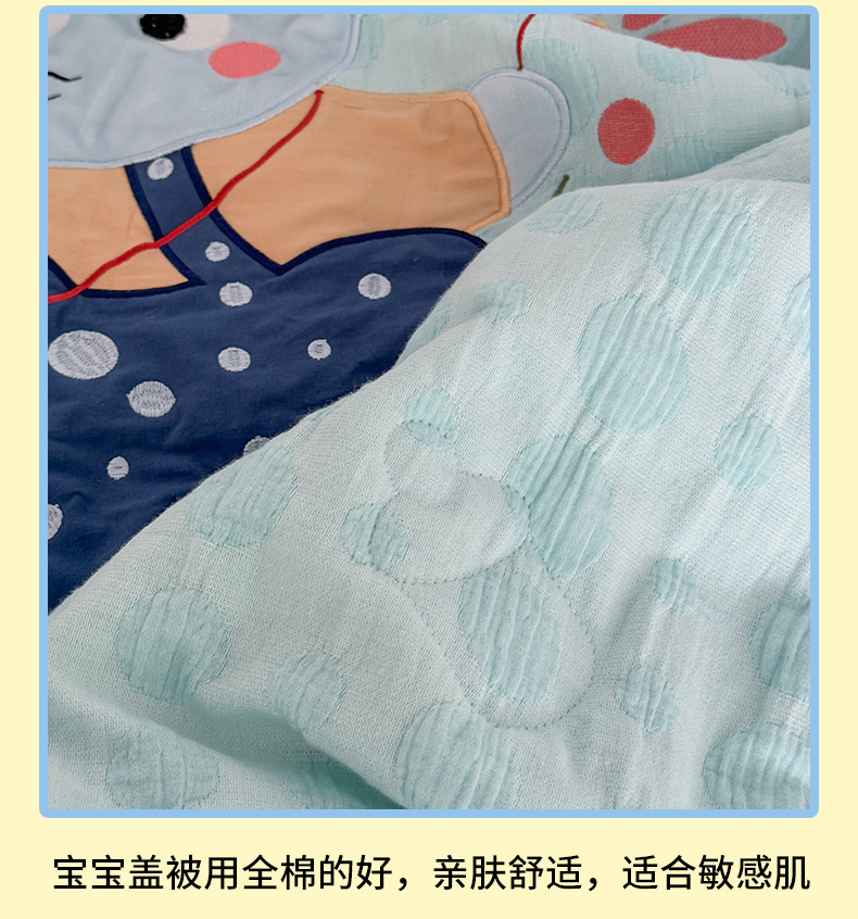 • 91家纺网 家纺一手货源 找家纺 喜多兔儿童家纺 2025春夏新款小软萌贴布绣纱布被 蓝色软萌小象