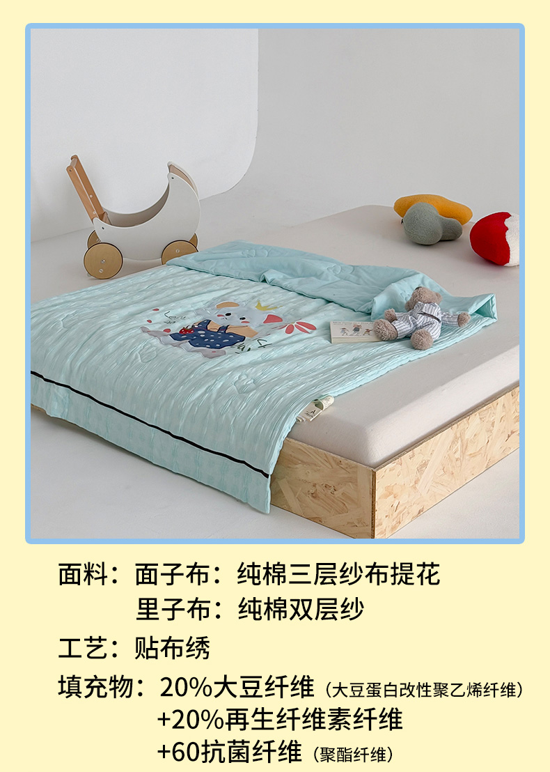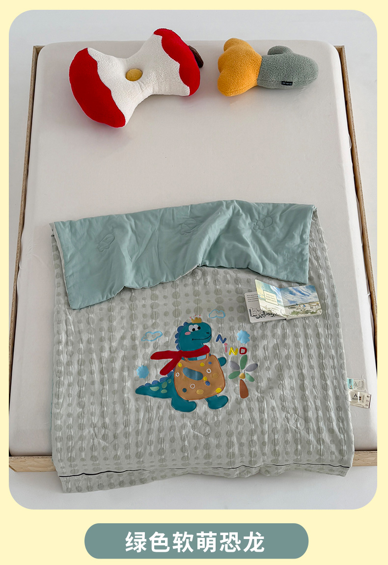 • 91家纺网 家纺一手货源 找家纺 (总)喜多兔儿童家纺 2025春夏新款小软萌贴布绣纱布被,粉色软萌小兔,卡其色软萌小熊,蓝色软萌小象,绿色软萌恐龙,组合图仅供展示