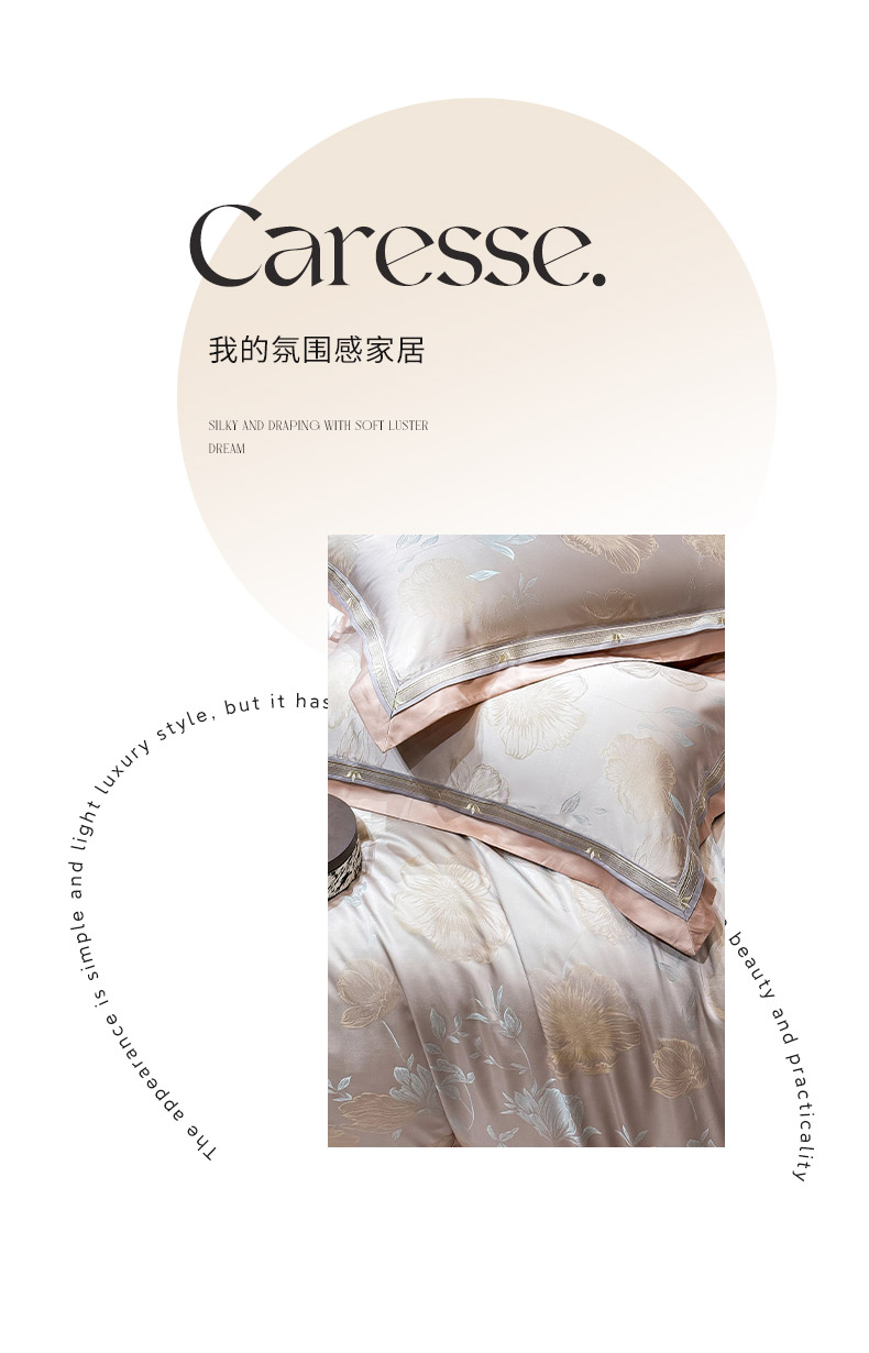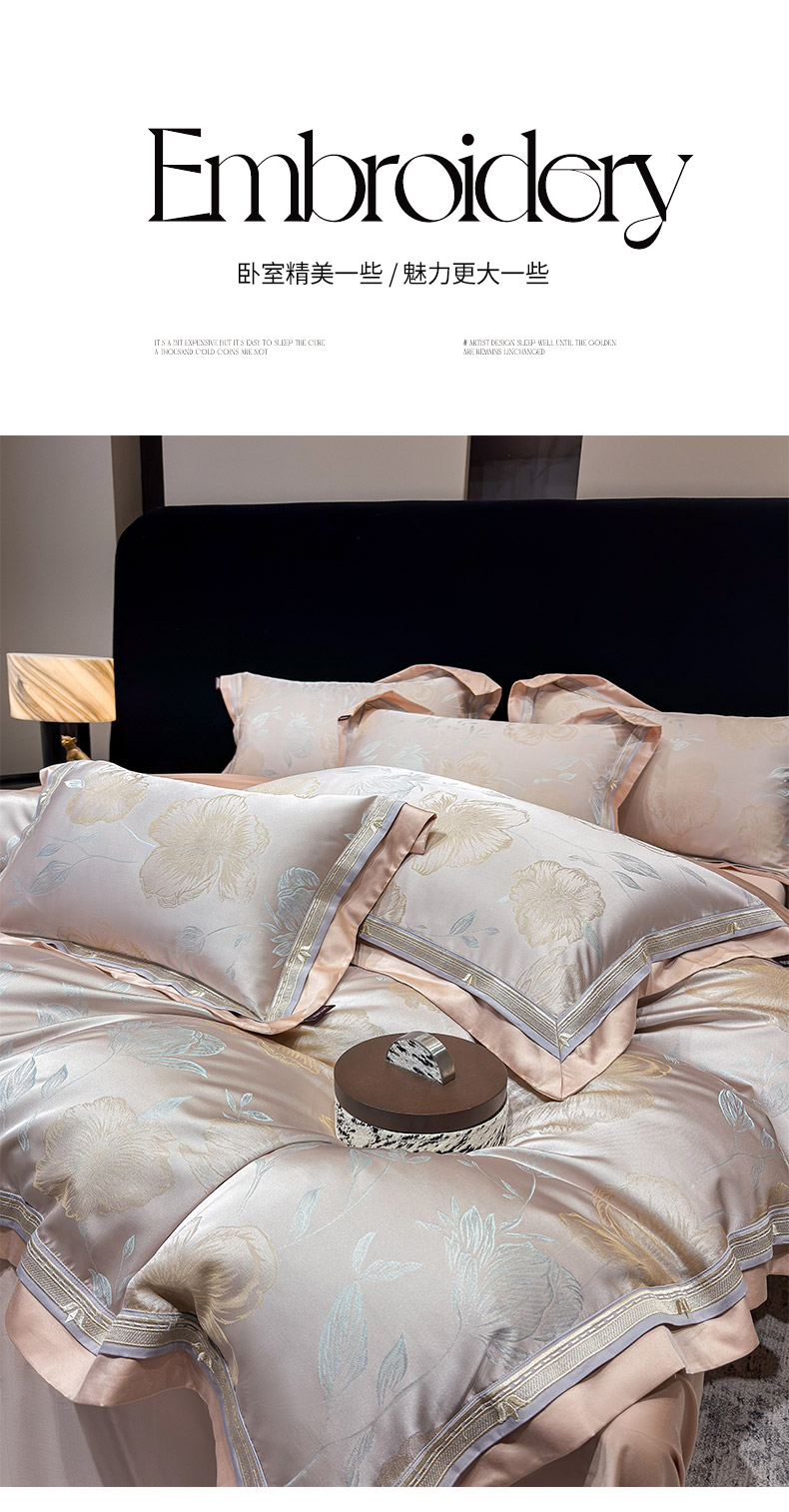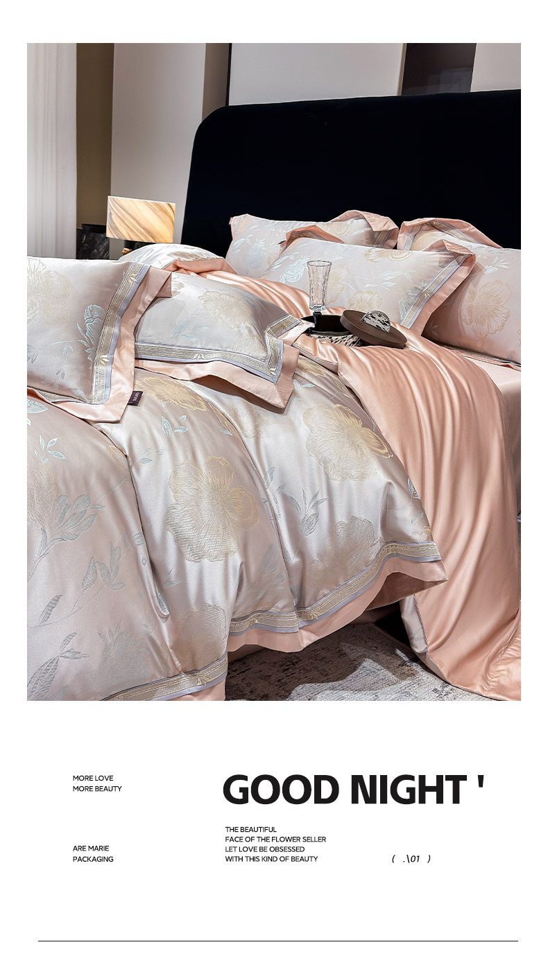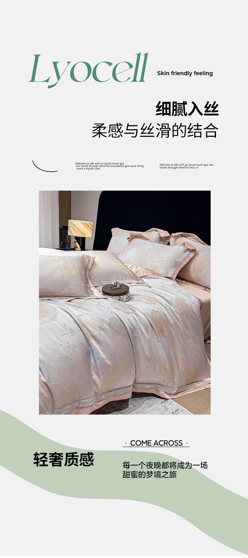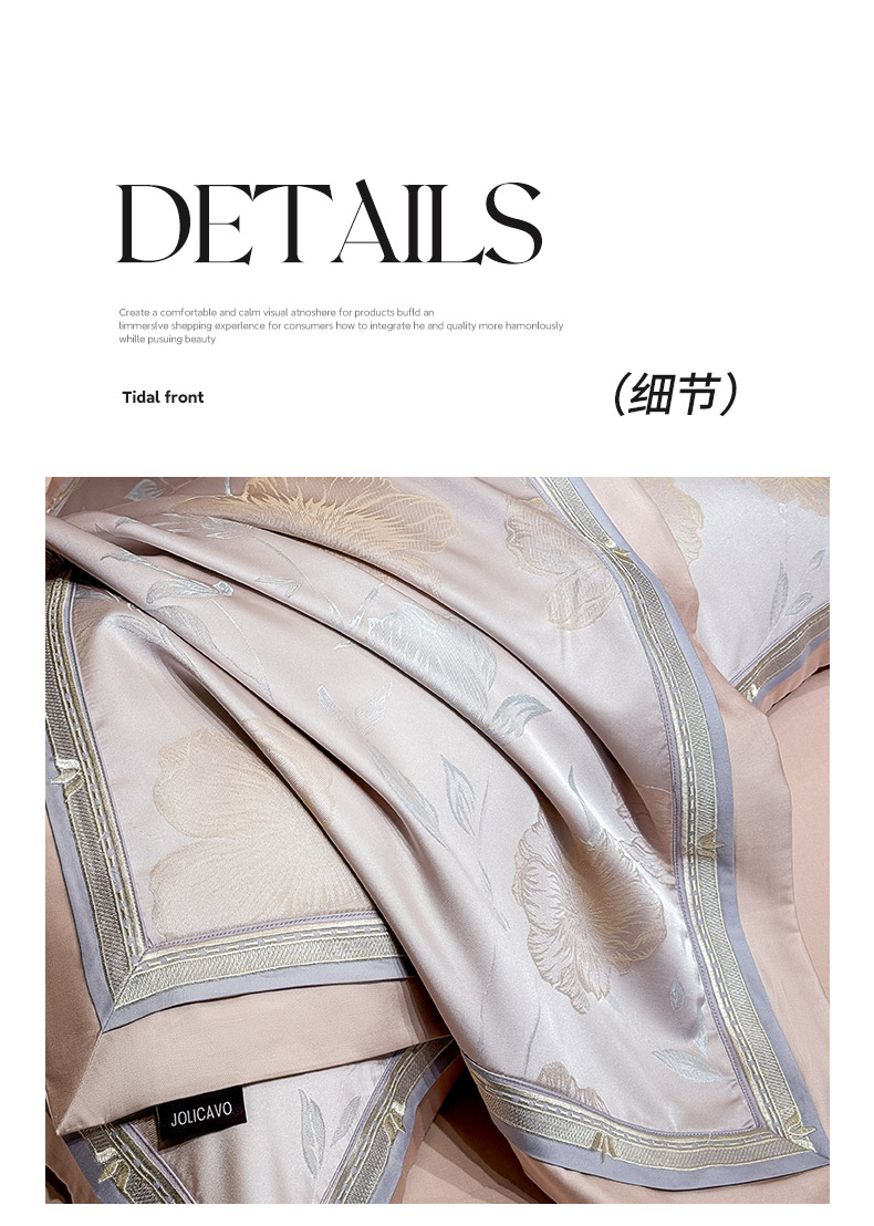 商品名称: 2025新款轻奢A类天丝棉提花四件套真丝贡缎全工艺丝滑裸睡夏季爆款床上用品-茉影 茉影-香蜜粉