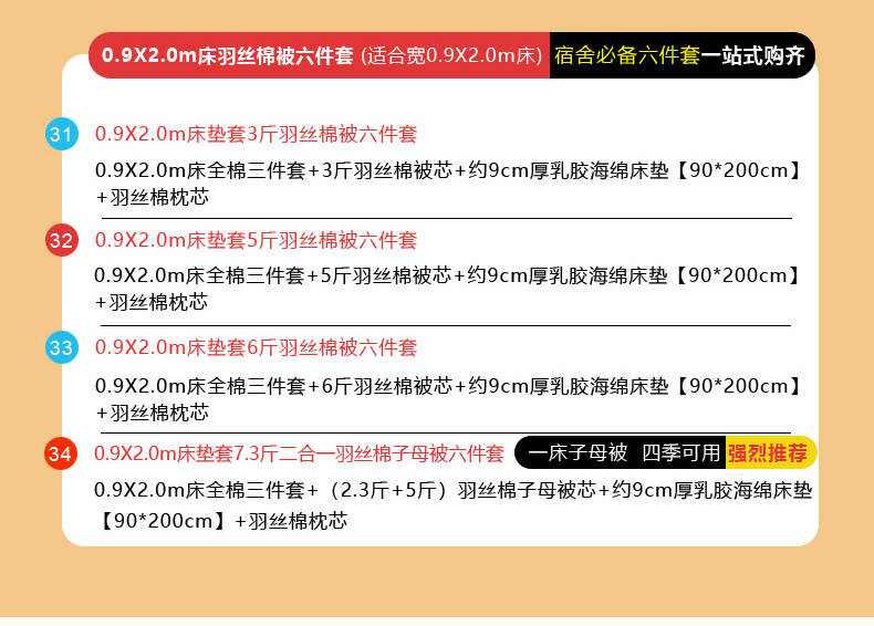 0.9X1.9m床垫套6斤羽丝棉被六件套 | ¥238.00 |