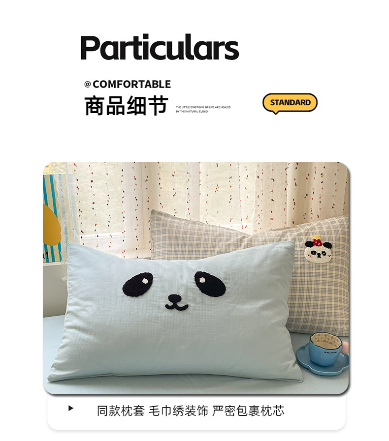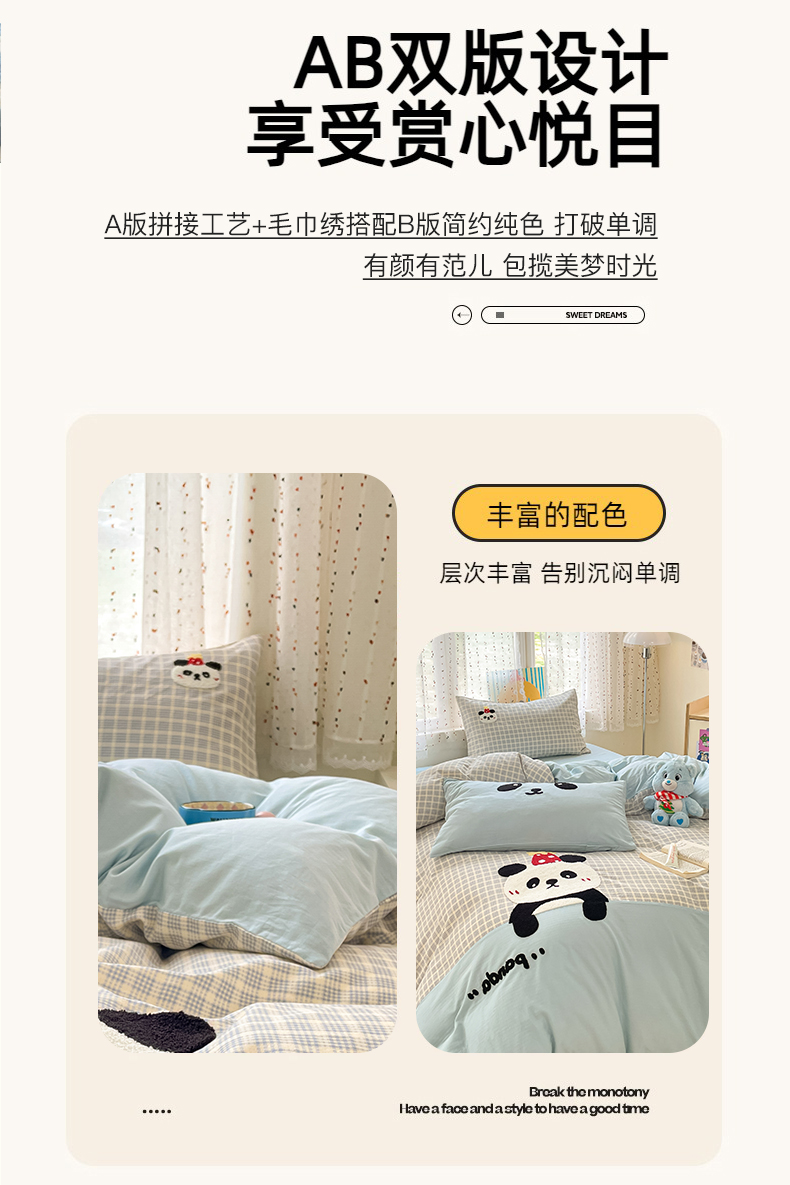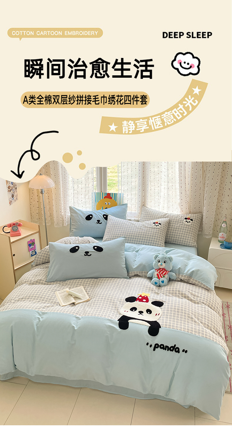 商品名称:寐居家纺 2025新款全棉纯棉A类双层纱拼接毛巾绣花四件套 团团熊猫