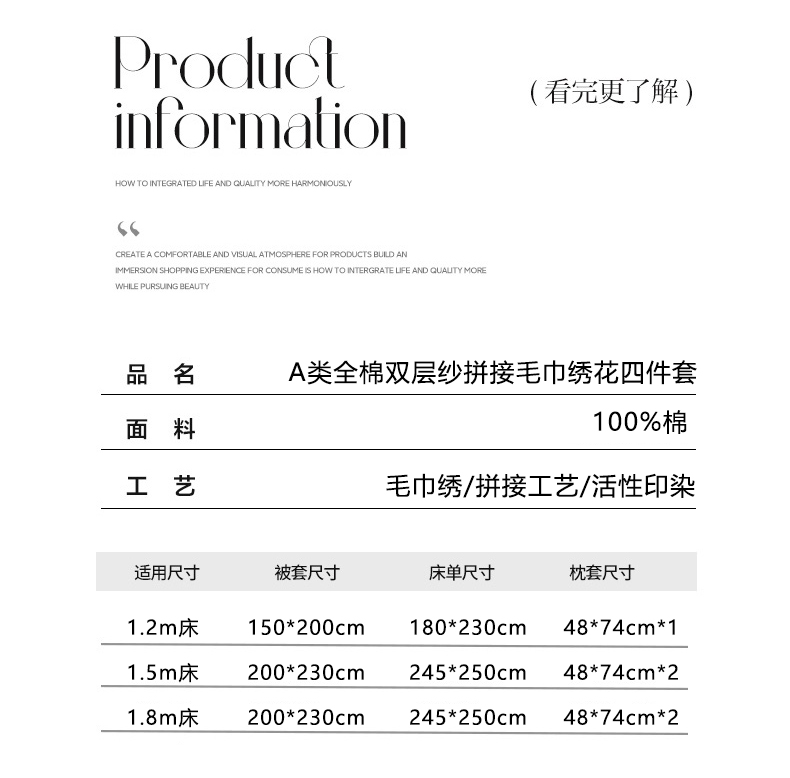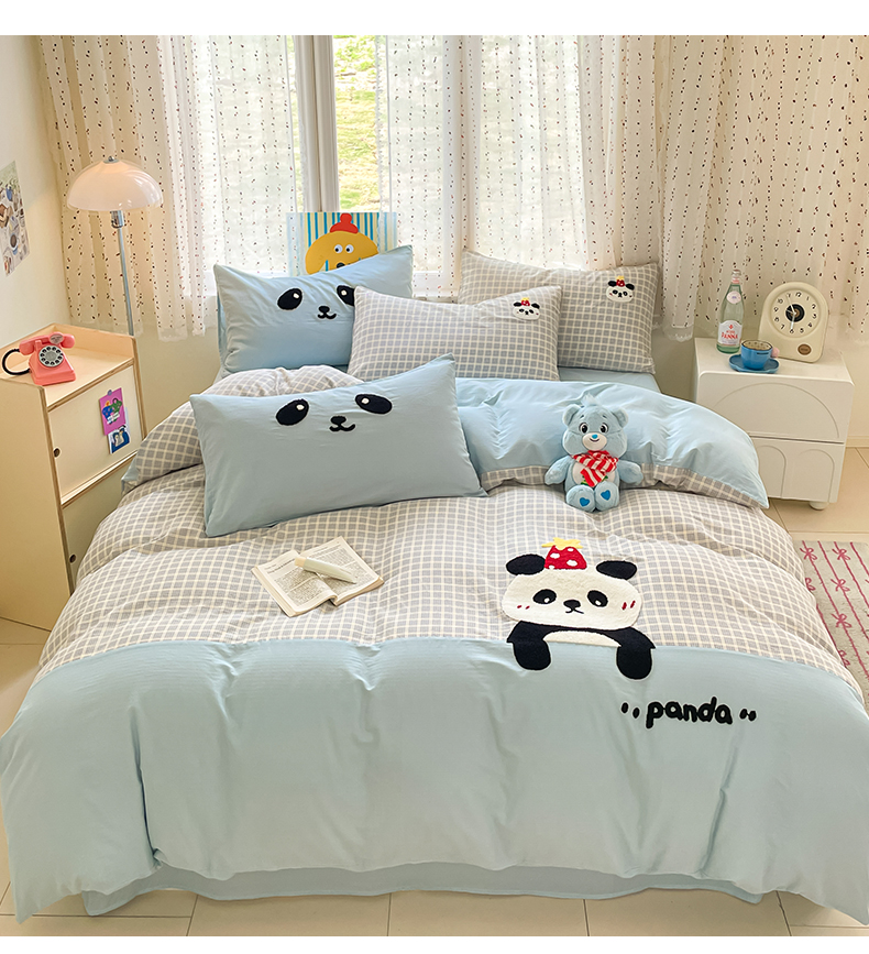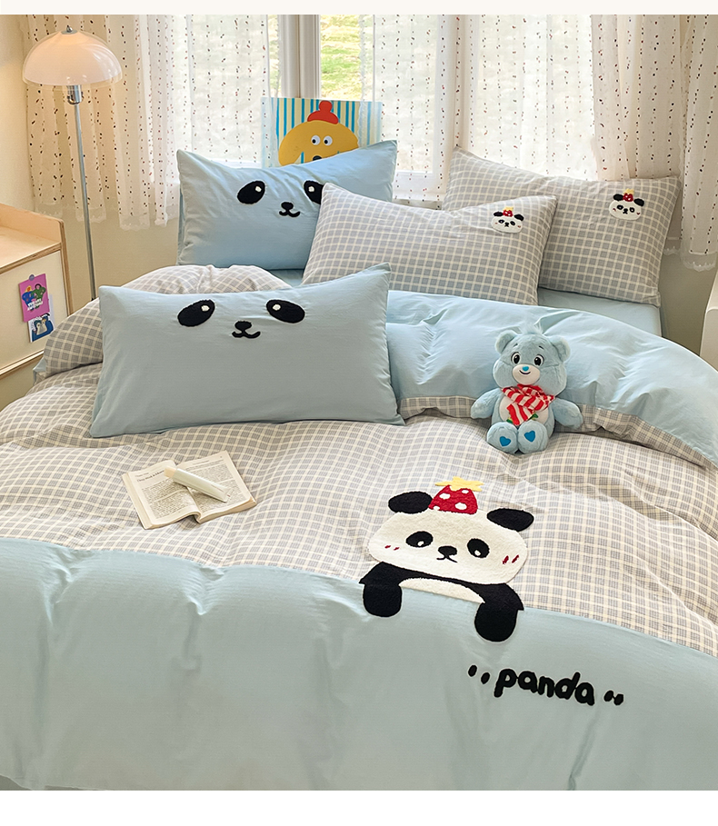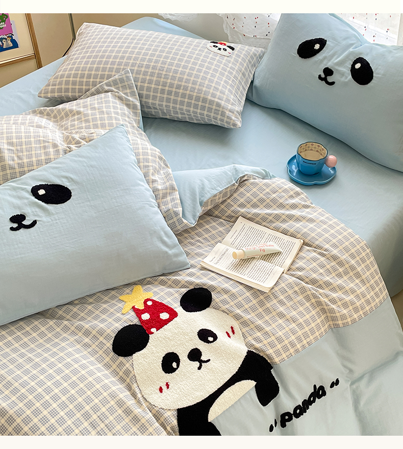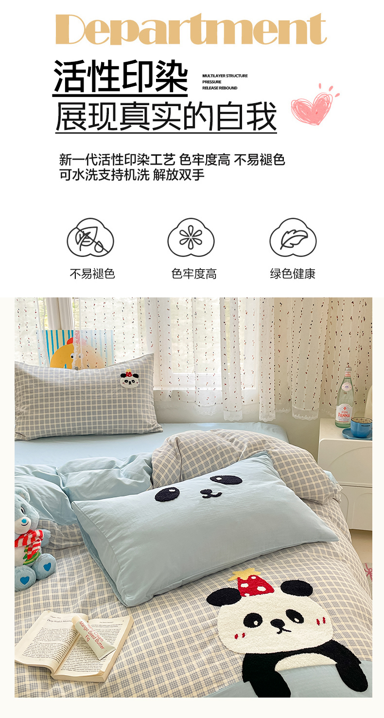商品名称:寐居家纺 2025新款全棉纯棉A类双层纱拼接毛巾绣花四件套 团团熊猫