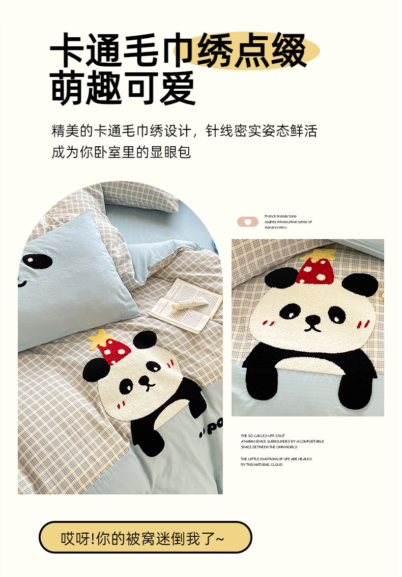 寐居家纺 2025新款全棉纯棉A类双层纱拼接毛巾绣花四件套 团团熊猫