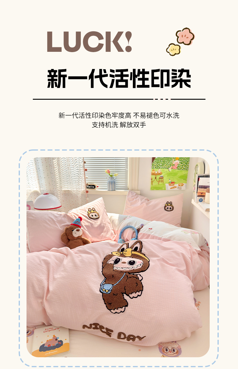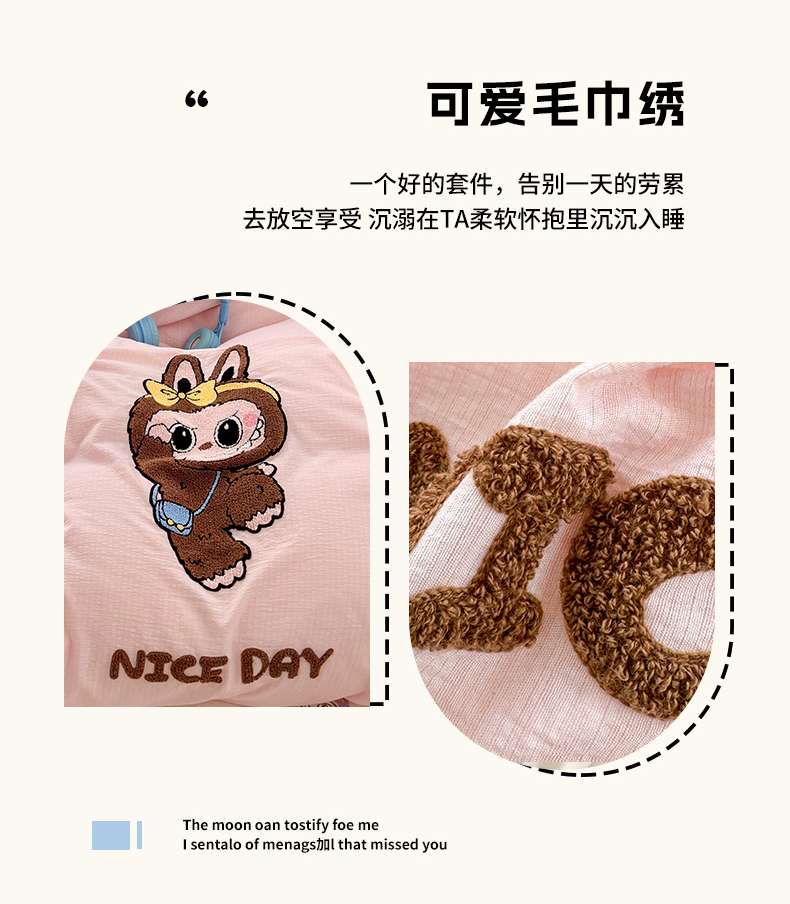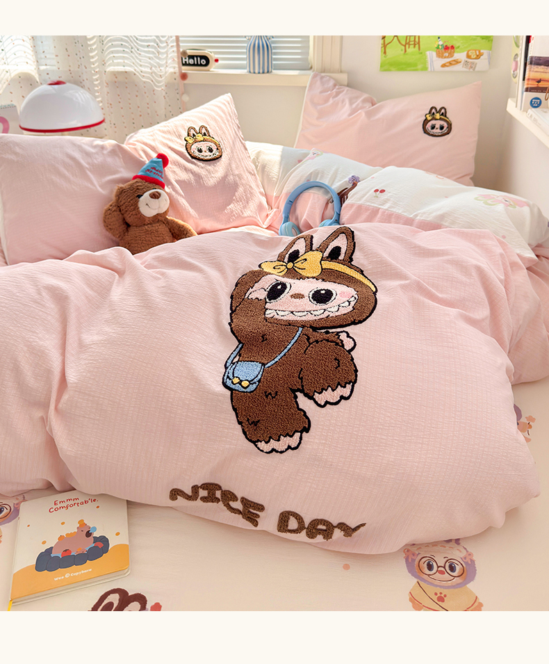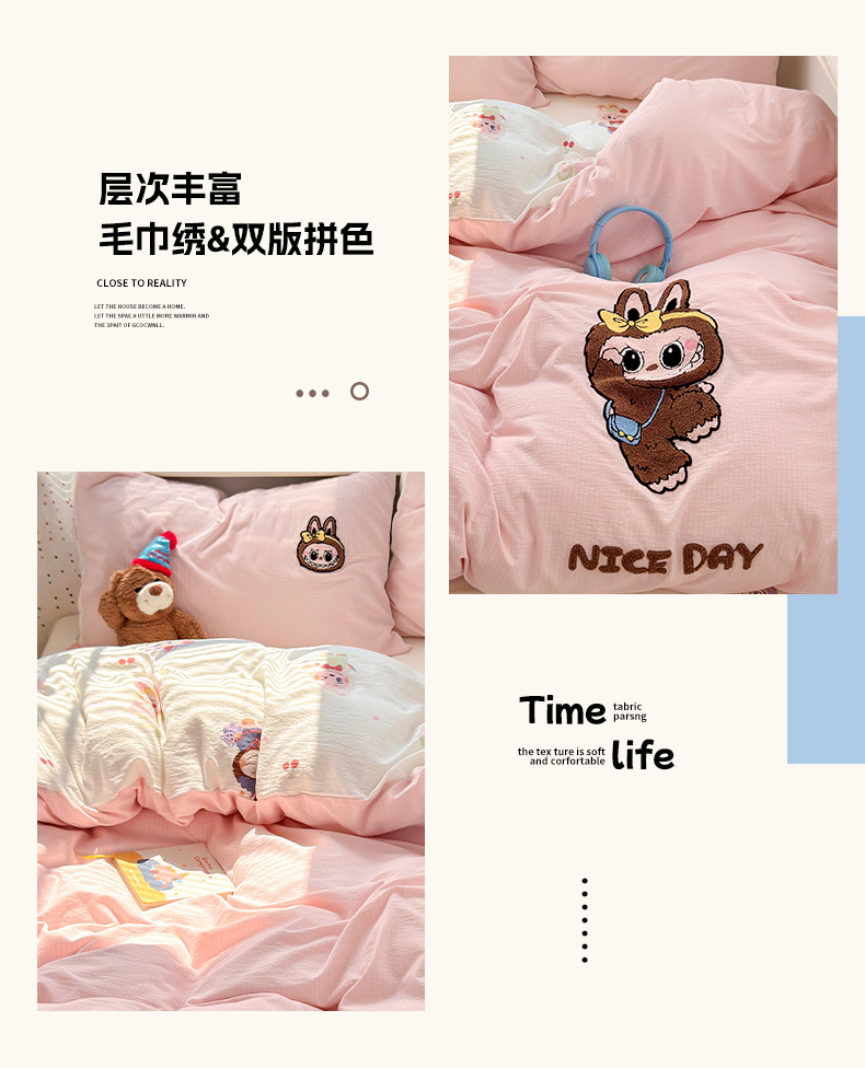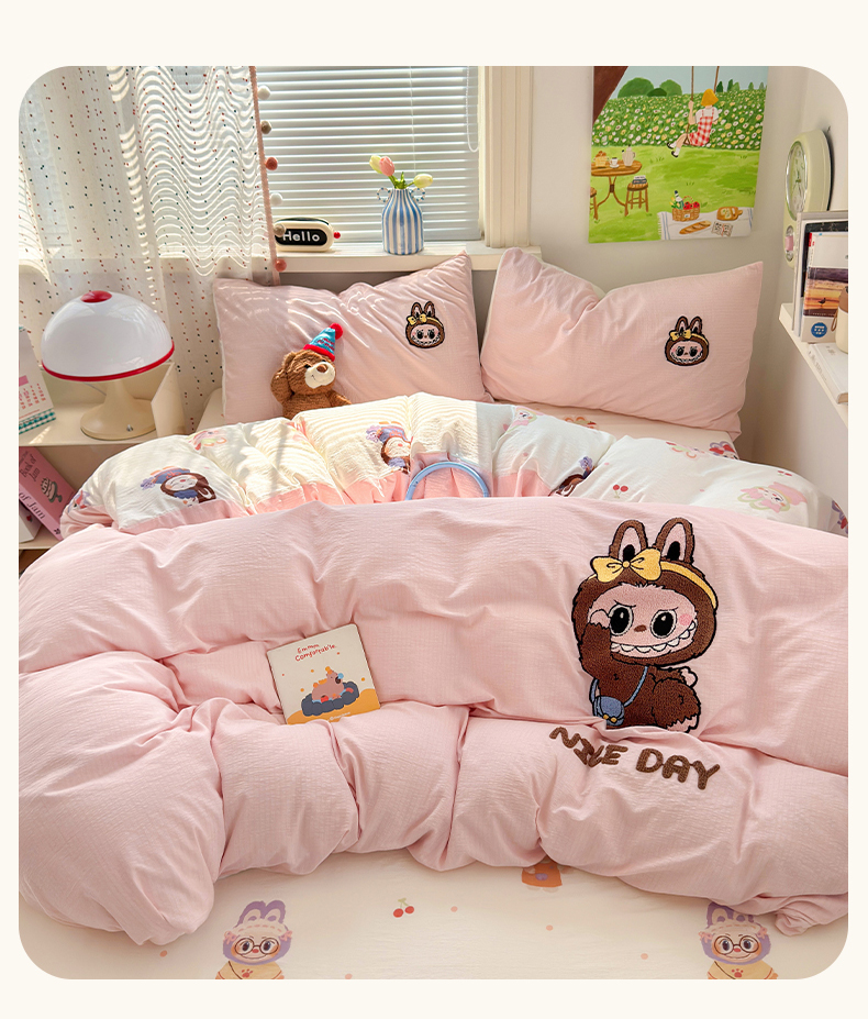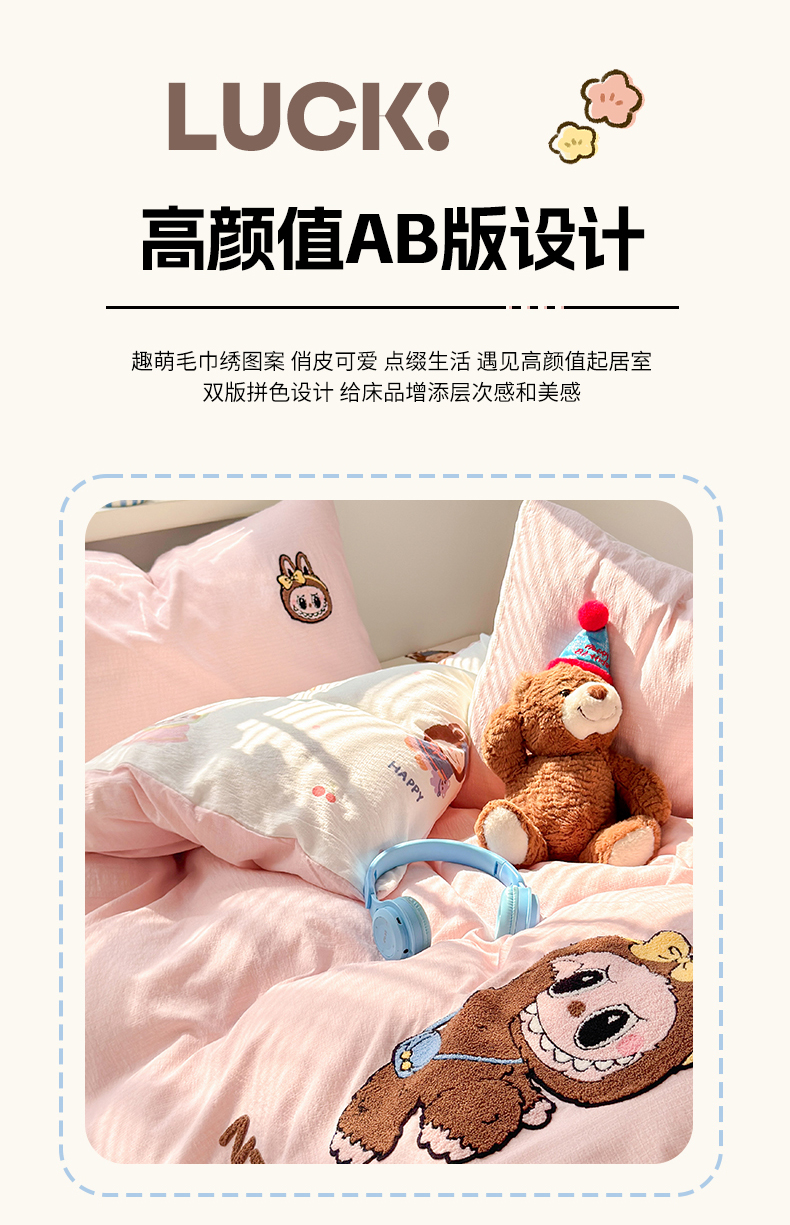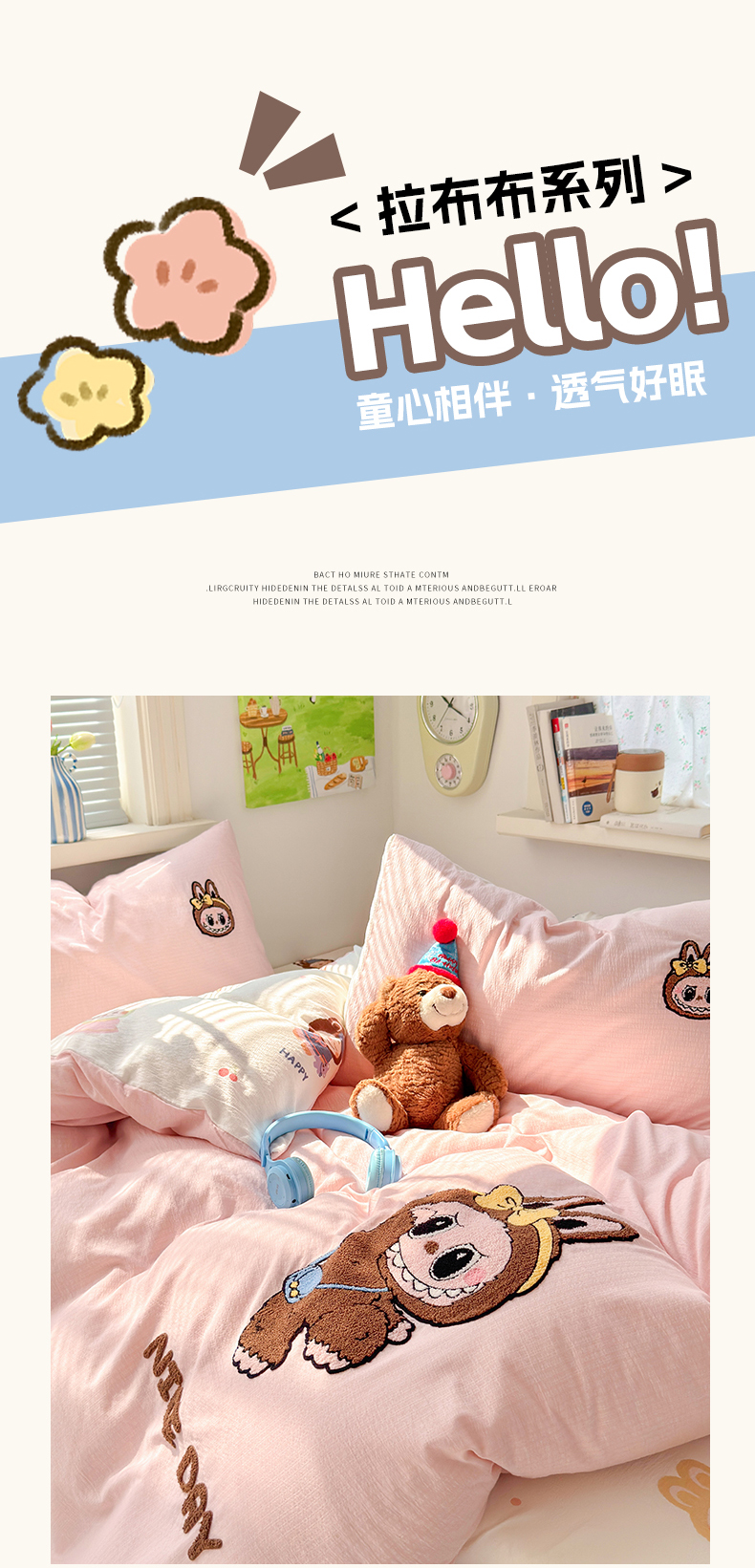 当前位置: 91家纺网 > 商品网购 > 床品套件 > 四件套 > 毛巾绣四件套 > 罗亿家纺 2025新款云感双层纱卡通毛巾绣四件套(拉布布系列场景二) 可爱布布-粉