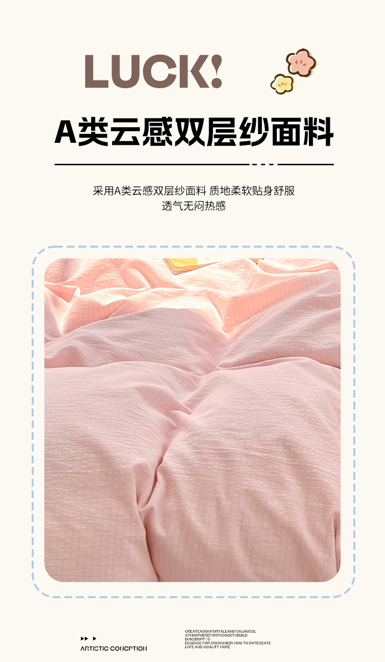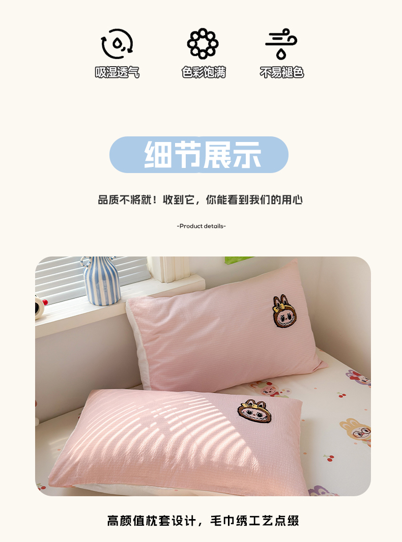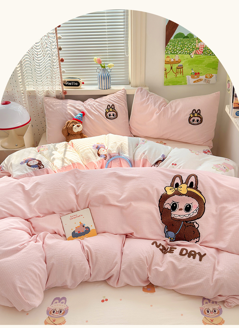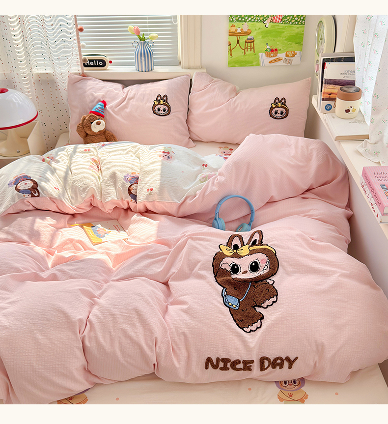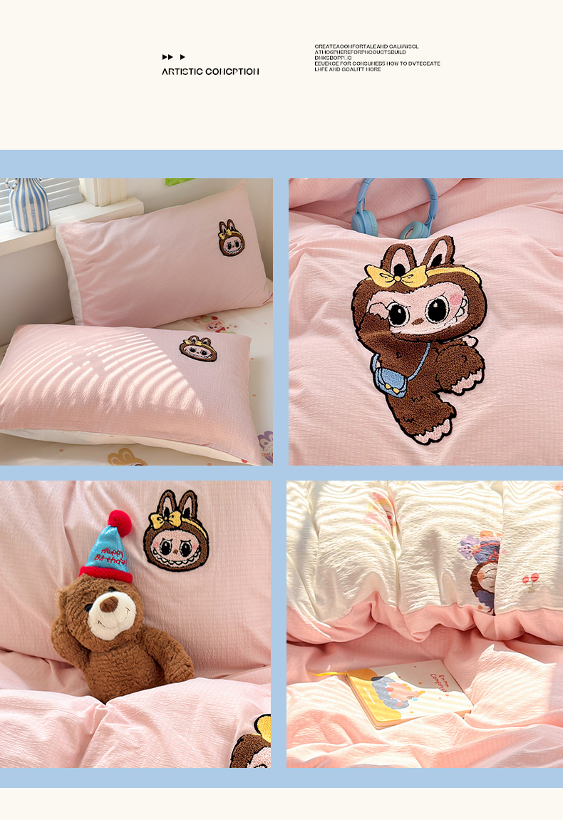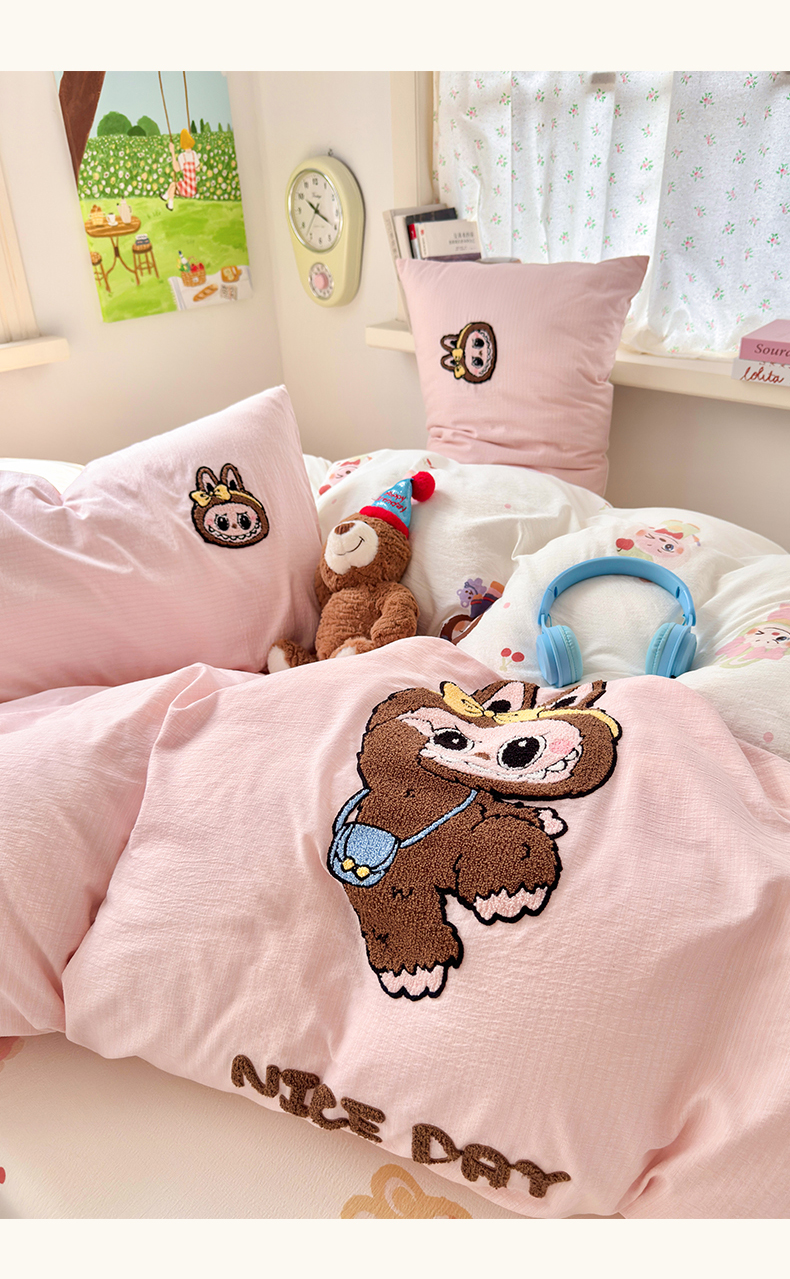 当前位置: 91家纺网 > 商品网购 > 床品套件 > 四件套 > 毛巾绣四件套 > 罗亿家纺 2025新款云感双层纱卡通毛巾绣四件套(拉布布系列场景二) 可爱布布-粉