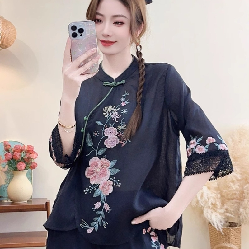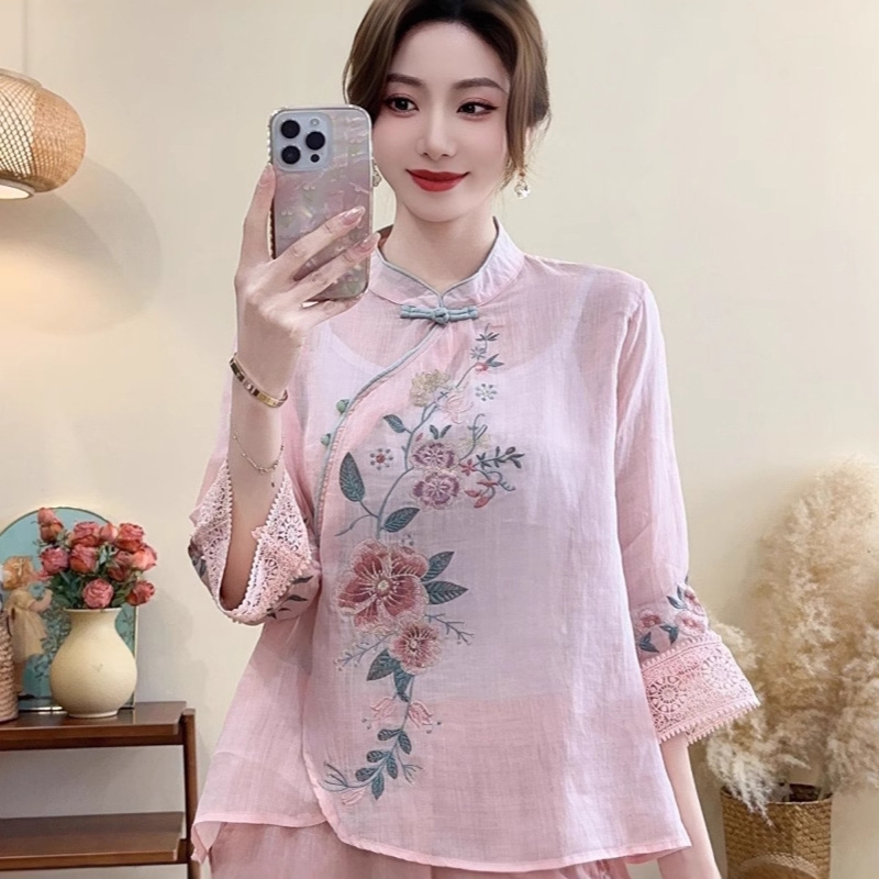洛兰沙家居馆【只代发】【只代发】 2025春夏新款复古立领斜襟盘扣七分袖T恤文艺刺绣苎麻显瘦上衣女 红色