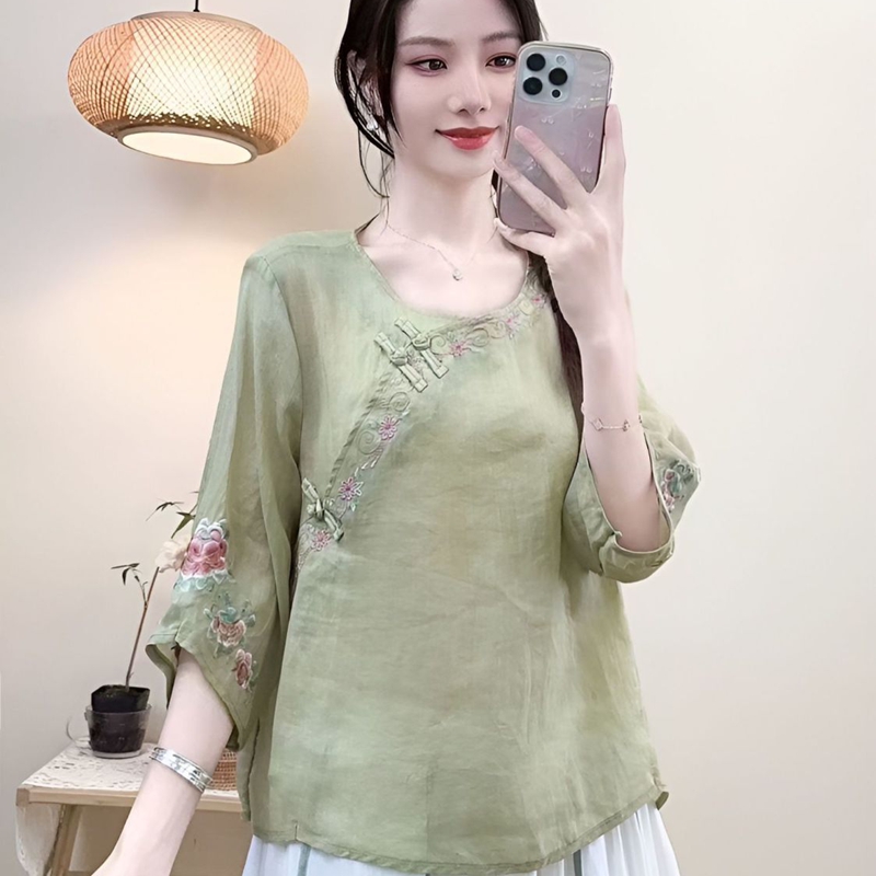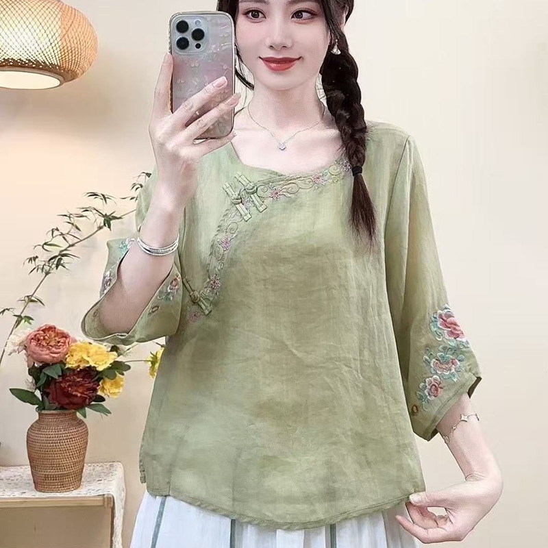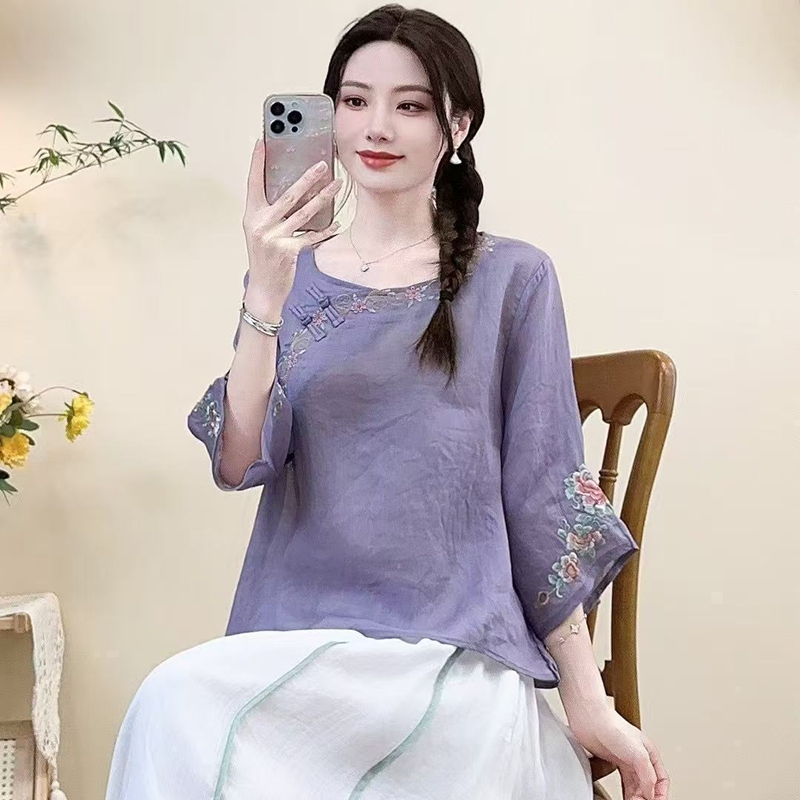 (总)洛兰沙家居馆【只代发】【只代发】 2025新款国风夏季棉麻斜襟绣花上衣盘扣文艺中国民族刺绣复古茶服衬衫