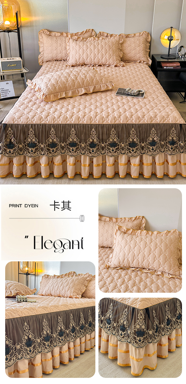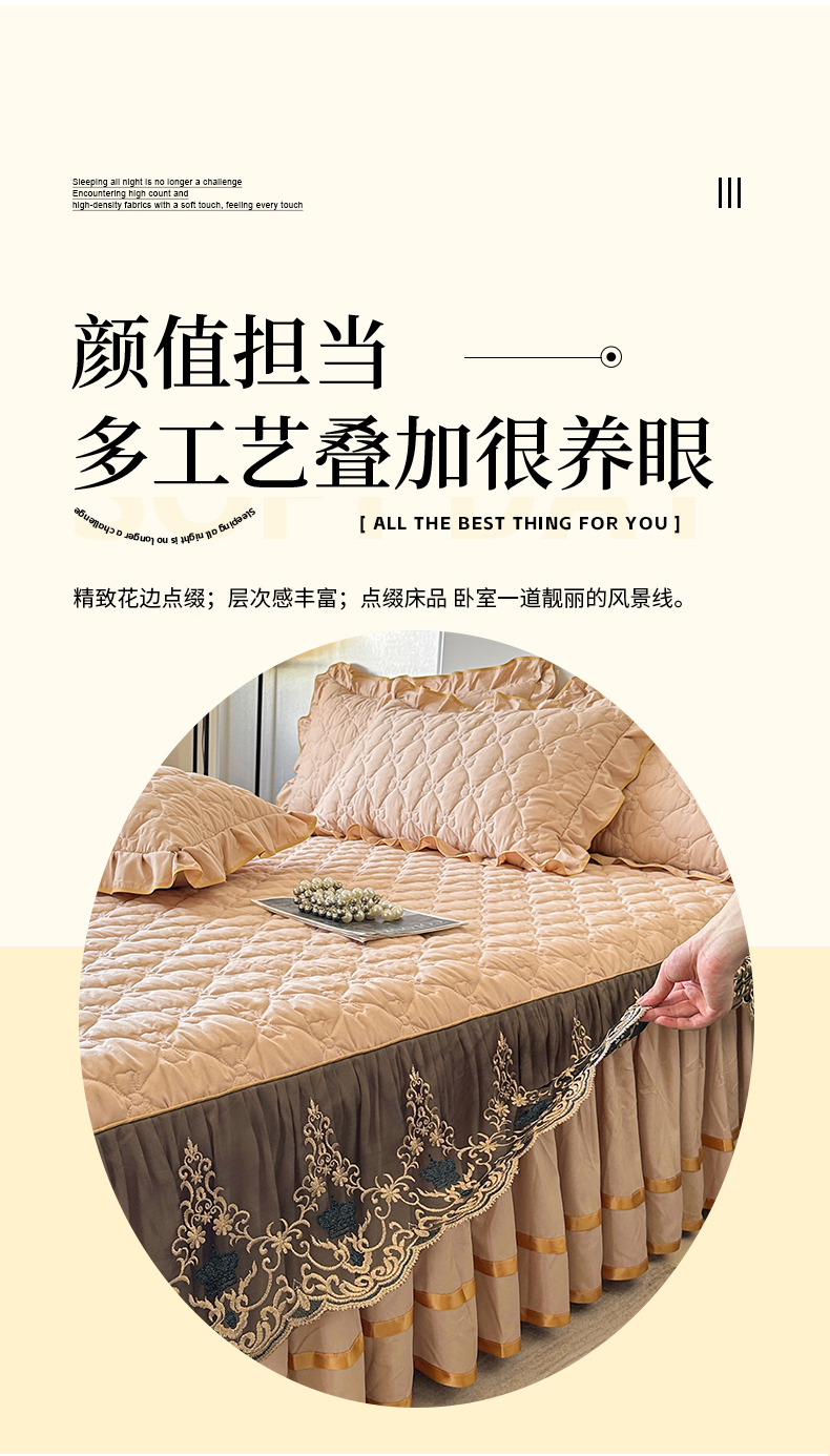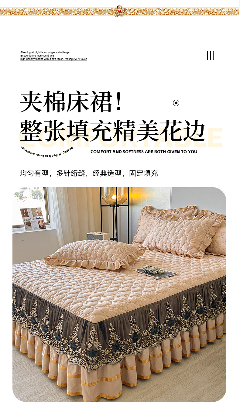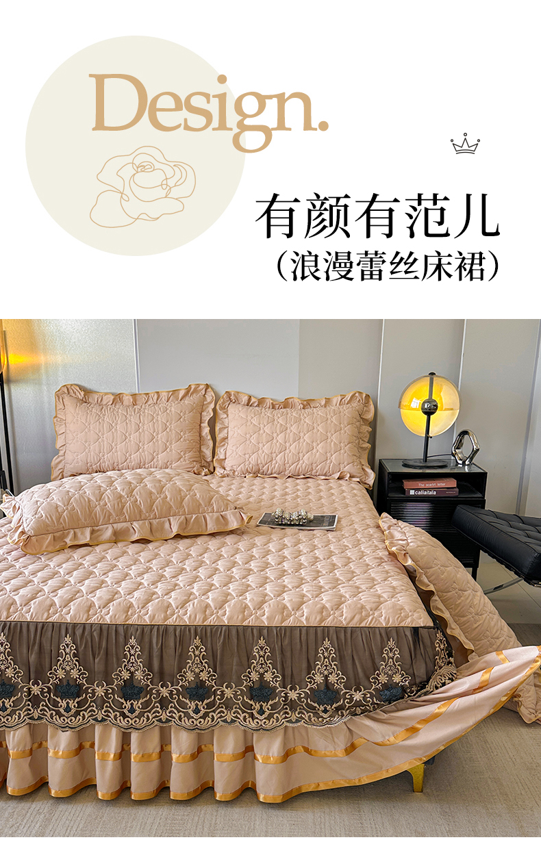 (总)屹成家纺2025新款水晶绒夹棉绗缝蕾丝床裙三件套(塞纳河畔)床裙单件起售价不低于105元,大红,豆沙,翡翠绿,粉玉,橄榄绿,蔚蓝,银灰