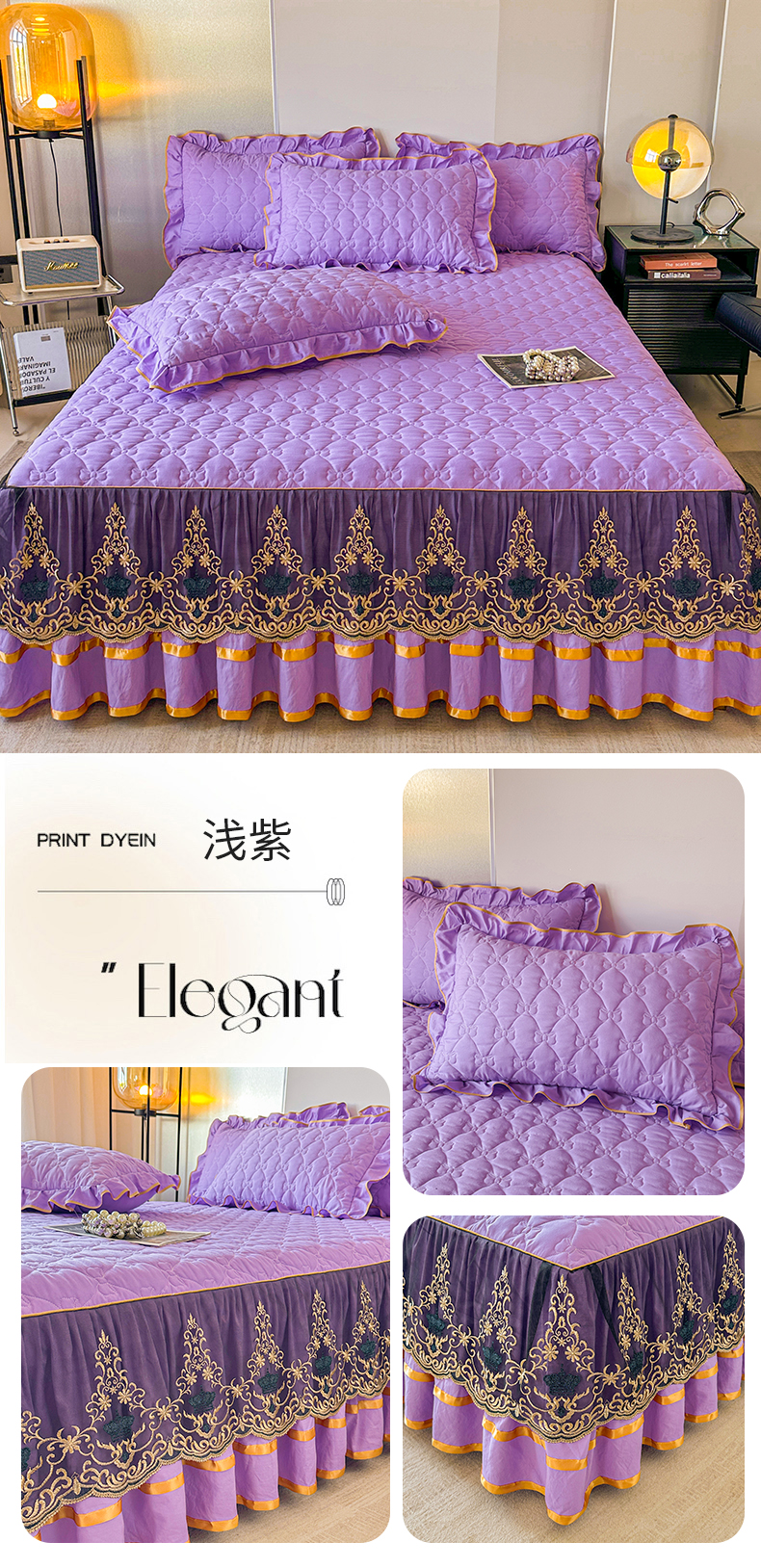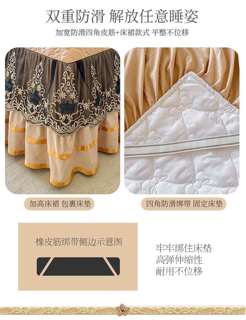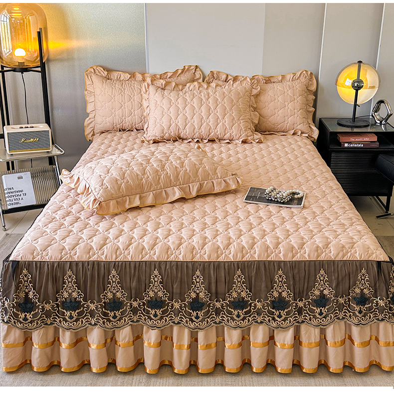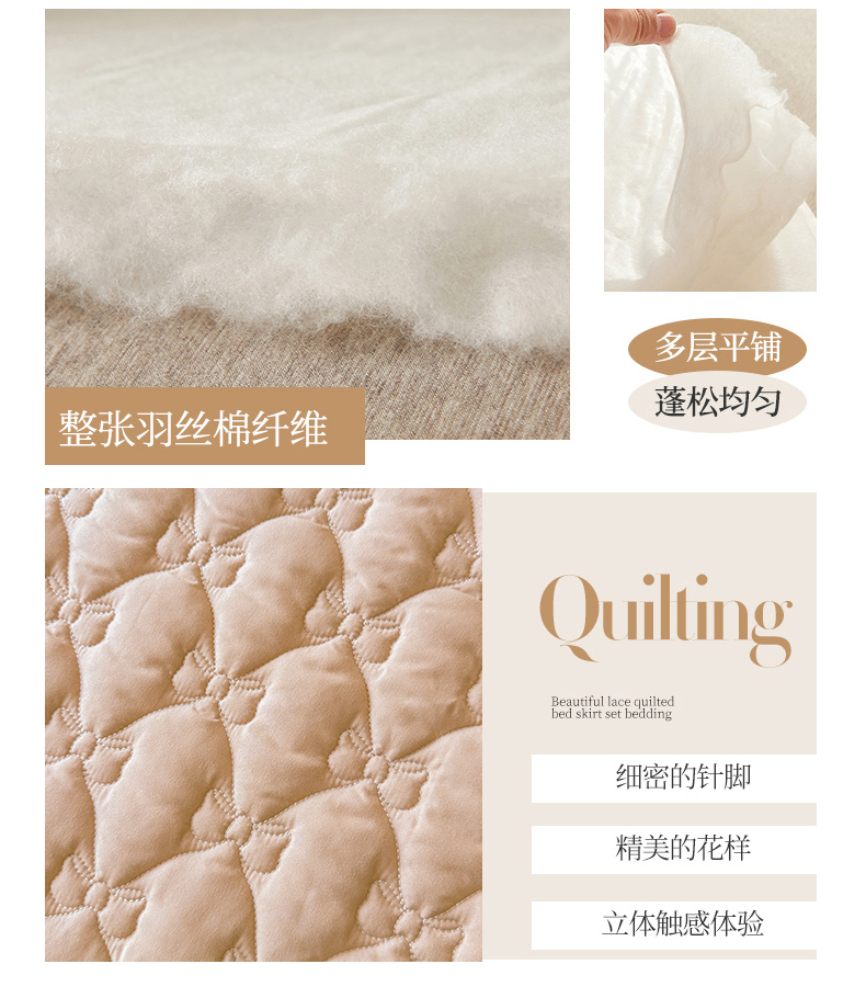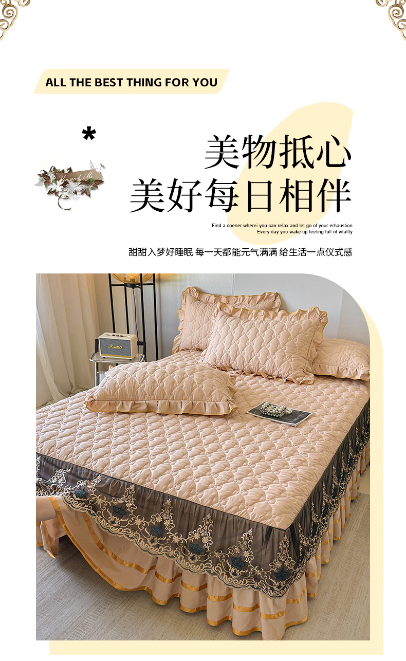 (总)屹成家纺2025新款水晶绒夹棉绗缝蕾丝床裙三件套(塞纳河畔)床裙单件起售价不低于105元,大红,豆沙,翡翠绿,粉玉,橄榄绿,蔚蓝,银灰