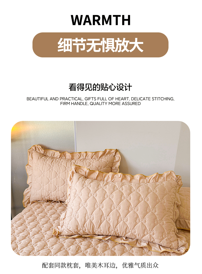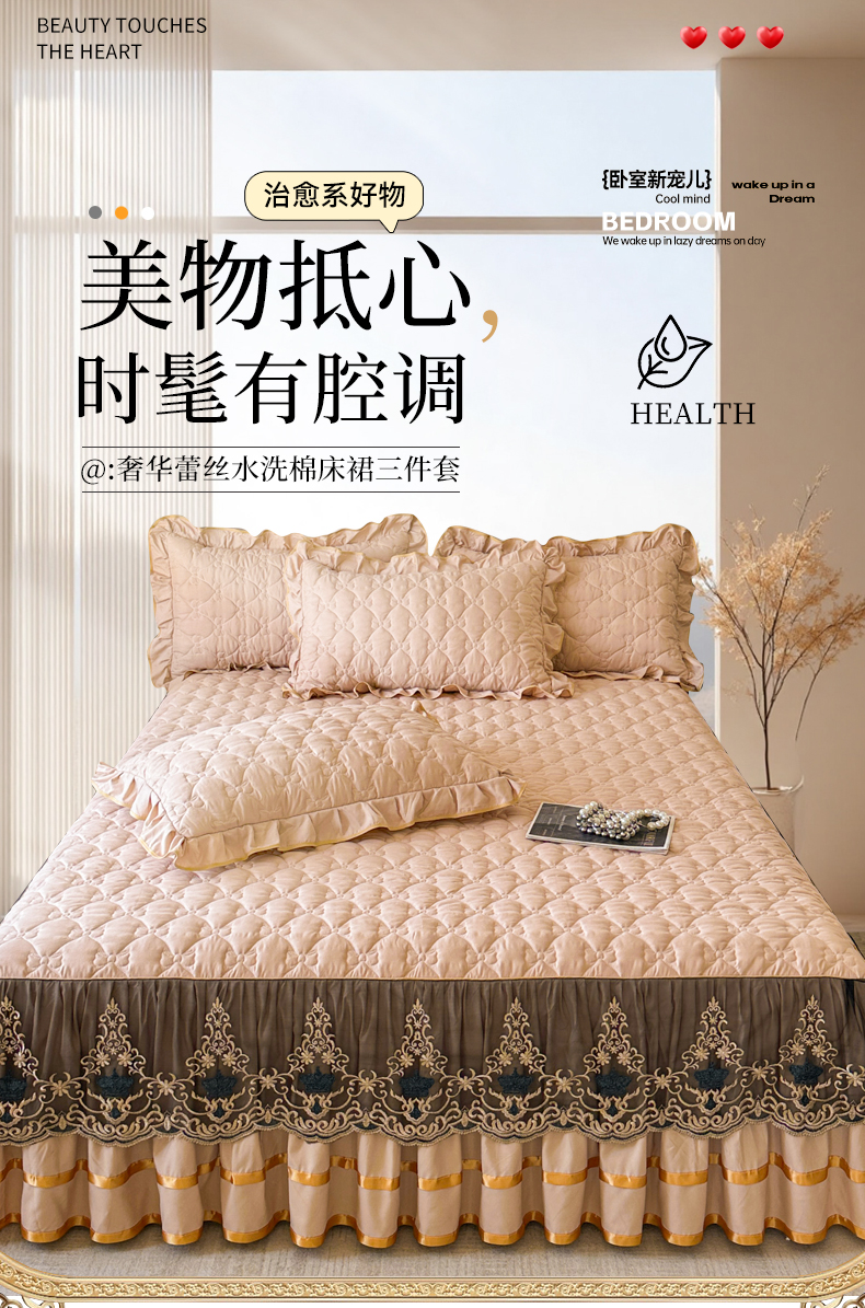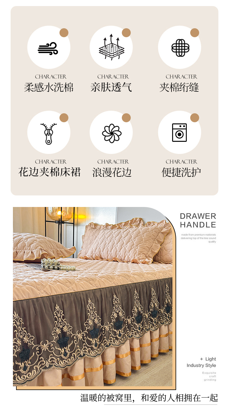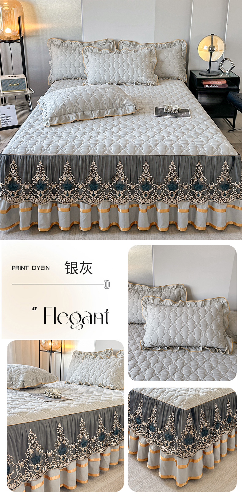 (总)屹成家纺2025新款水晶绒夹棉绗缝蕾丝床裙三件套(塞纳河畔)床裙单件起售价不低于105元,大红,豆沙,翡翠绿,粉玉,橄榄绿,蔚蓝,银灰