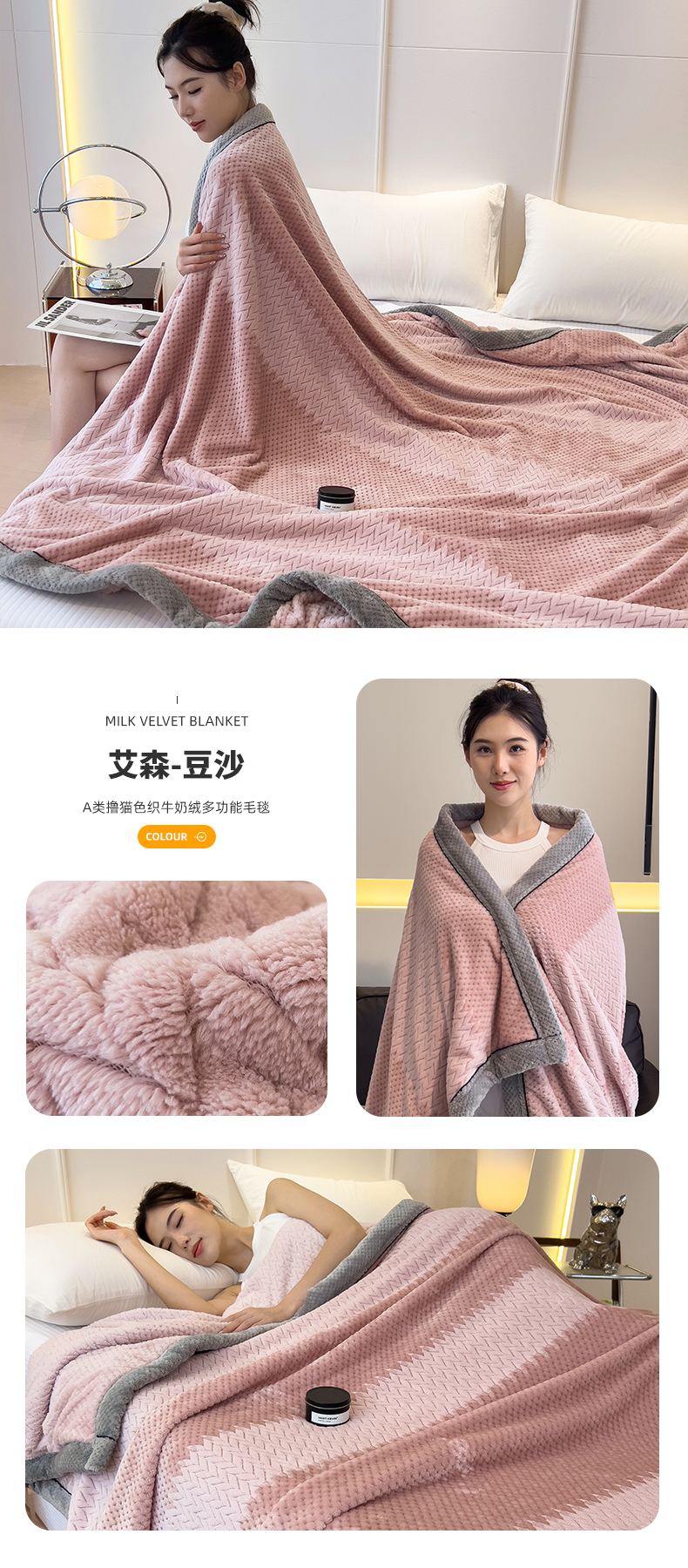 商品名称:世纪绒品 2025新款A类撸猫色织牛奶绒多功能毛毯 艾森-豆沙