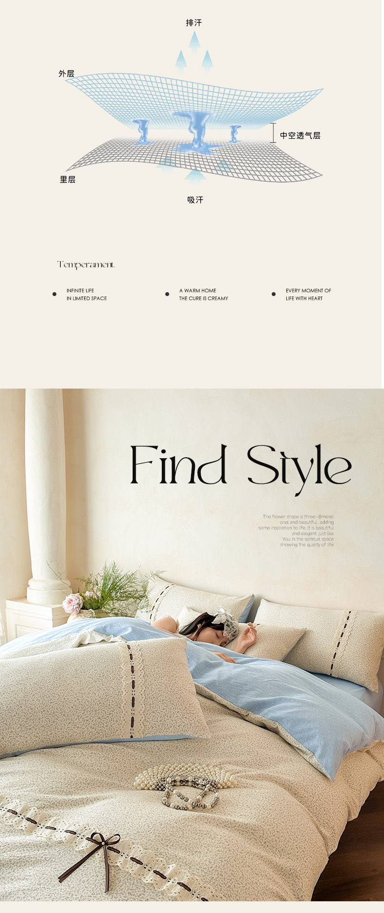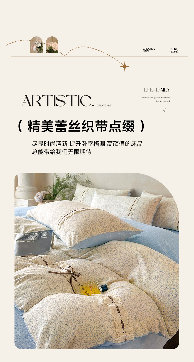 遇见家居生活馆 2025新款亚麻双层纱四件套-叶知秋(小号108 标准128,加大138) 叶知秋-蓝色