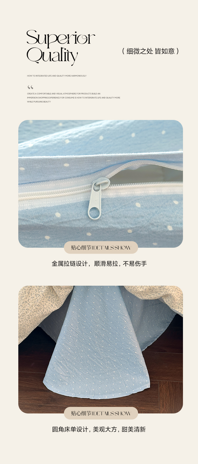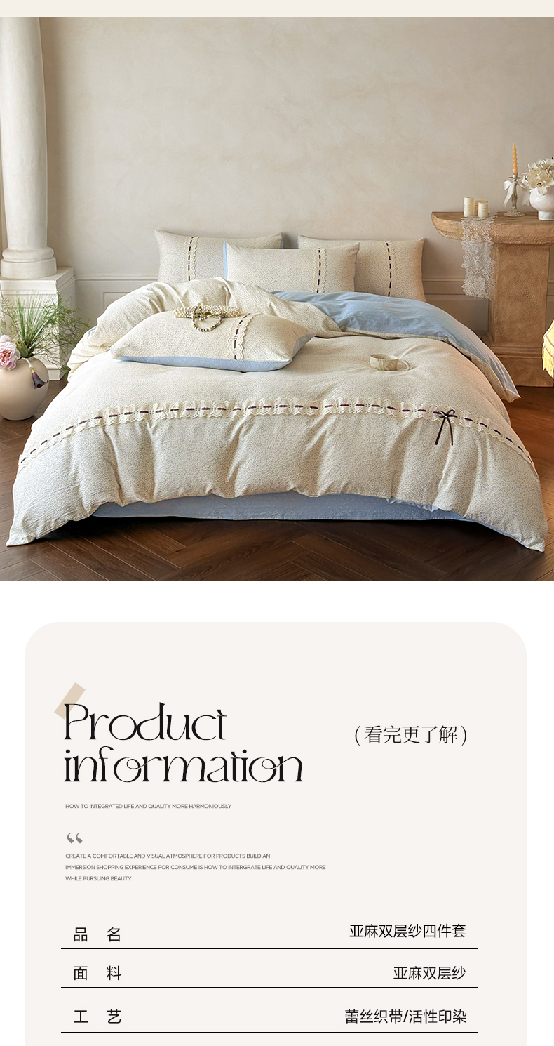 商品名称:遇见家居生活馆 2025新款亚麻双层纱四件套-叶知秋(小号108 标准128,加大138) 叶知秋-蓝色