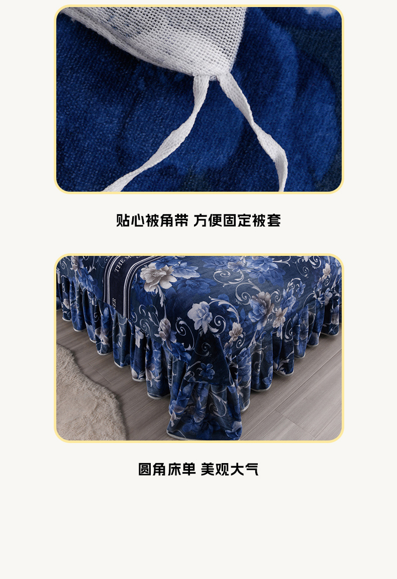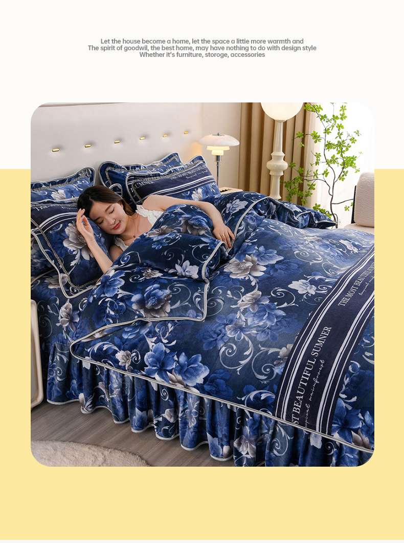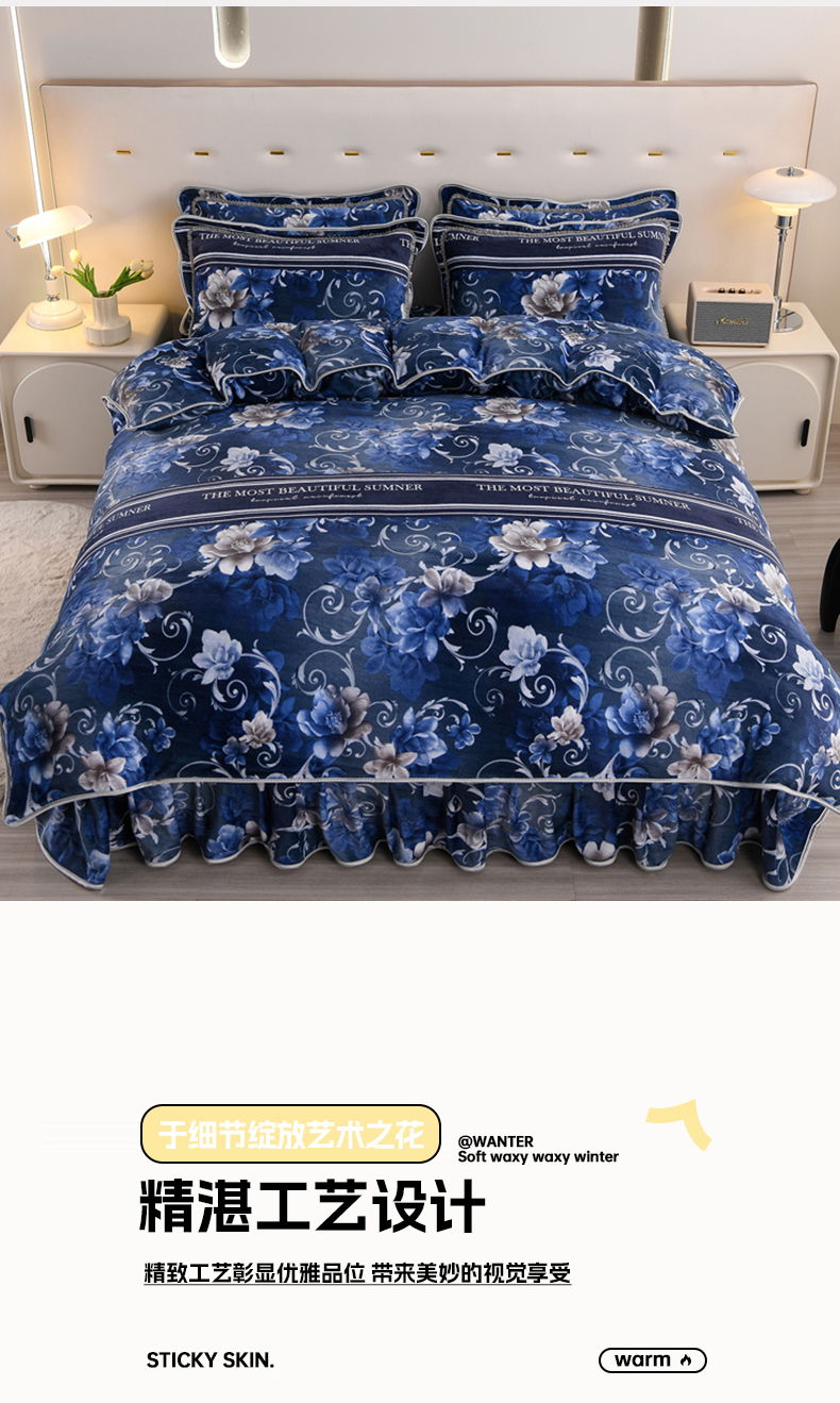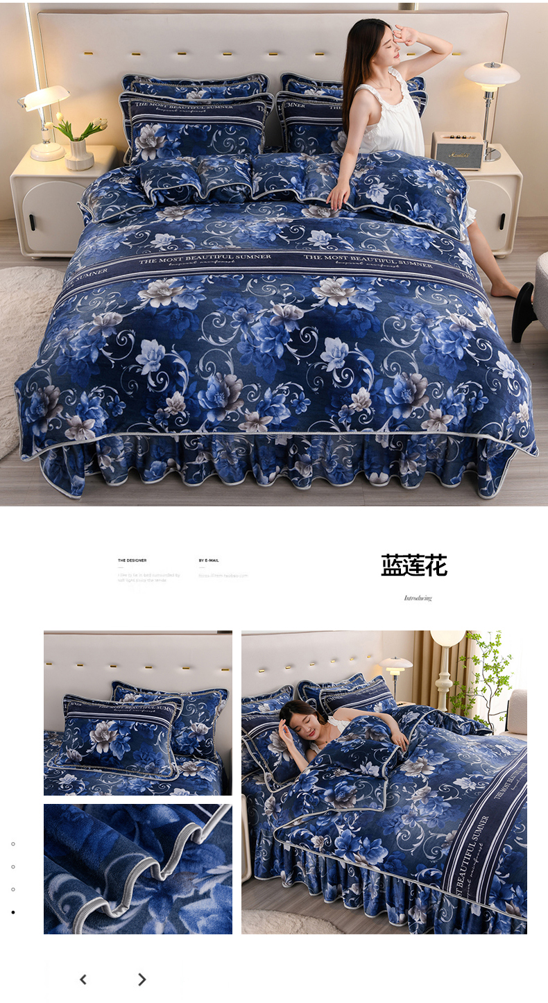 当前位置: 91家纺网 > 商品网购 > 床品套件 > 四件套 > 牛奶绒四件套 > 晚静 2025新款7斤牛奶绒四件套金貂法莱绒床裙款保暖绒三件套 蓝莲花