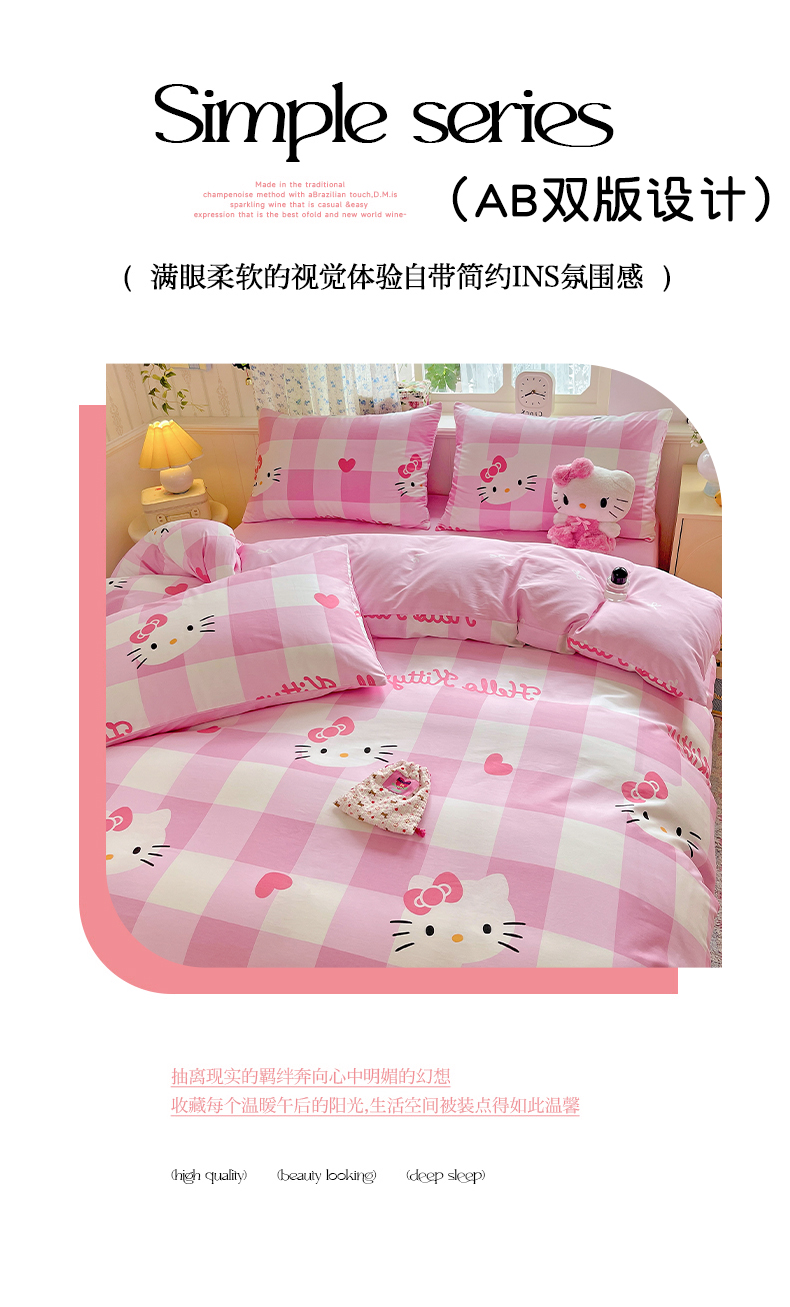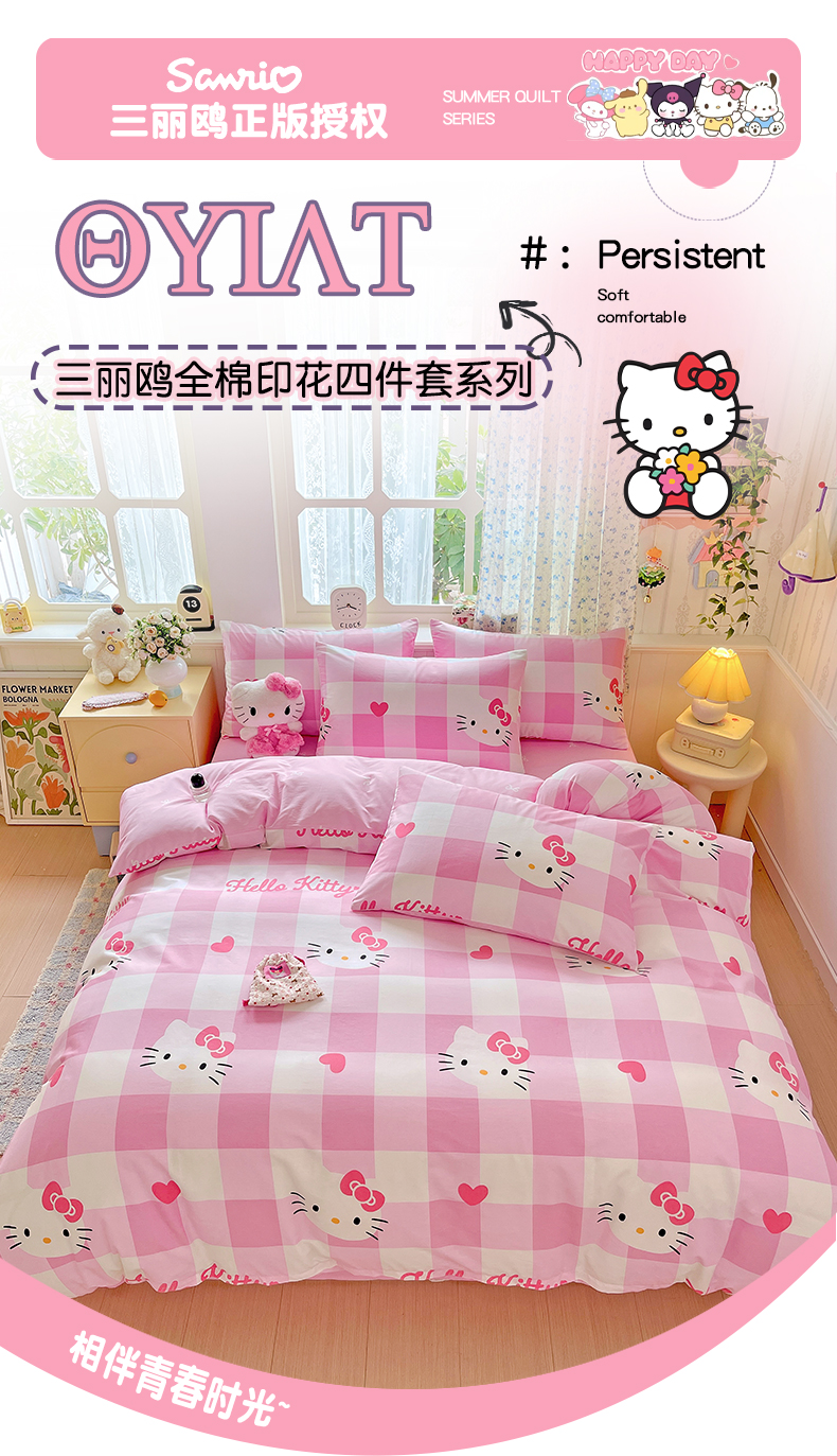(总)朵希曼 2026新款三丽鸥全棉印花四件套系列,点点美乐蒂,红格凯蒂,蘑菇凯蒂,甜甜凯蒂,晚安大耳狗,樱桃凯蒂,元气美乐蒂,运动凯蒂