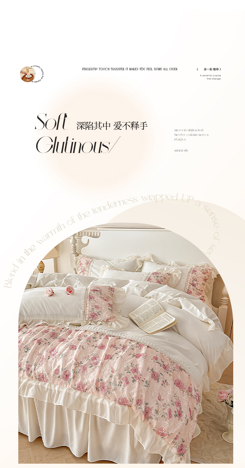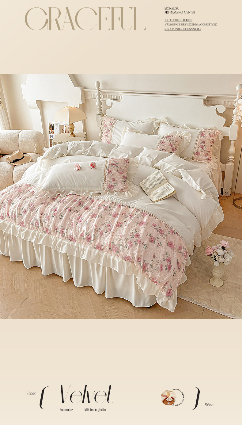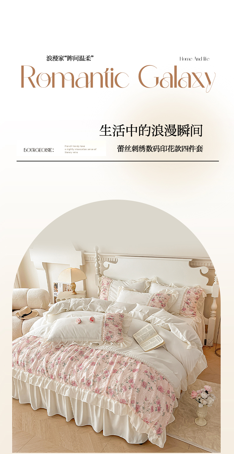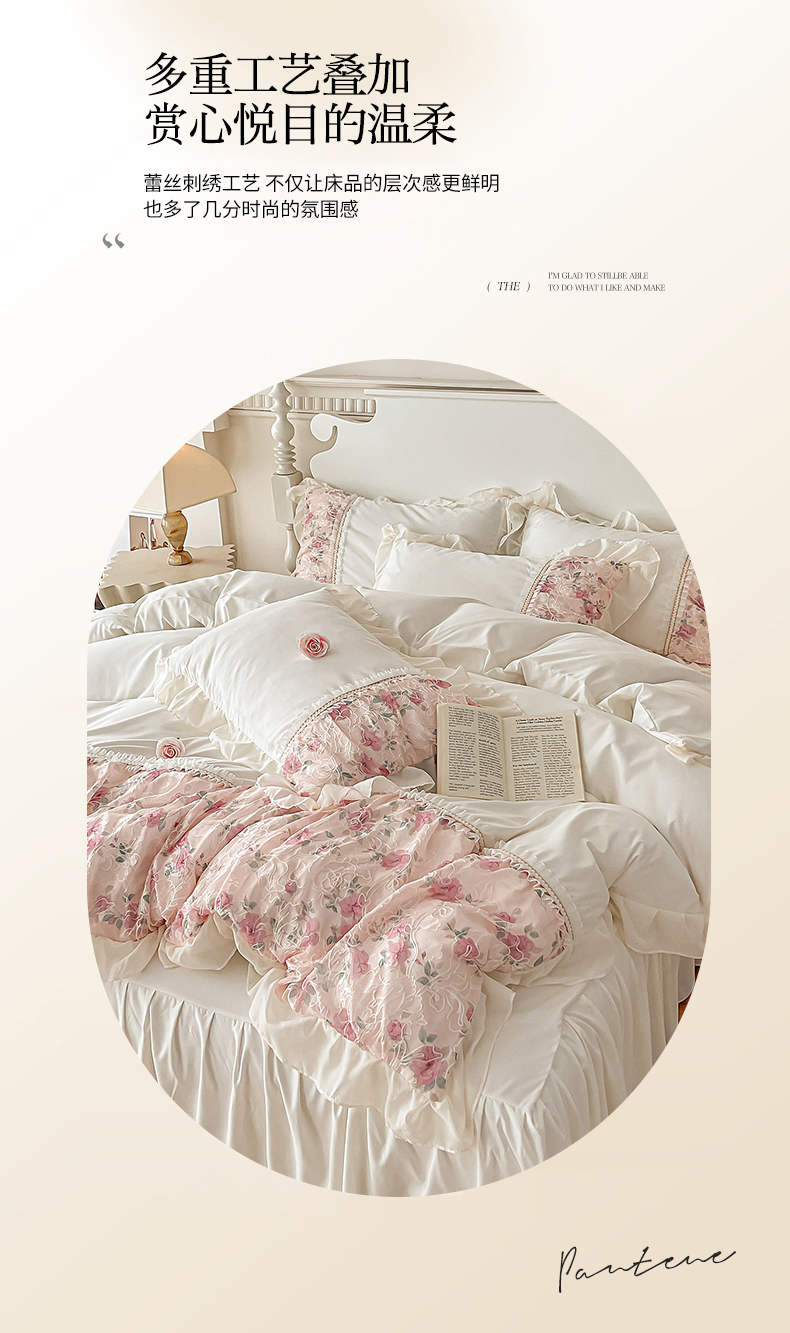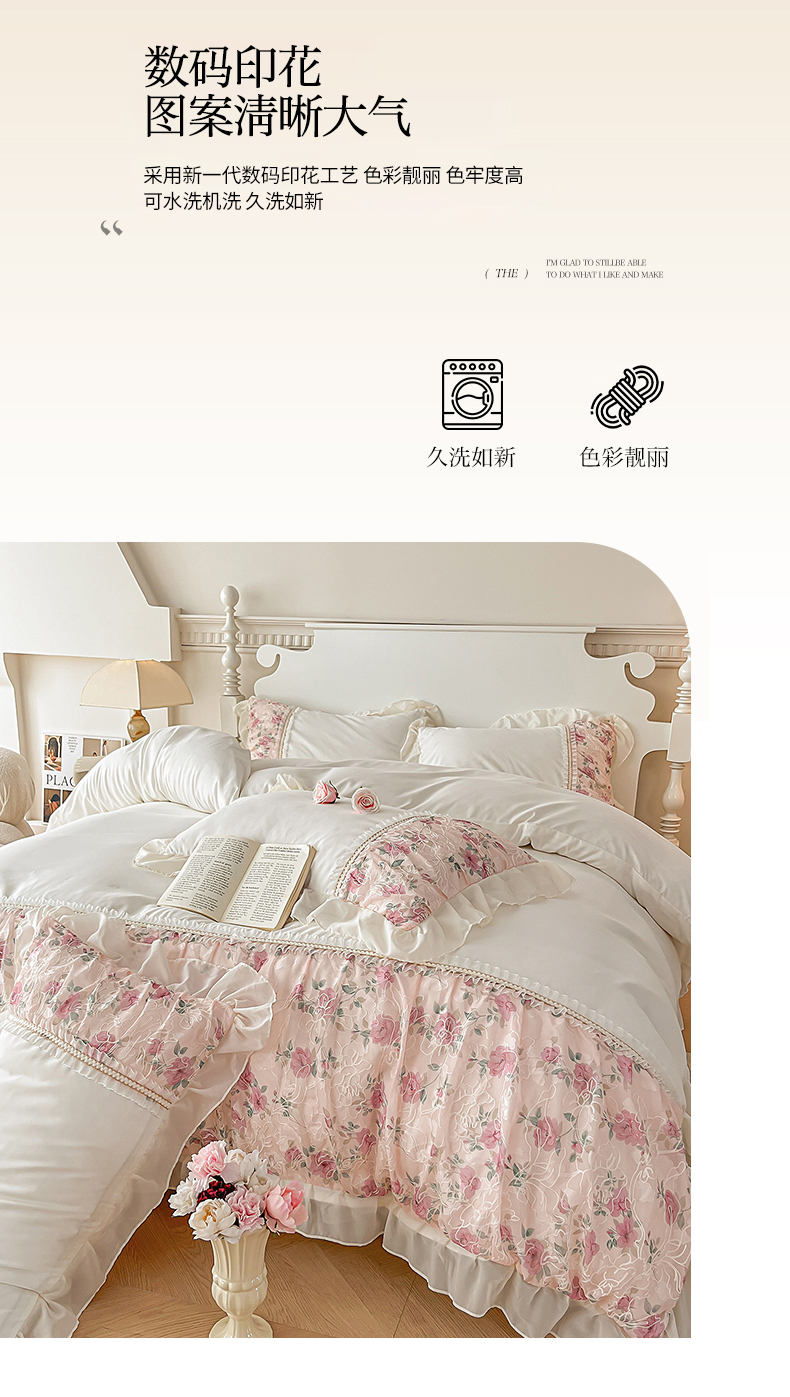 (总)富宁家纺 2025新款蕾丝刺绣数码印花款四件套-浅影玫瑰