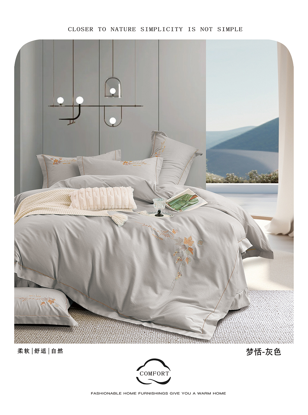商品名称:绒博士 2025新款全棉磨毛绣花宽边款四件套--梦恬系列 梦恬-灰色