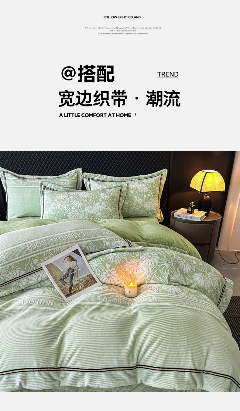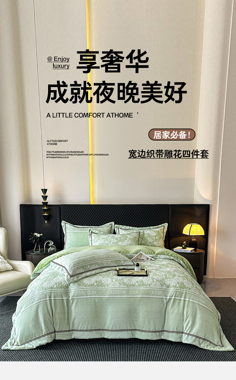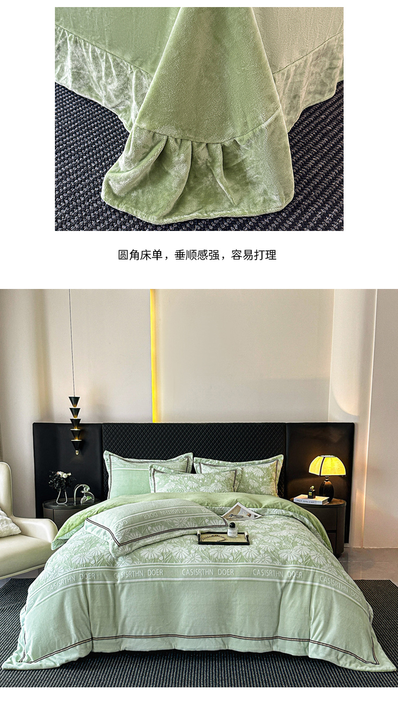 商品名称:诺梵家纺 2025新款8.2斤宽边织带雕花绒牛奶绒四件套 清雅-绿