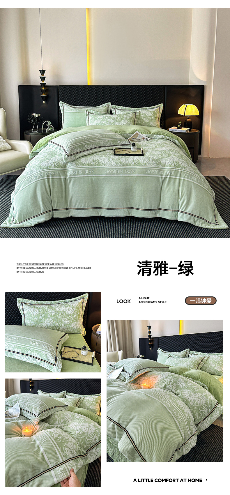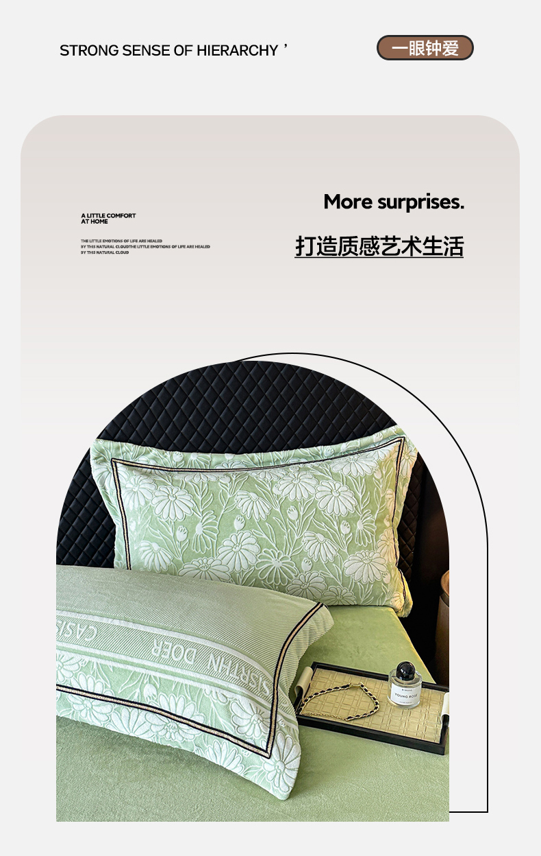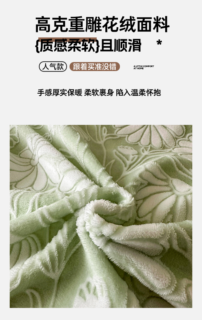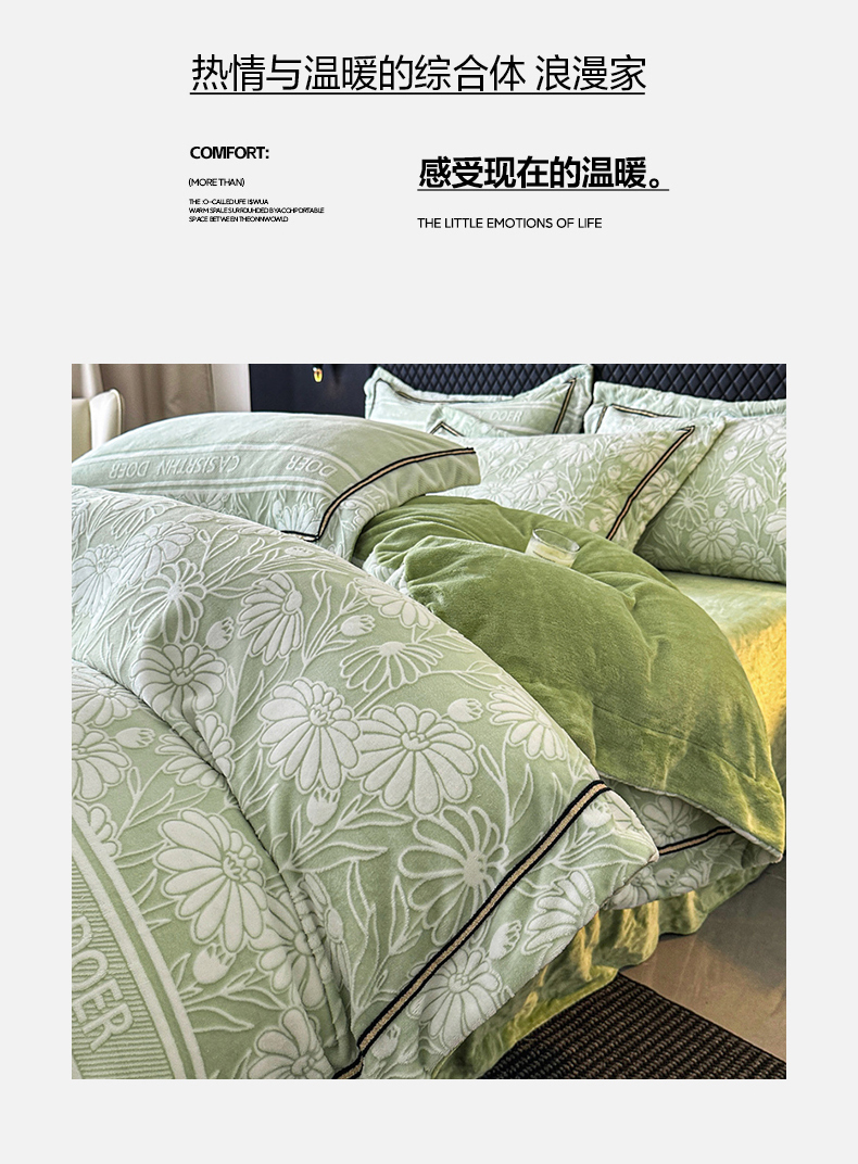 商品名称:诺梵家纺 2025新款8.2斤宽边织带雕花绒牛奶绒四件套 清雅-绿