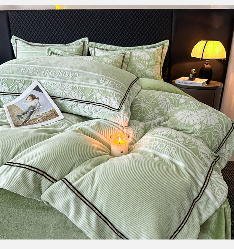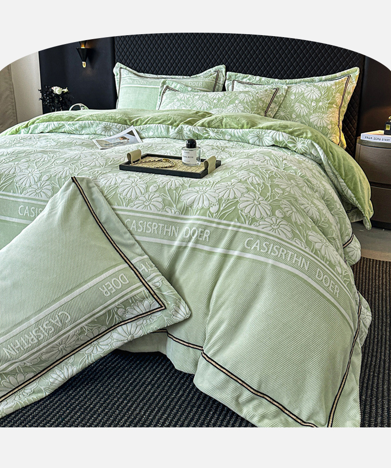 诺梵家纺 2025新款8.2斤宽边织带雕花绒牛奶绒四件套 清雅-绿