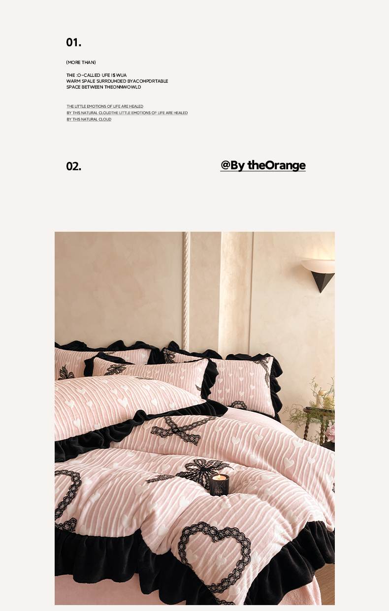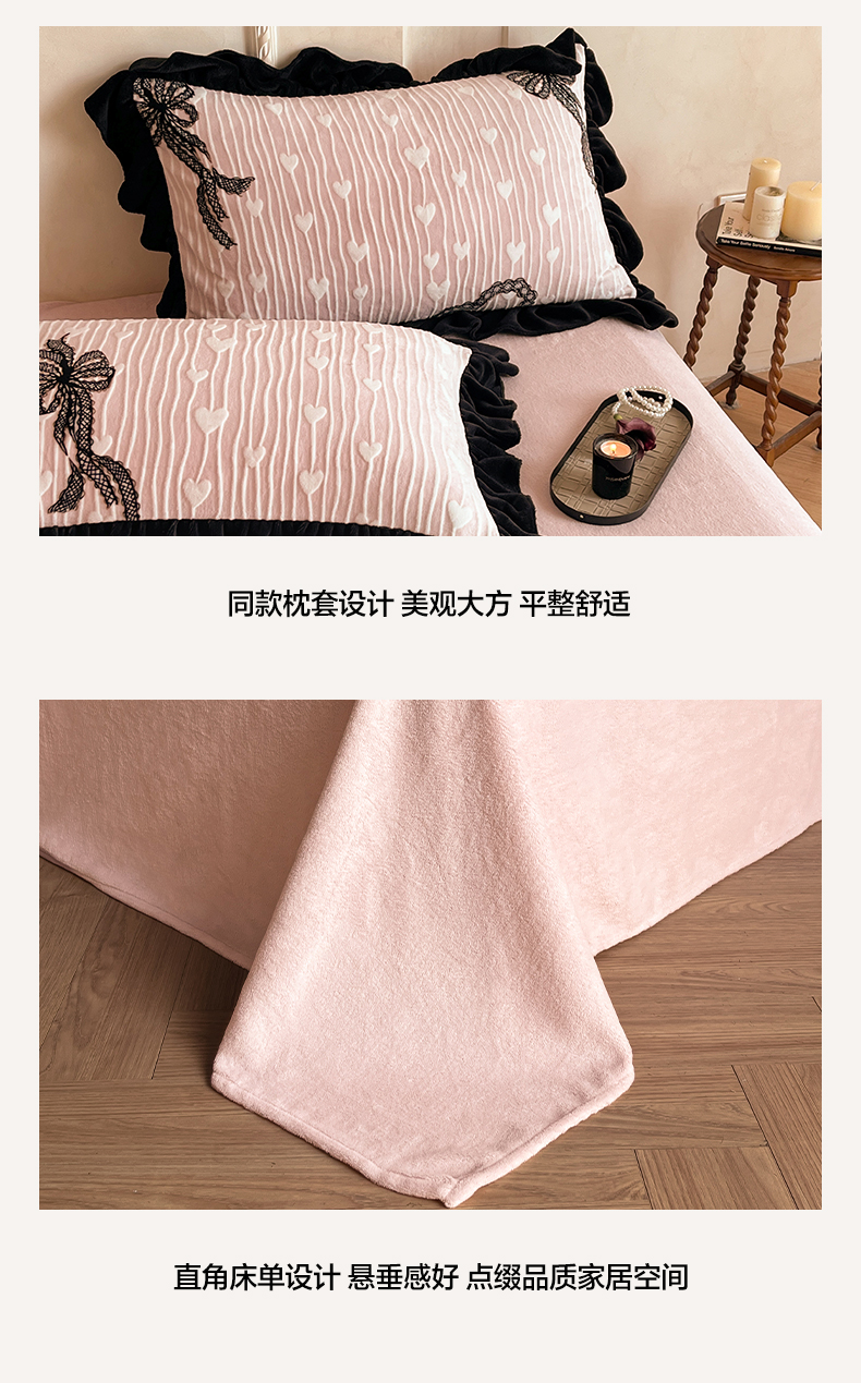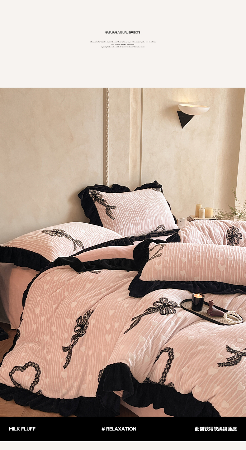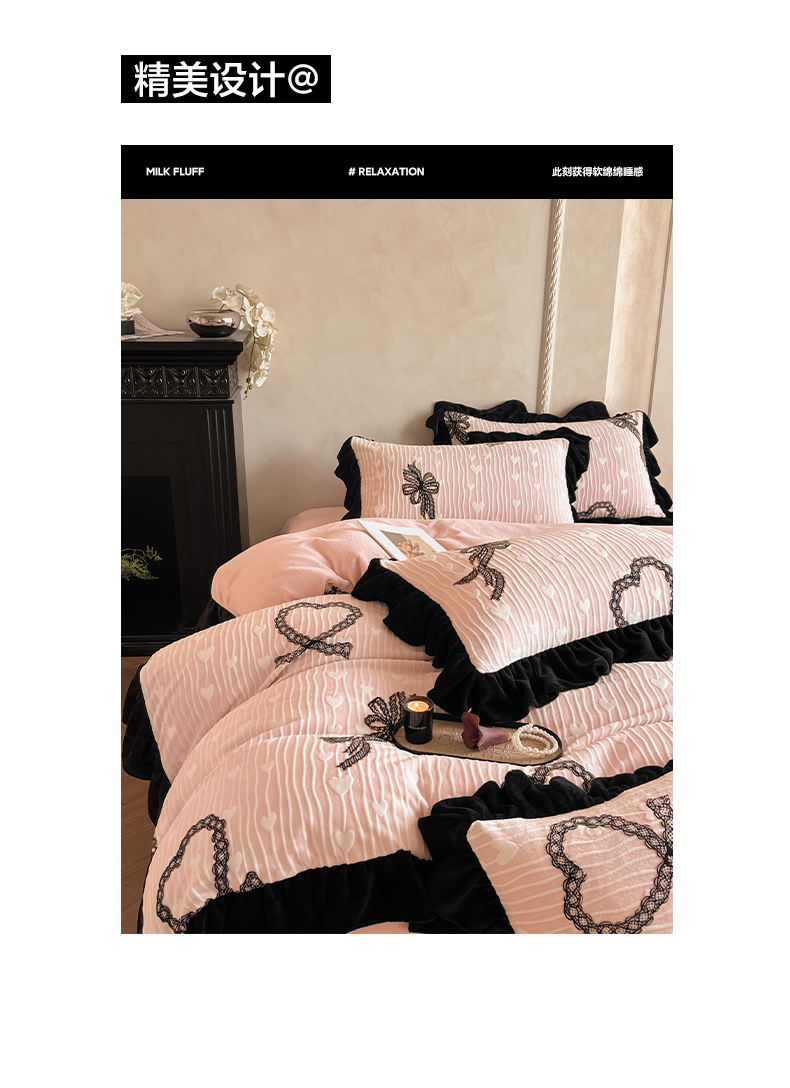 商品名称:索飞特家纺 2025新款秋冬赫本风牛奶绒彩印黑边四件套 挚爱-粉