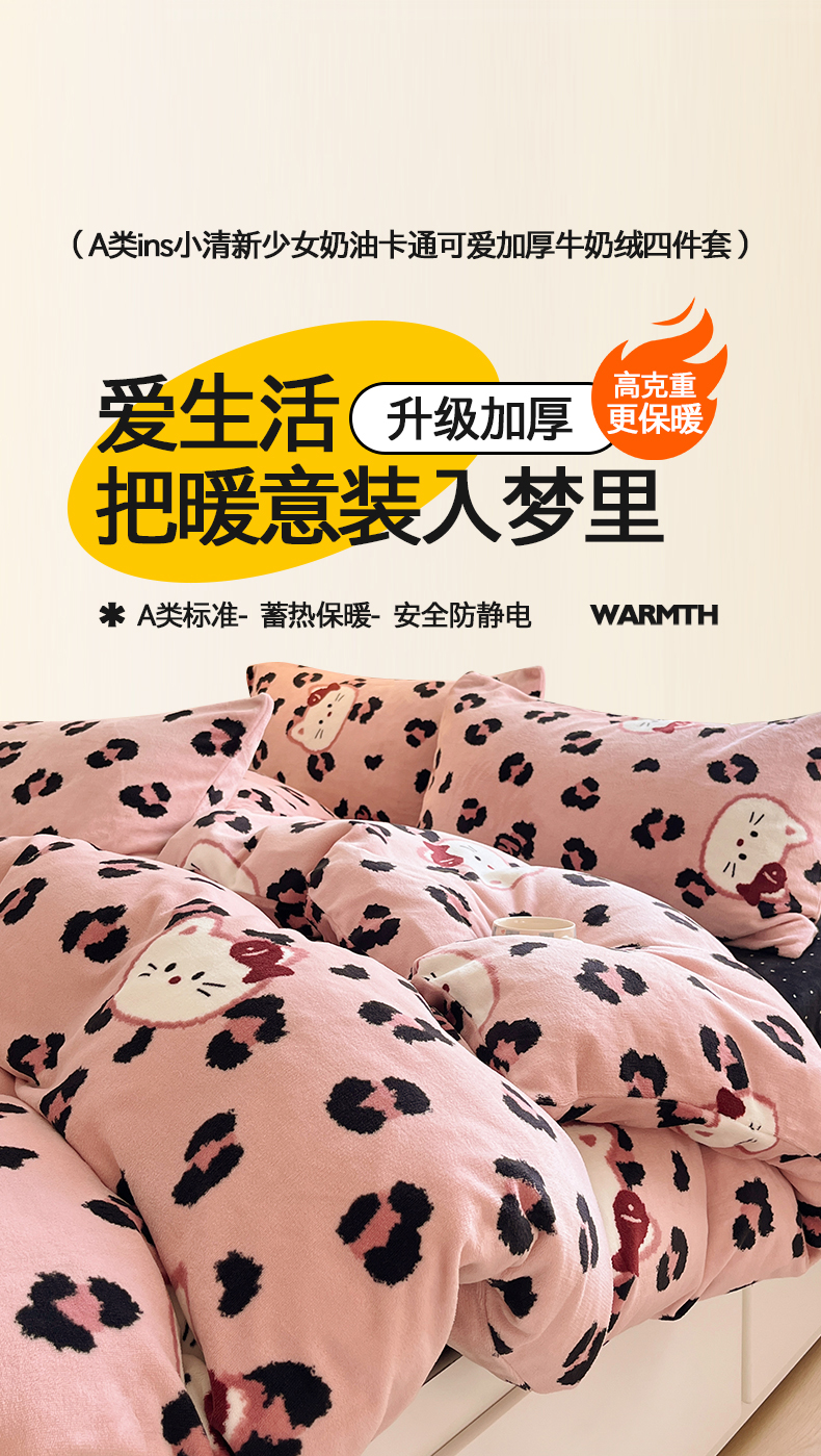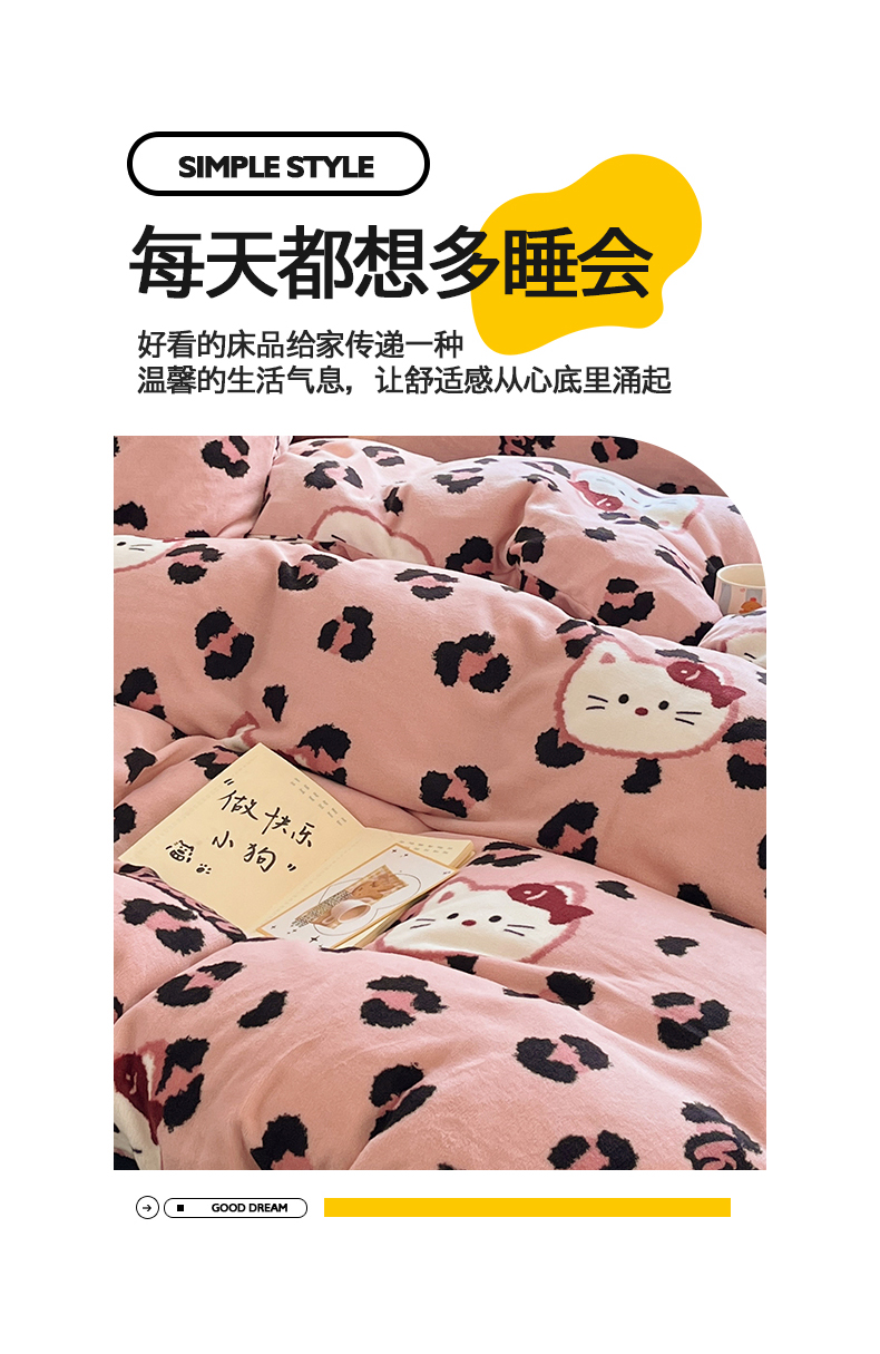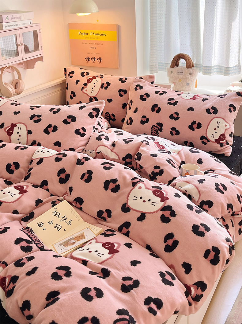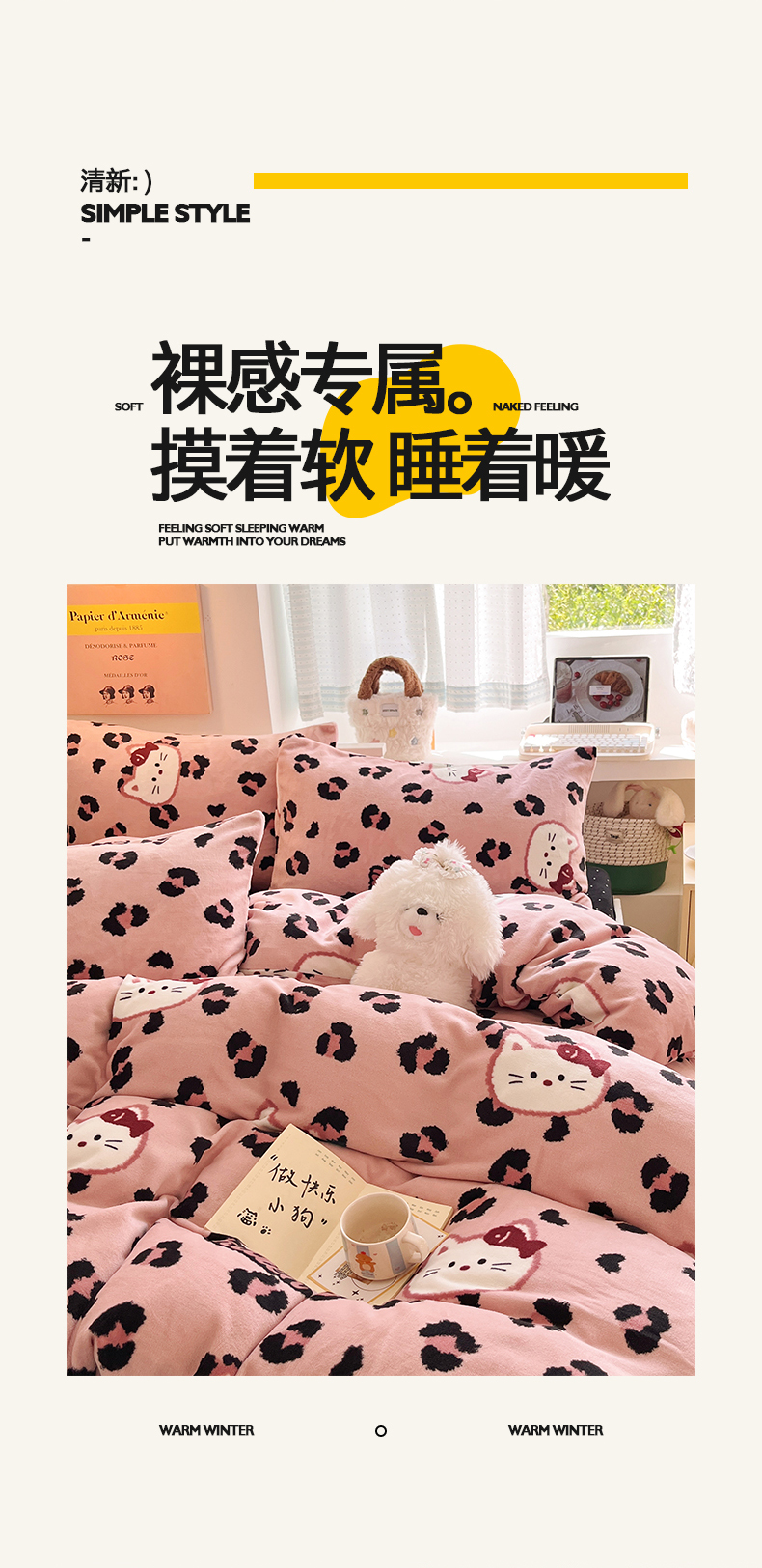 金爱家 2025新款A类ins小清新少女奶油卡通可爱加厚牛奶绒四件套 绒-豹点点粉猫