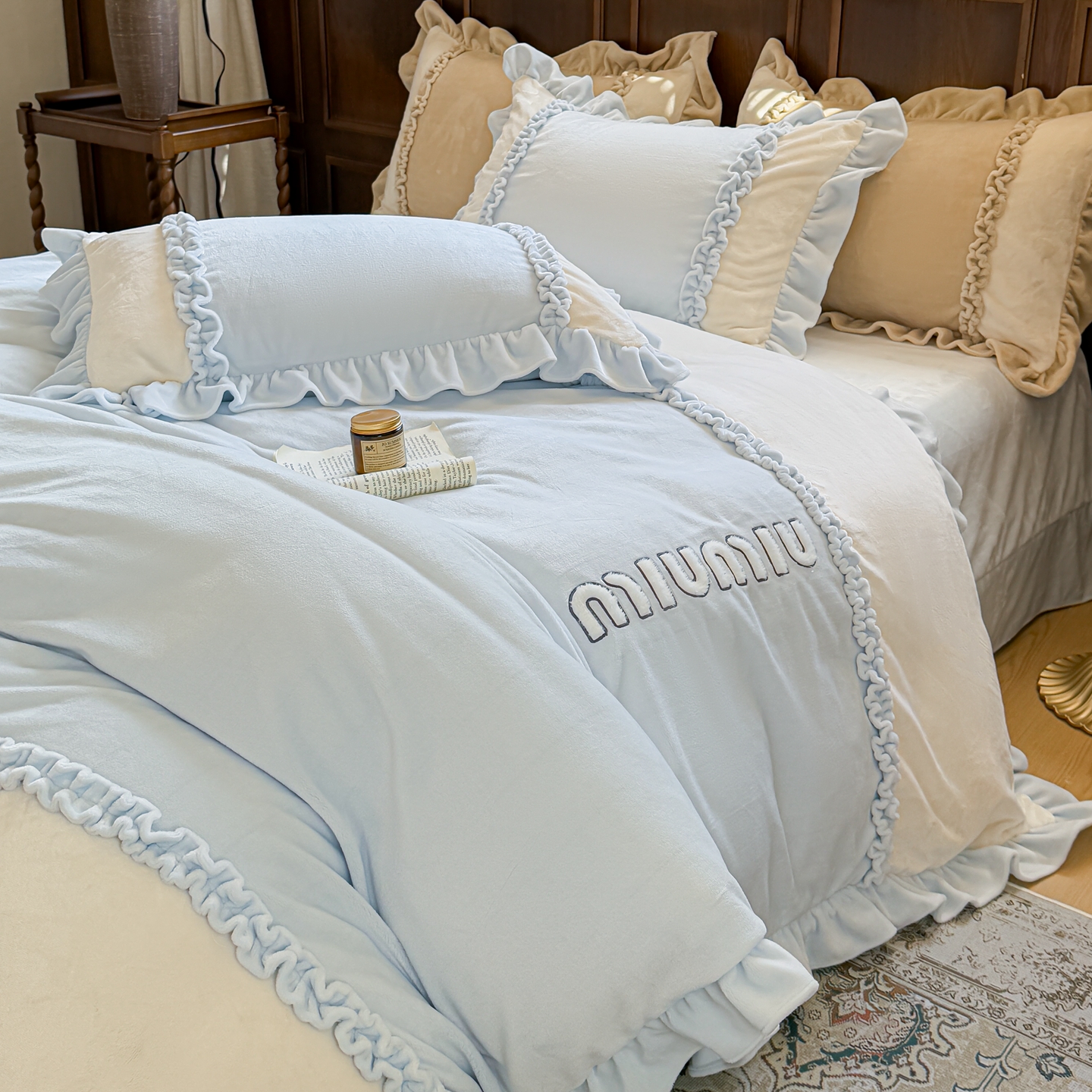 商品名称:阿那亚 2025新款加厚煦暖绒牛奶绒四件套韩版花边四件套刺绣四件套 伊贝浅蓝