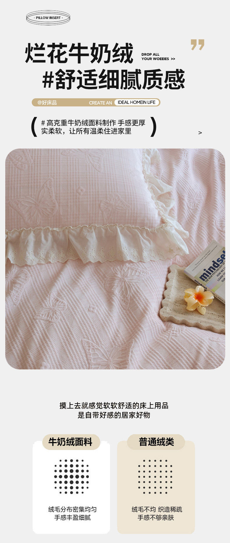 万盛家纺 2025新款韩版牛奶绒花边四件套-翩翩蝴蝶 翩翩蝴蝶 粉色