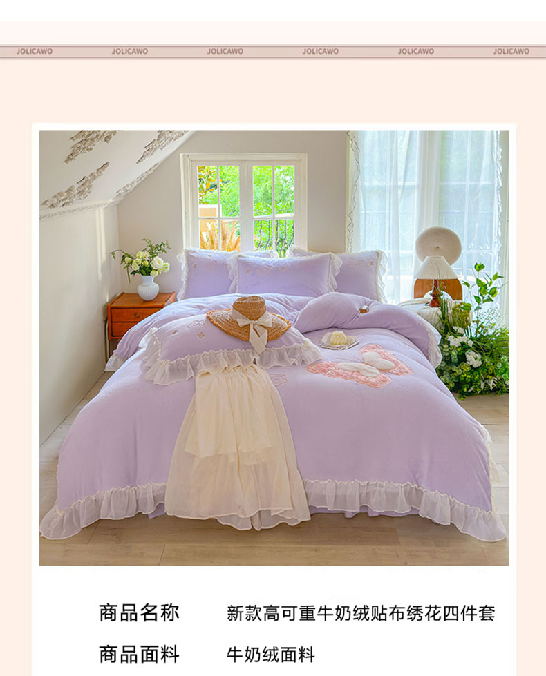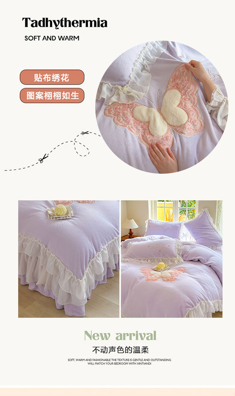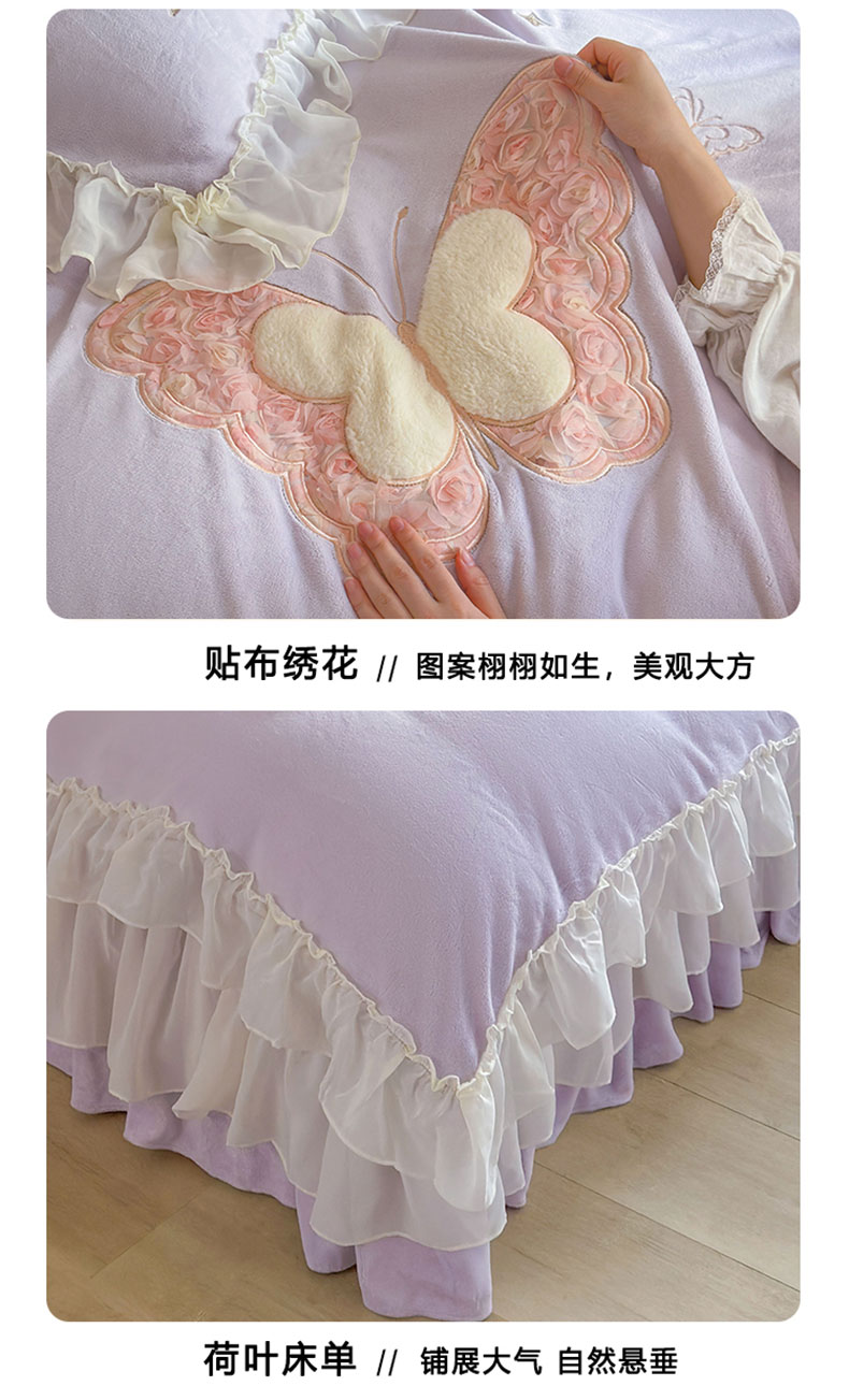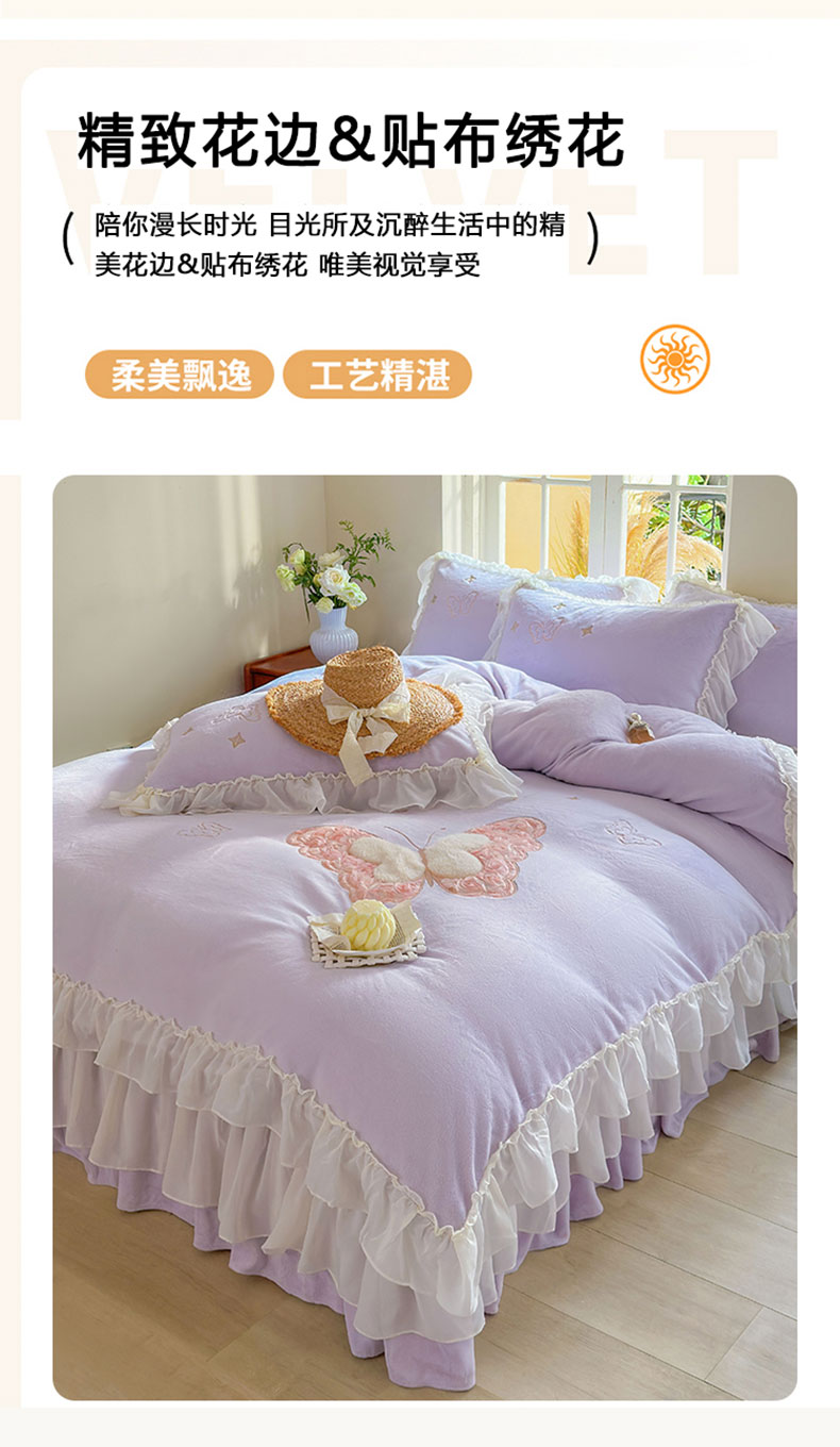 商品名称:美洲琳 2025新款高克重全消光贴布绣花牛奶绒四件套 蝴蝶-芋紫