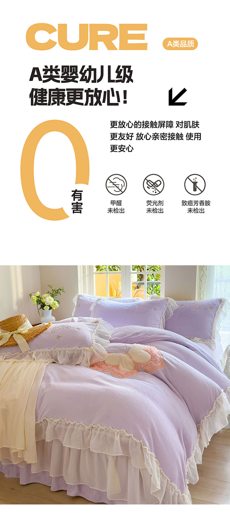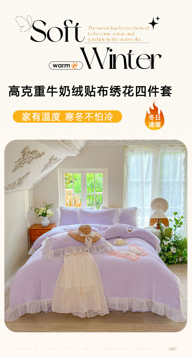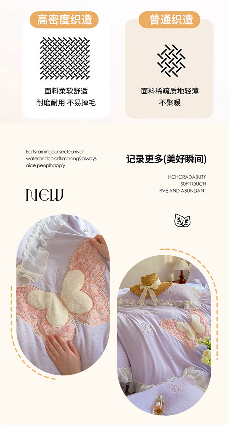 商品名称:美洲琳 2025新款高克重全消光贴布绣花牛奶绒四件套 蝴蝶-芋紫