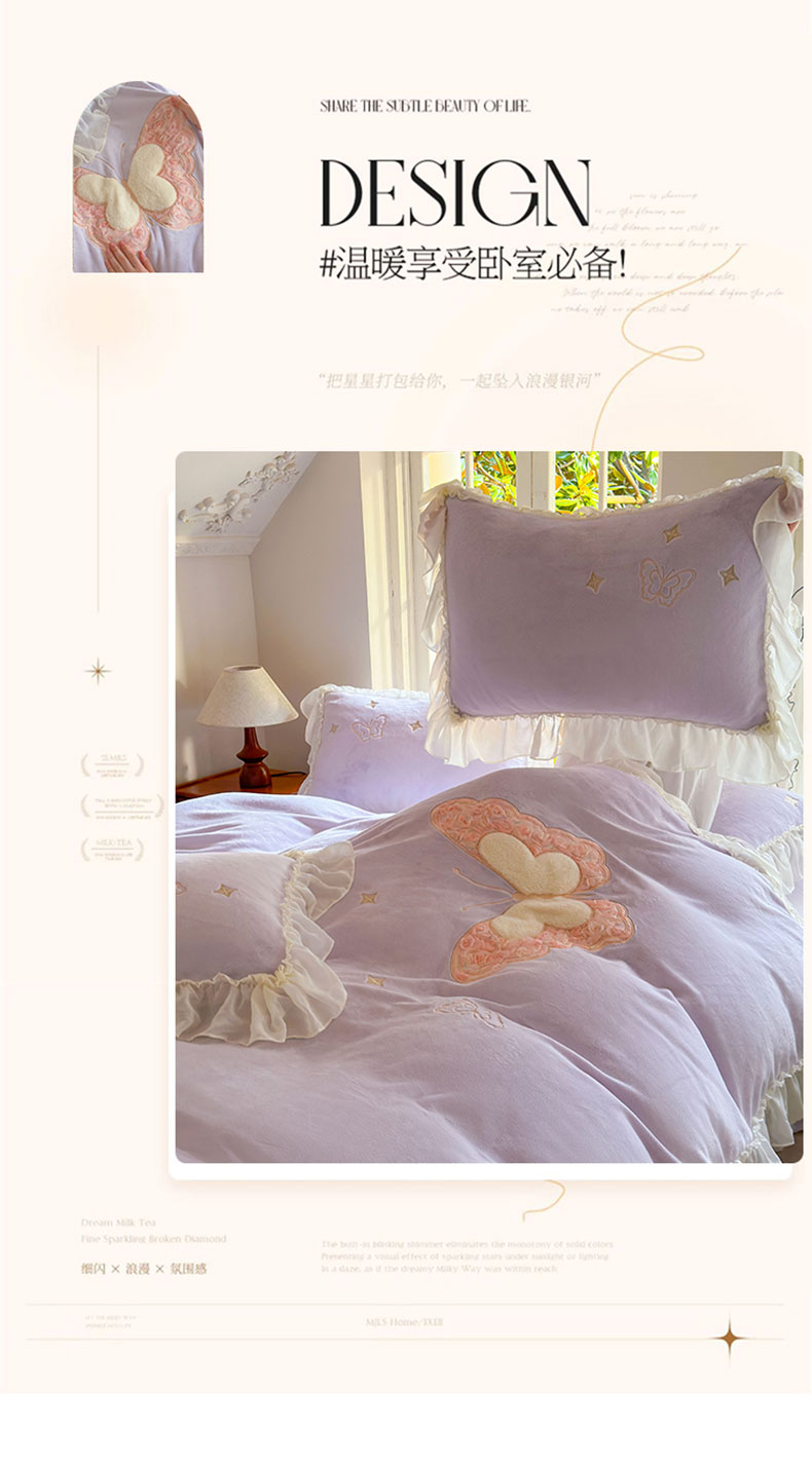 美洲琳 2025新款高克重全消光贴布绣花牛奶绒四件套 蝴蝶-芋紫