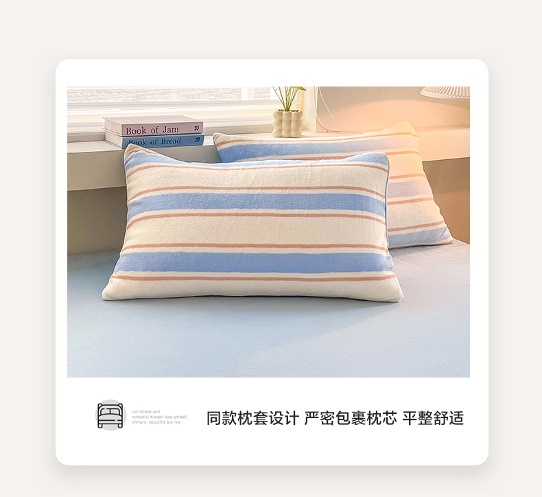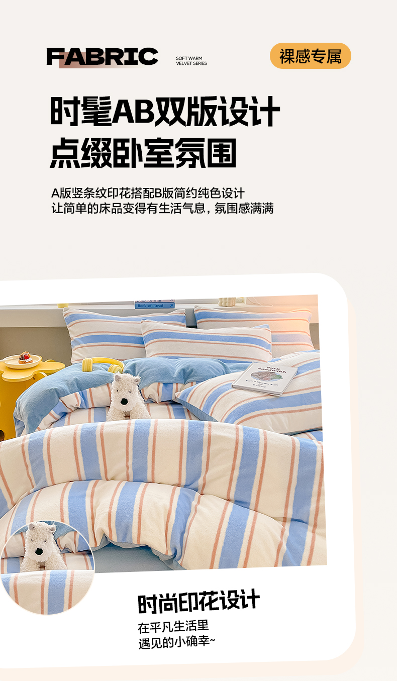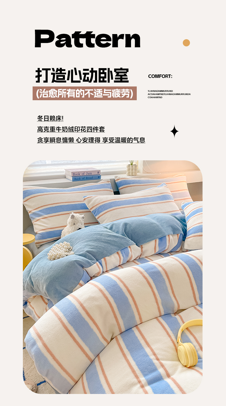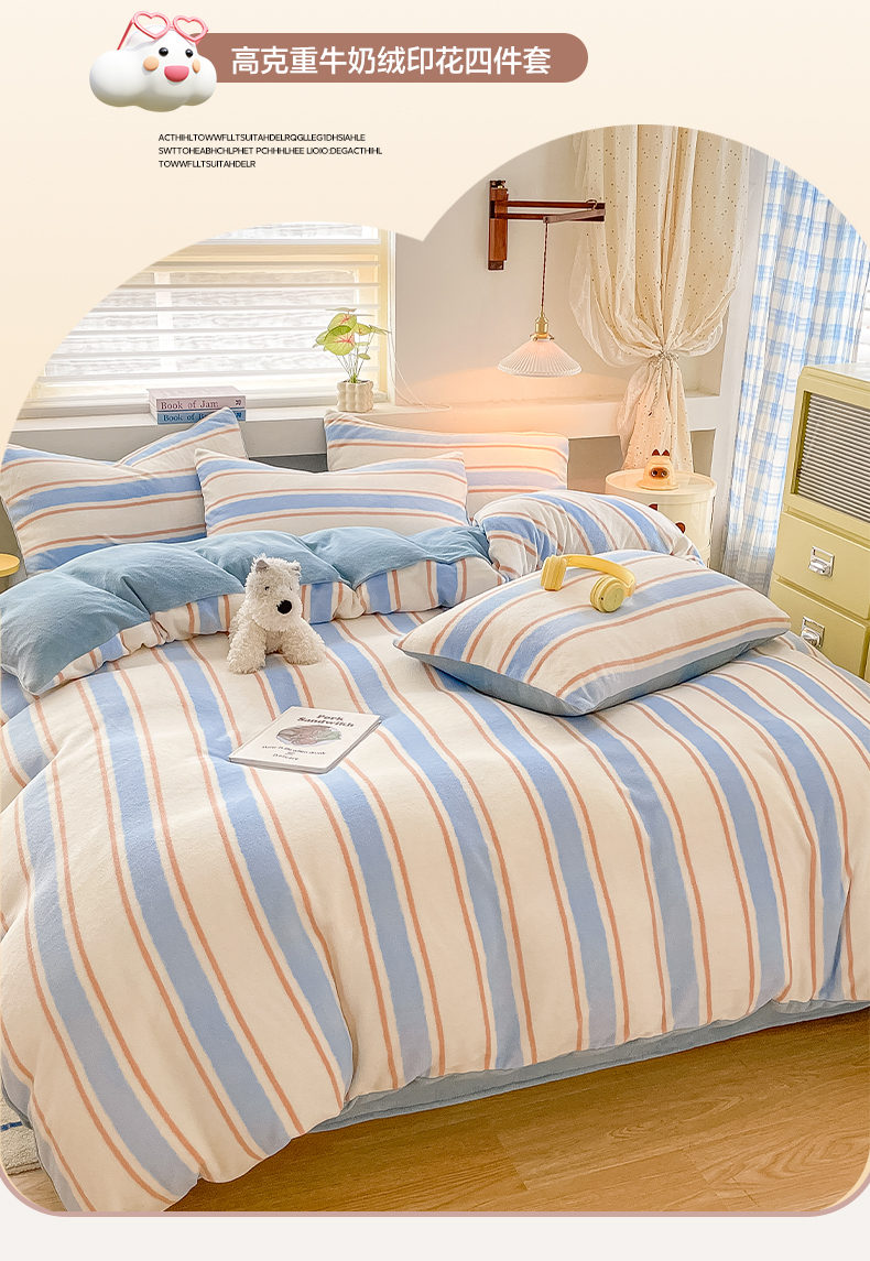 当前位置: 91家纺网 > 商品网购 > 床品套件 > 四件套 > 牛奶绒四件套 > 雅居纺家纺 2025新款高克重牛奶绒印花四件套 蓝色竖条