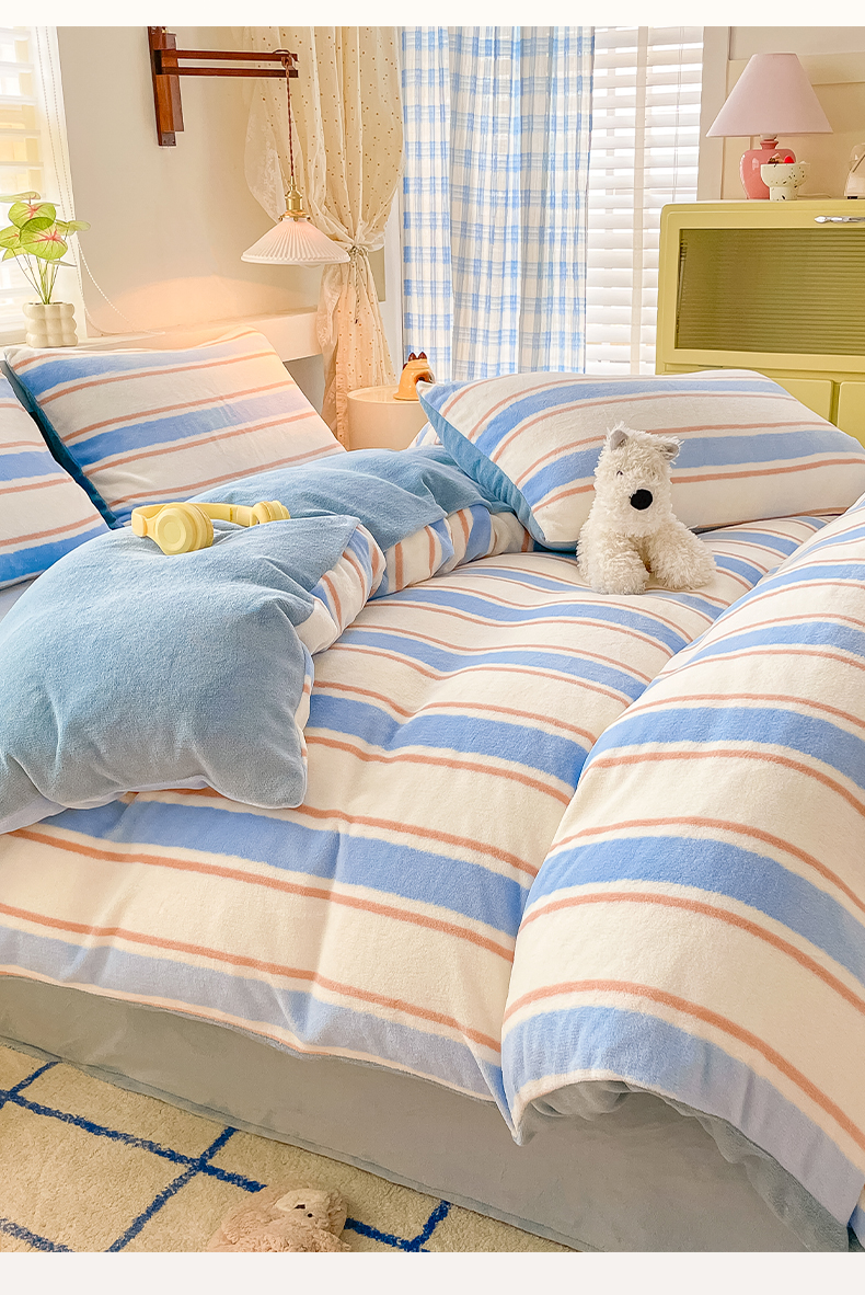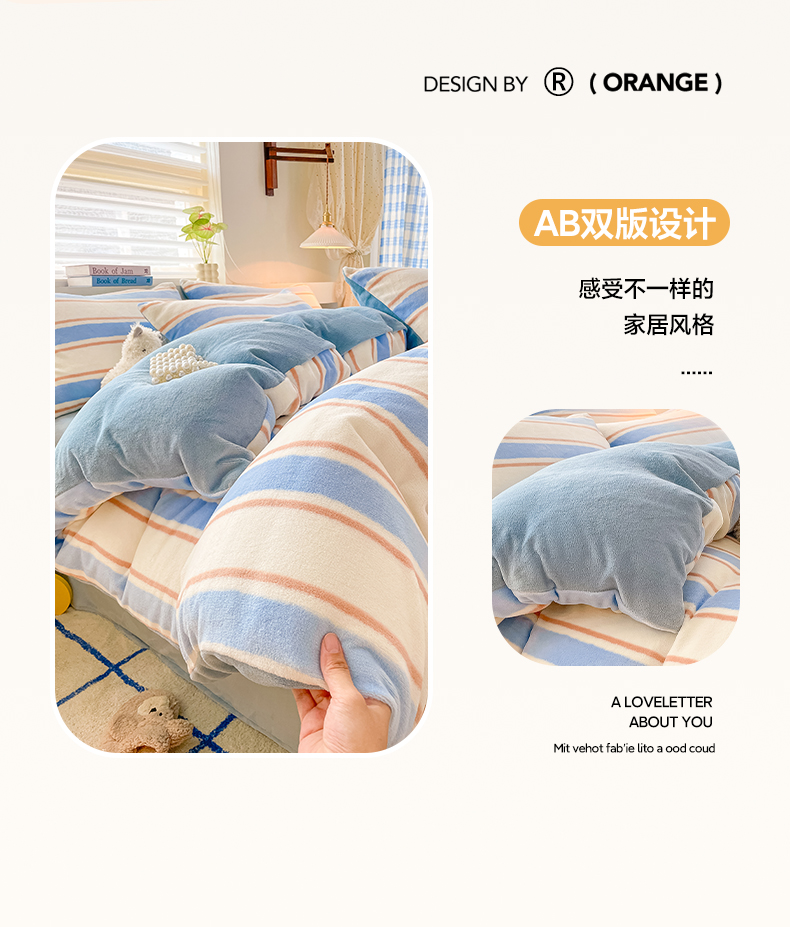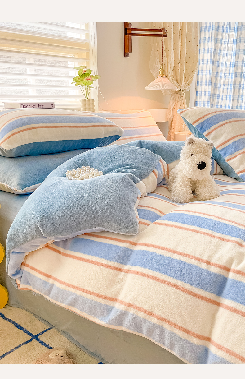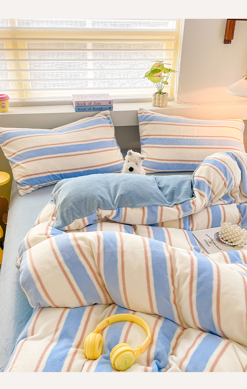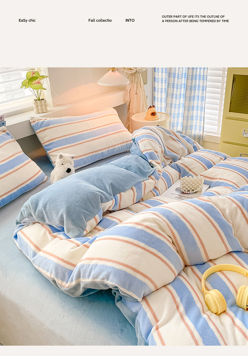 当前位置: 91家纺网 > 商品网购 > 床品套件 > 四件套 > 牛奶绒四件套 > 雅居纺家纺 2025新款高克重牛奶绒印花四件套 蓝色竖条