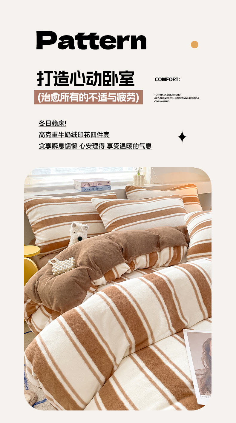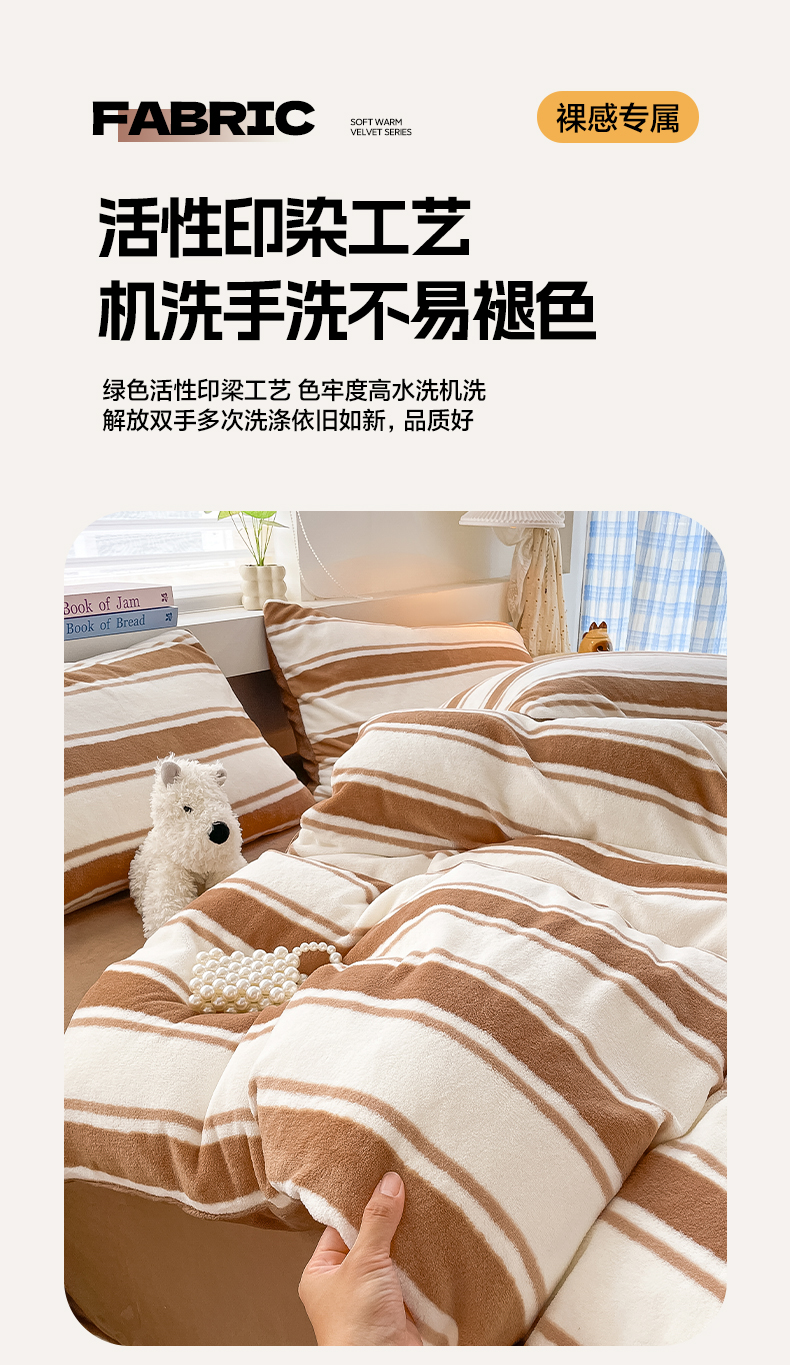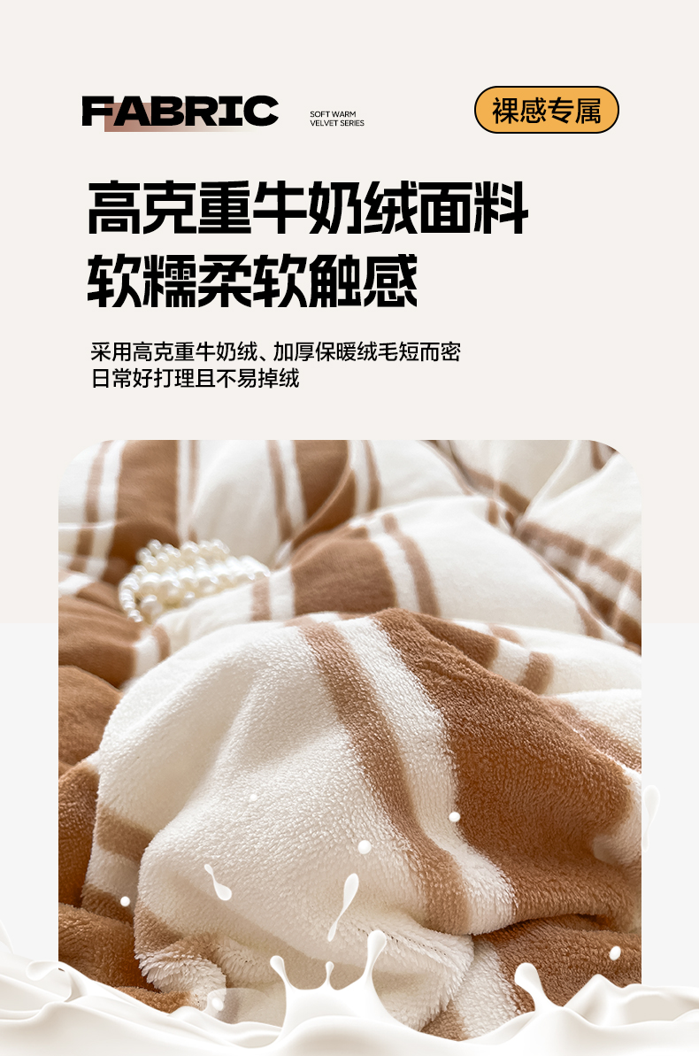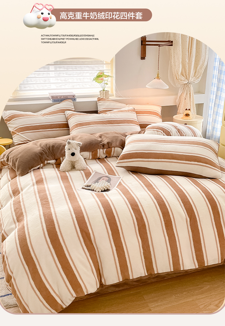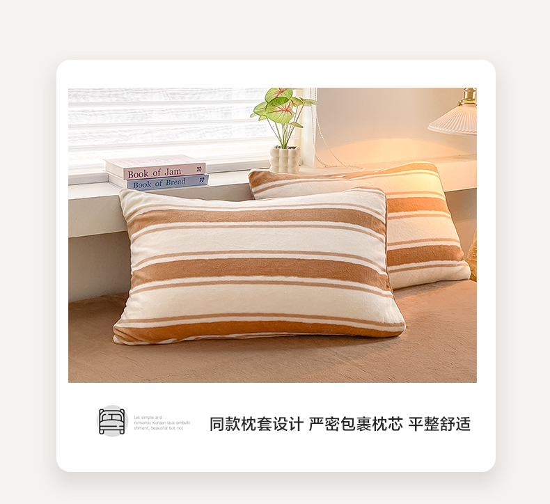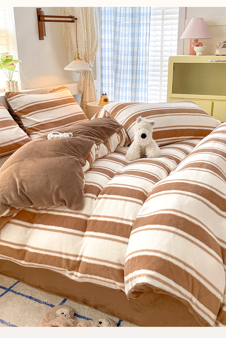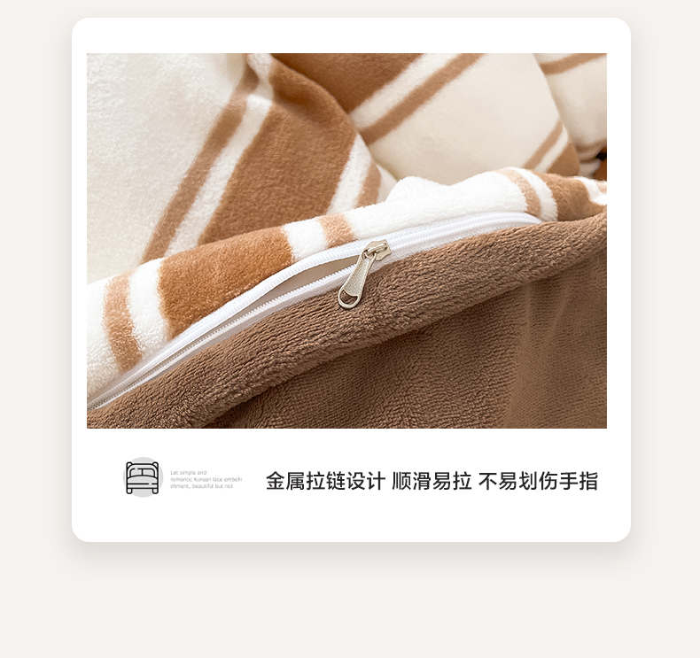 商品名称:雅居纺家纺 2025新款高克重牛奶绒印花单被套 咖色竖条