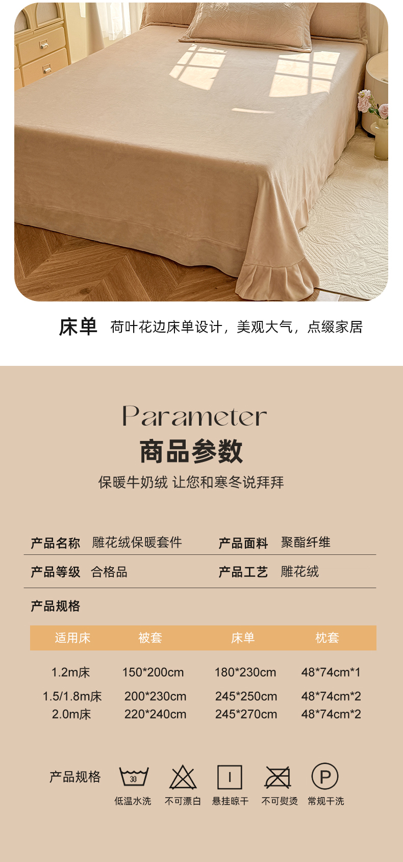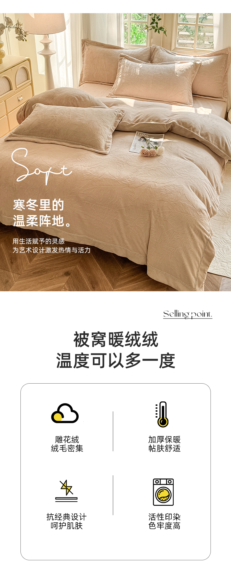商品名称:艾唯希家纺 2025新款全消光雕花绒织带款四件套牛奶绒-雕花织带系列 花之蔓-驼
