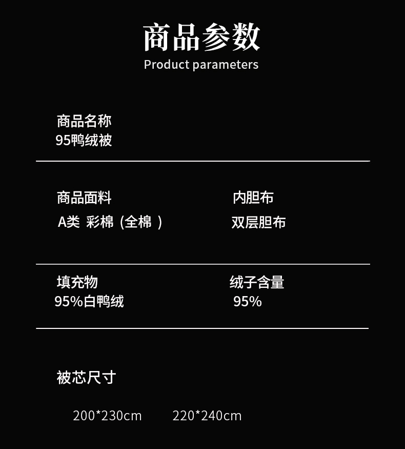 95白鸭绒 200-230 填充900克 春秋被 | ¥960.00 |