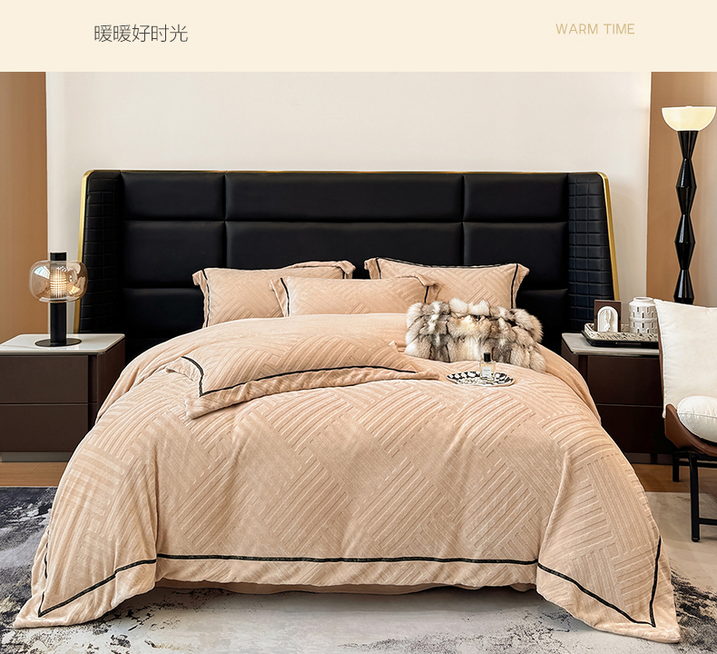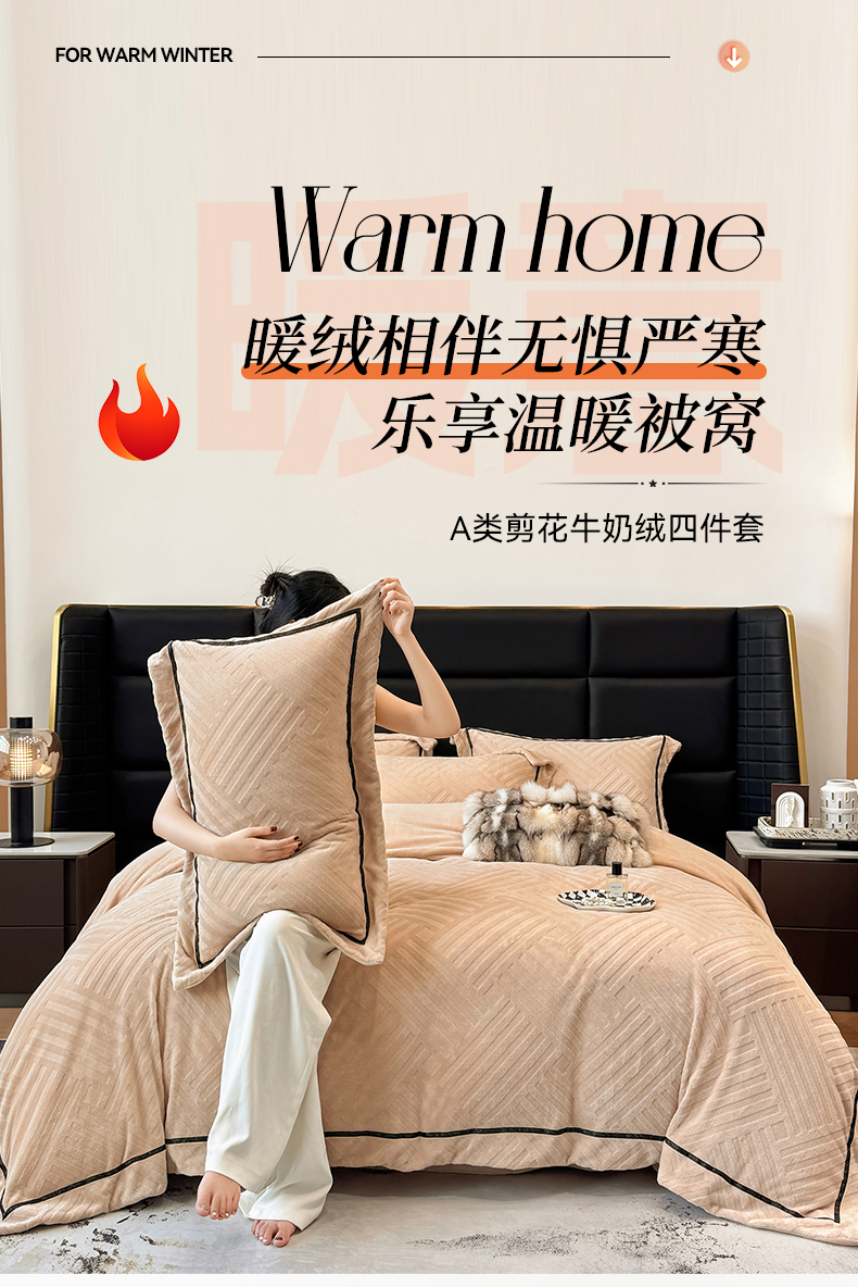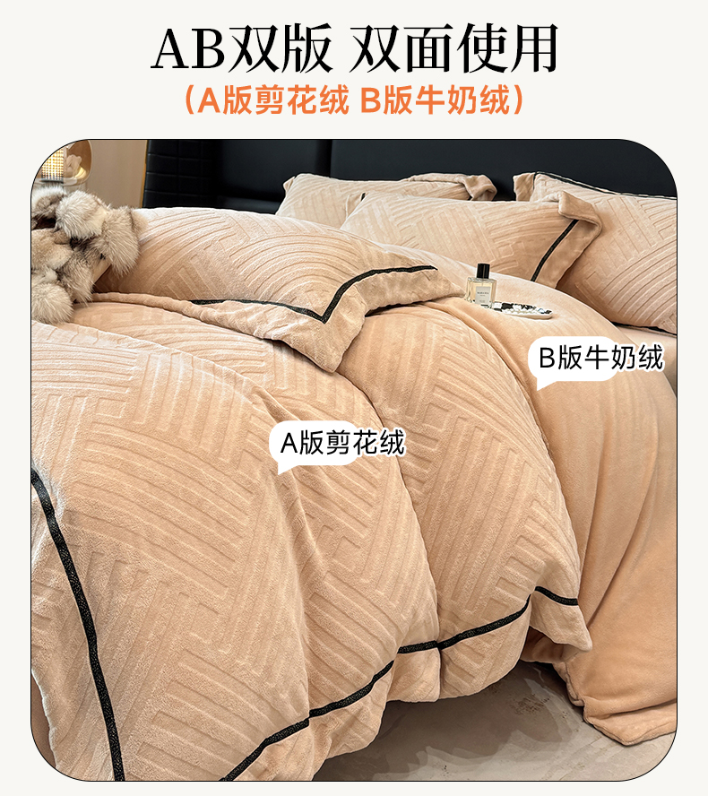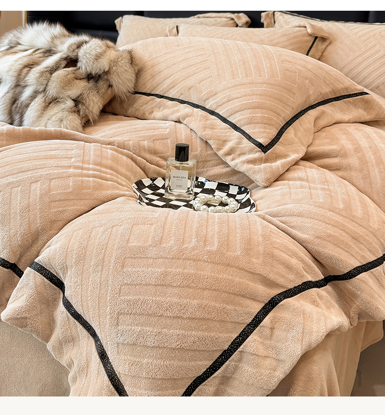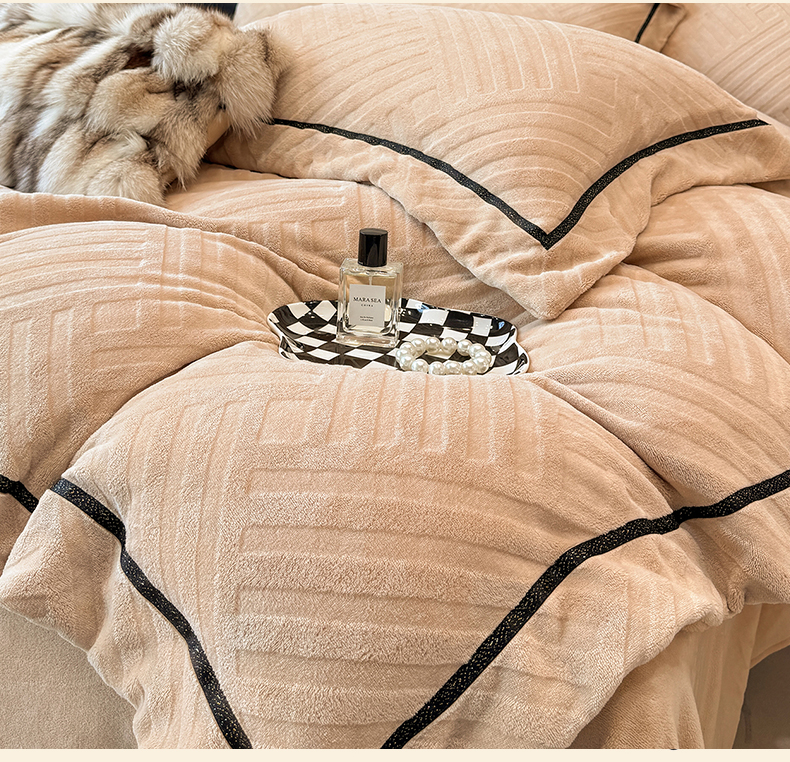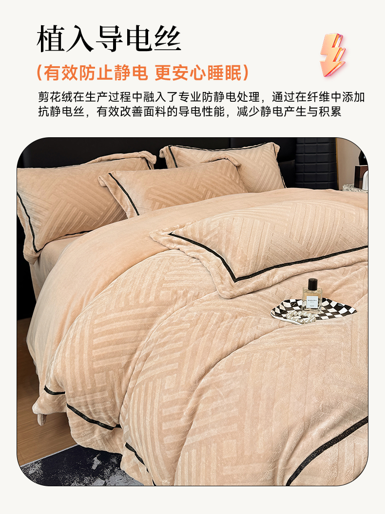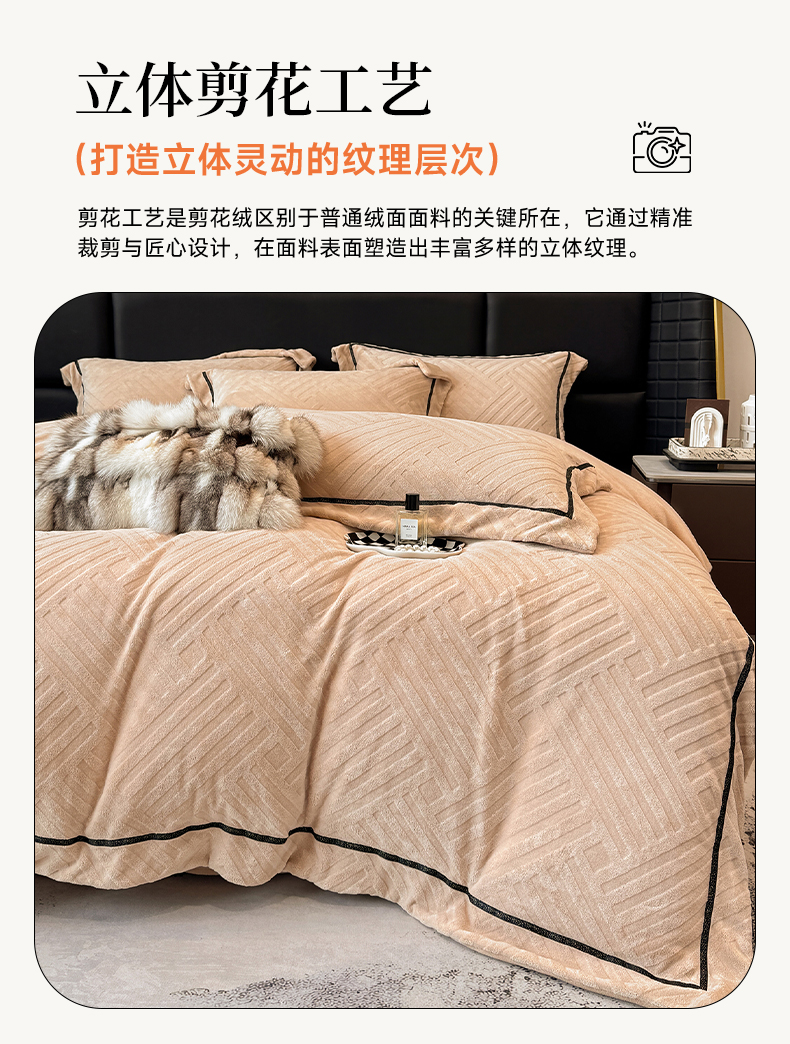 商品名称:家居1号家纺 2025新款230克全消光牛奶绒剪花四件套-暖意 暖意-香槟金