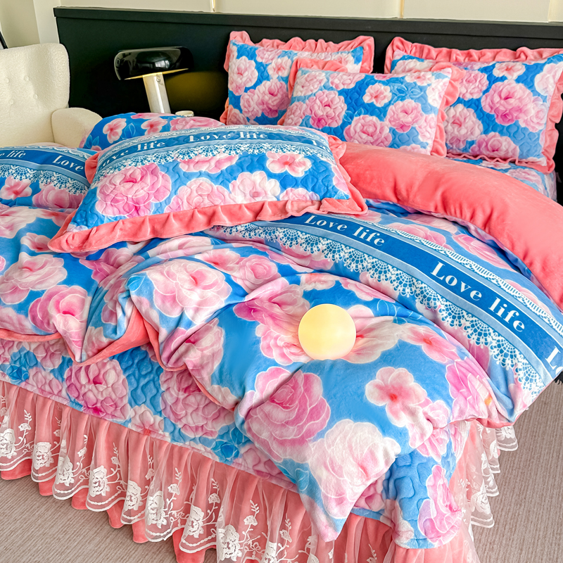商品名称:(总)首选家纺 2025新款直播热款双层蕾丝花边牛奶绒印花床盖四件套床盖单件三件套