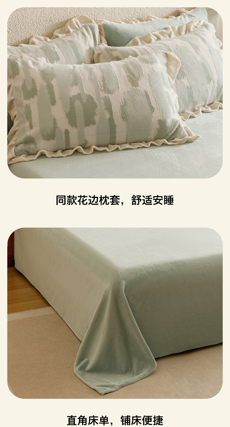 当前位置: 91家纺网 > 商品网购 > 床品套件 > 四件套 > 牛奶绒四件套 > 趣色家纺 2025秋冬新款韩风小清新花边牛奶绒立体烂花四件套 奇想-绿