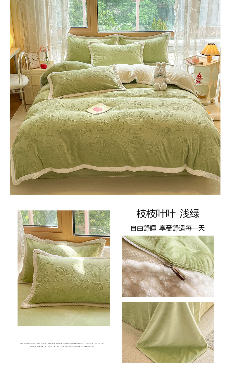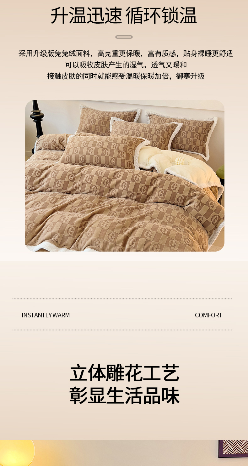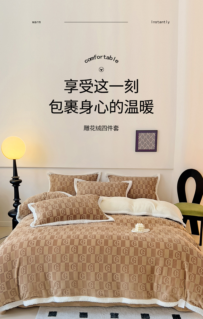 当前位置: 91家纺网 > 商品网购 > 床品套件 > 四件套 > 其它四件套 > 琪格格纺织 2025新款全消光包边立体简约清新雕花绒四件套 包边绒 麦格娅 咖