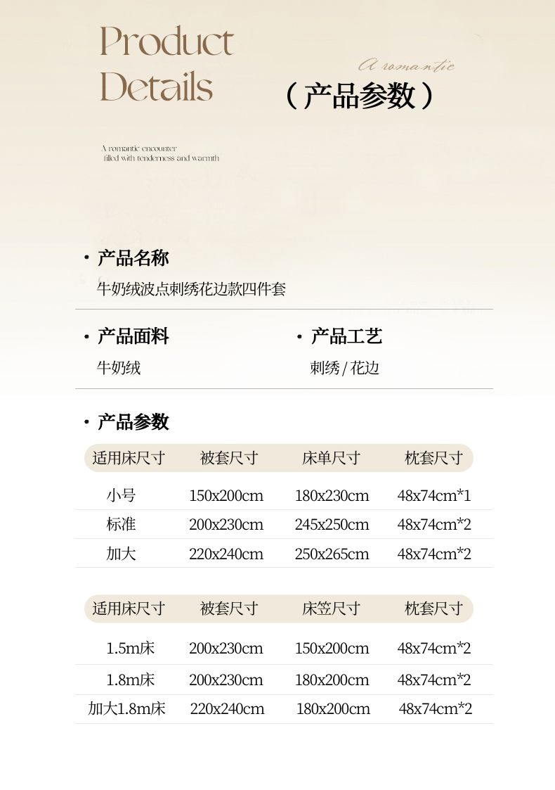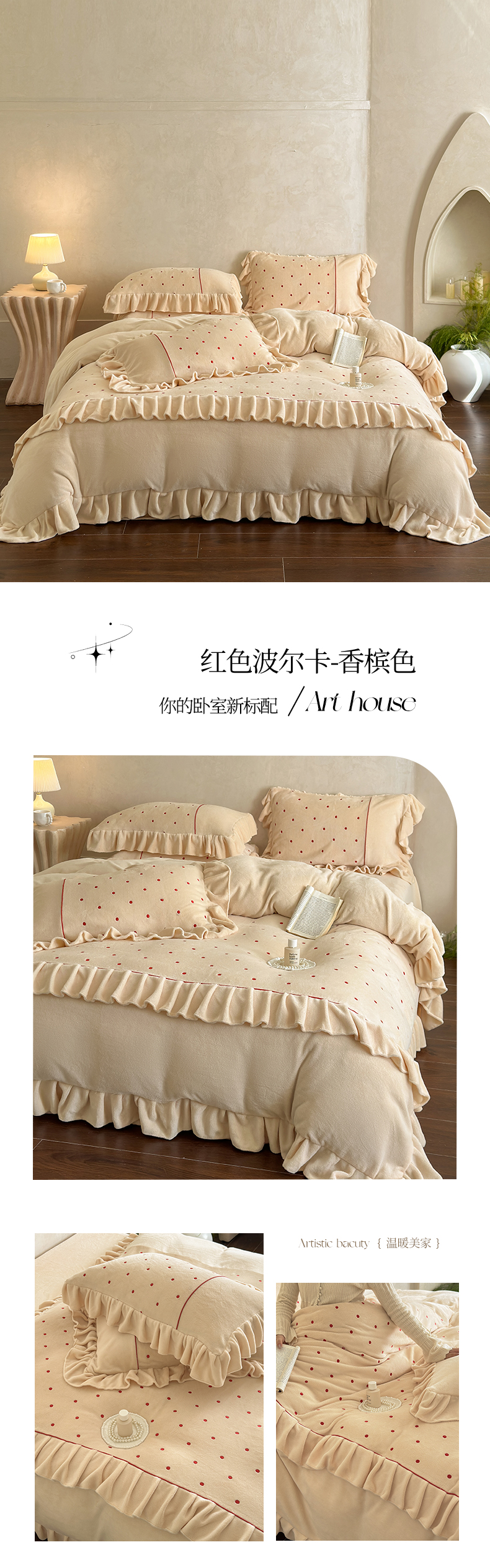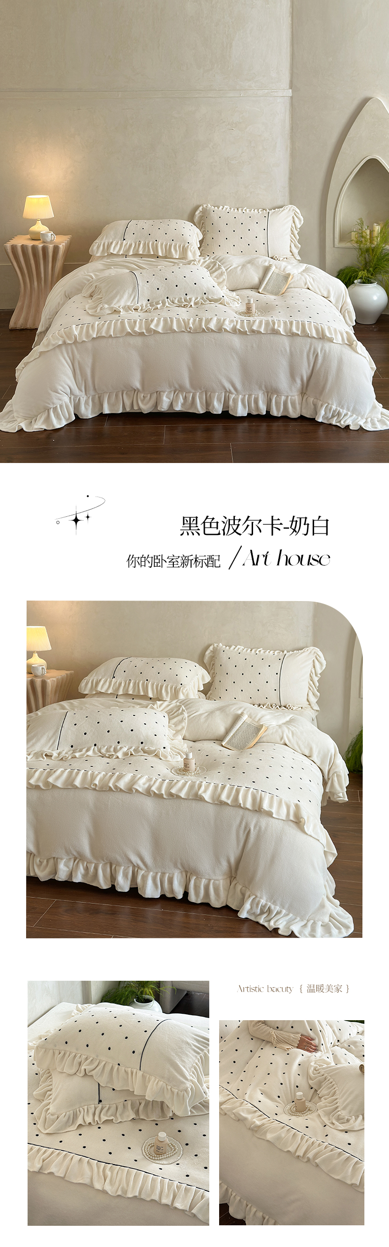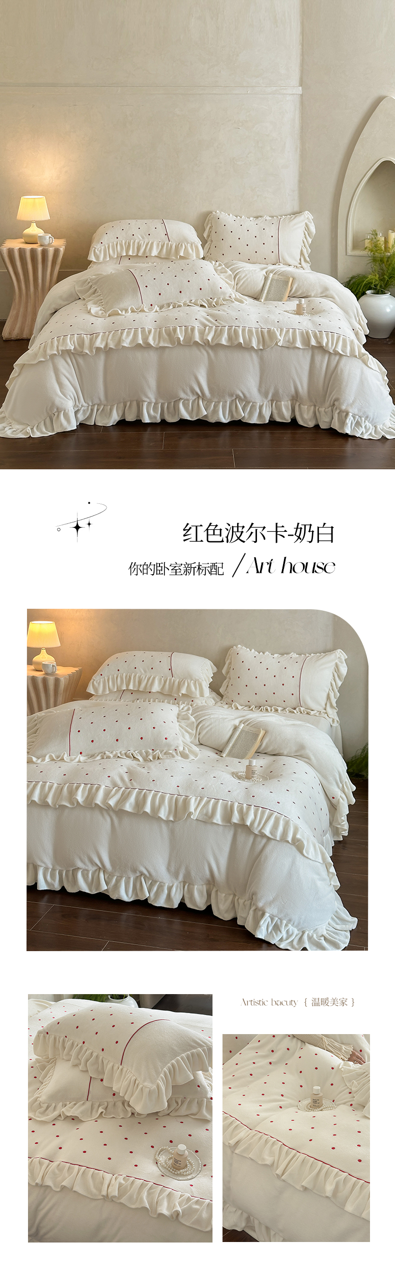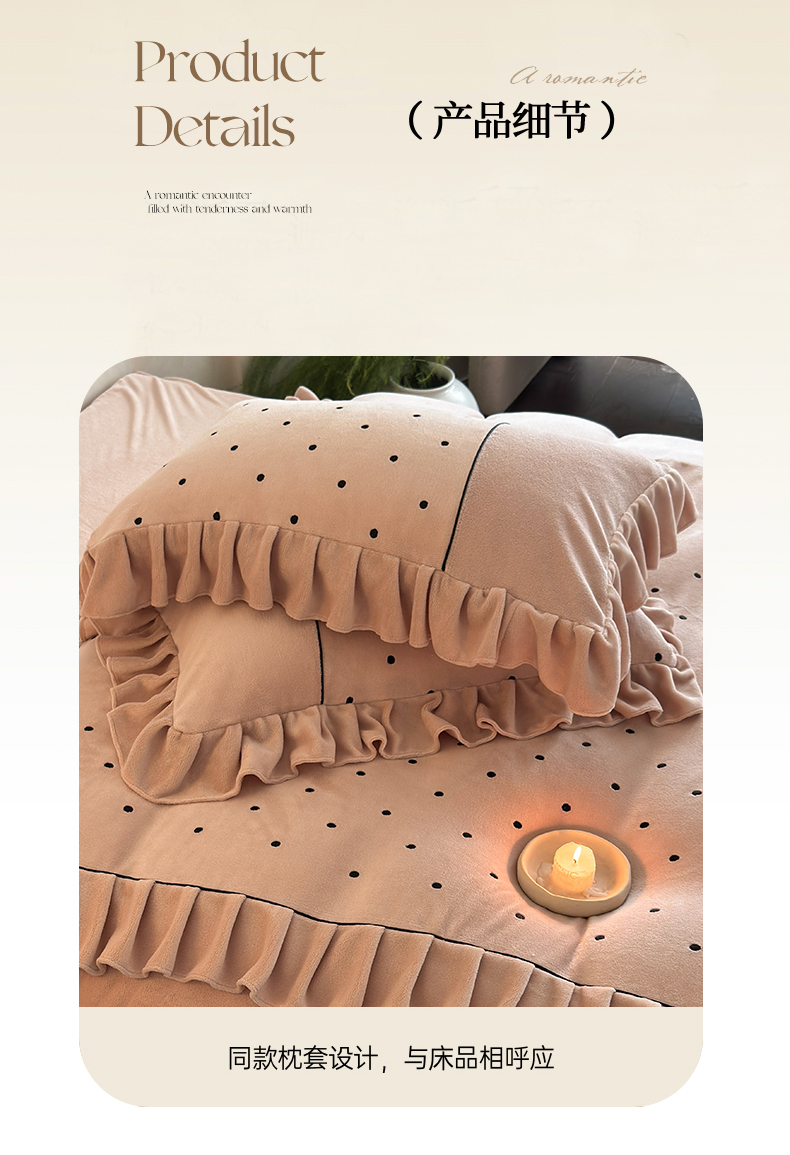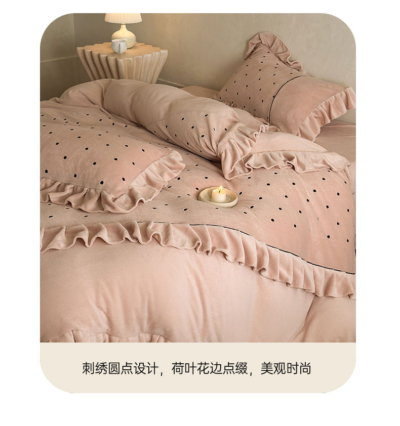 商品名称:(总)豪美鑫 2025新款牛奶绒波点刺绣花边四件套-波尔卡系列