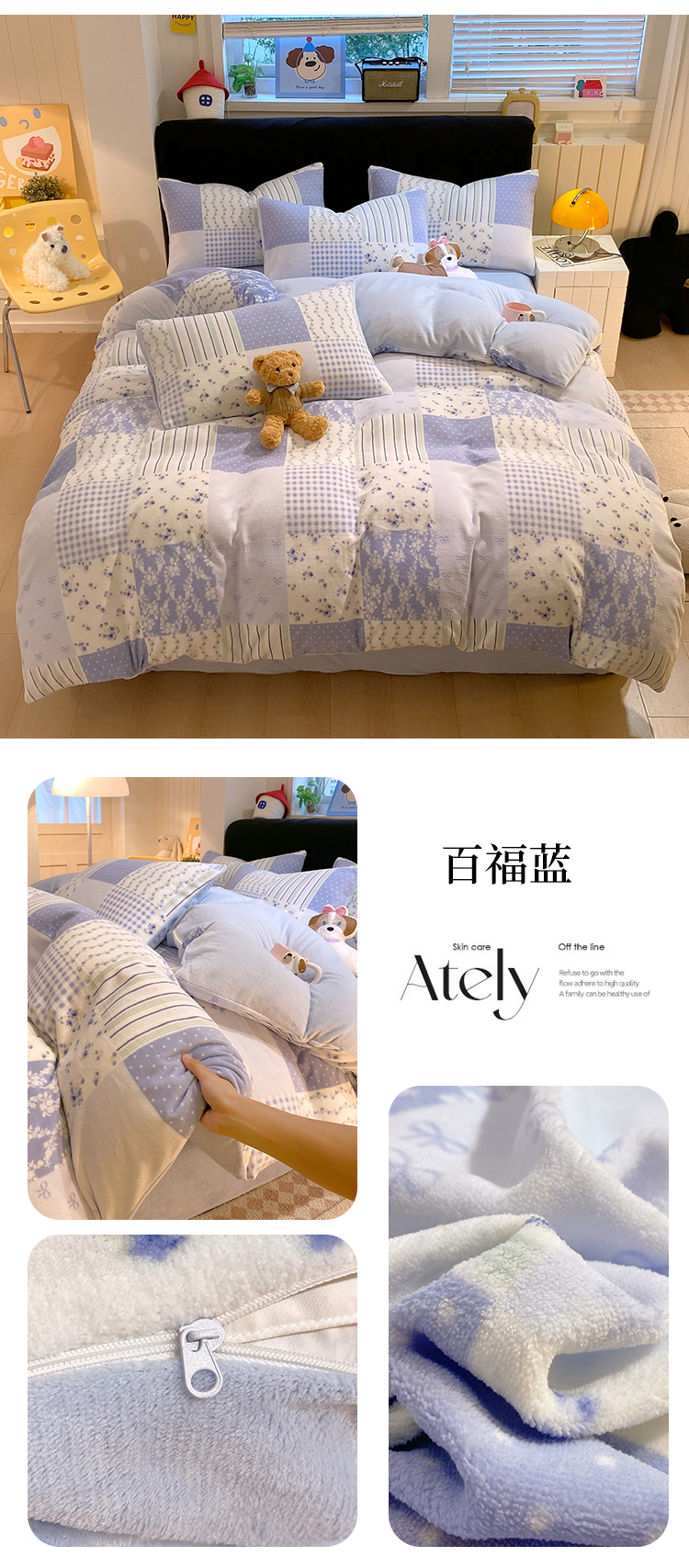 商品名称:佰亿莱 2025直播新款印花小清新法莱绒牛奶绒四件套百福蓝
