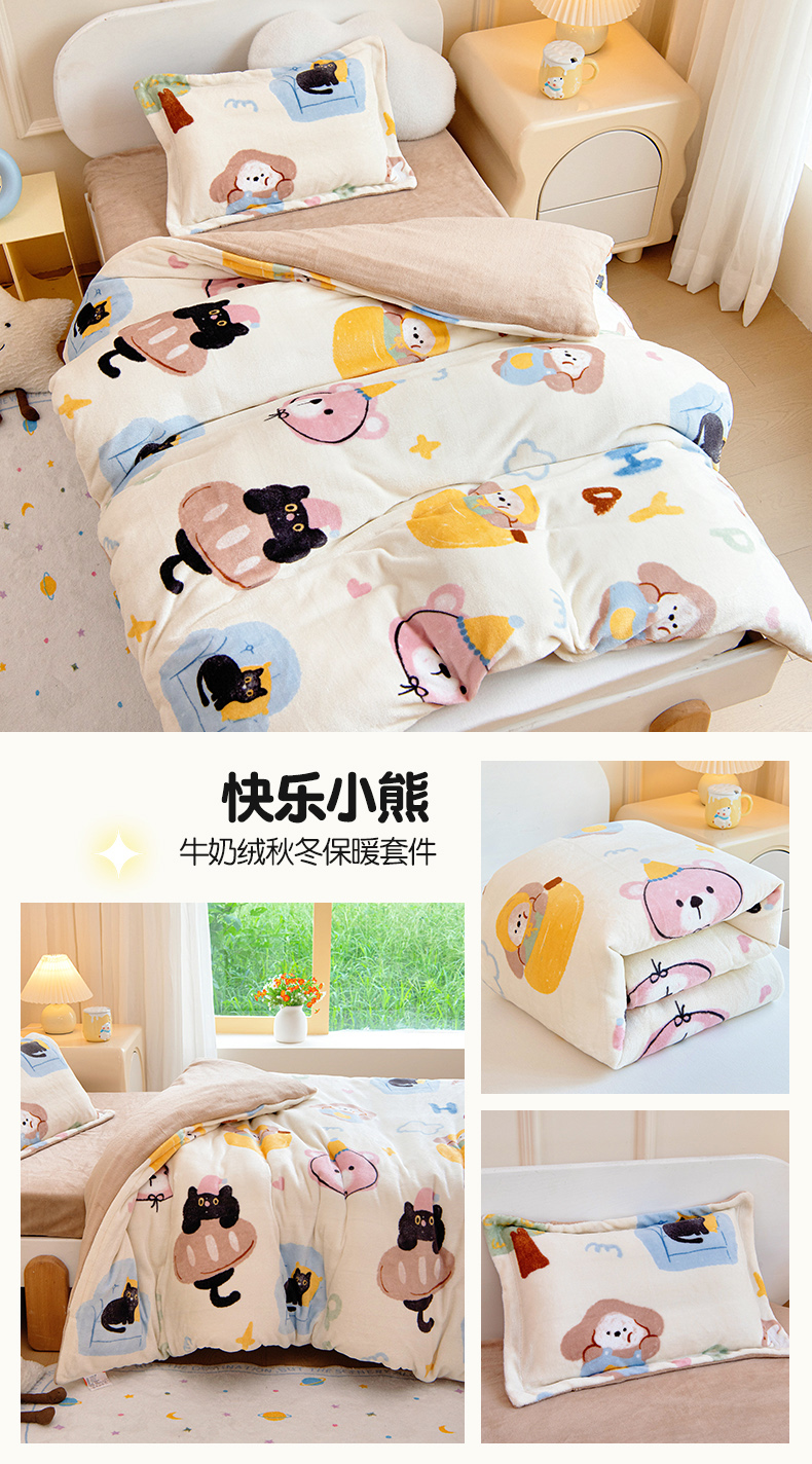 • 91家纺网 家纺一手货源 找家纺 (总)梵赫 2025新款加厚牛奶绒贴布绣原创卡通幼儿园套件儿童三件套,超级小萌怪,可爱小鸭,围巾兔,机灵小挖机,巧克力熊,组合,大象先生