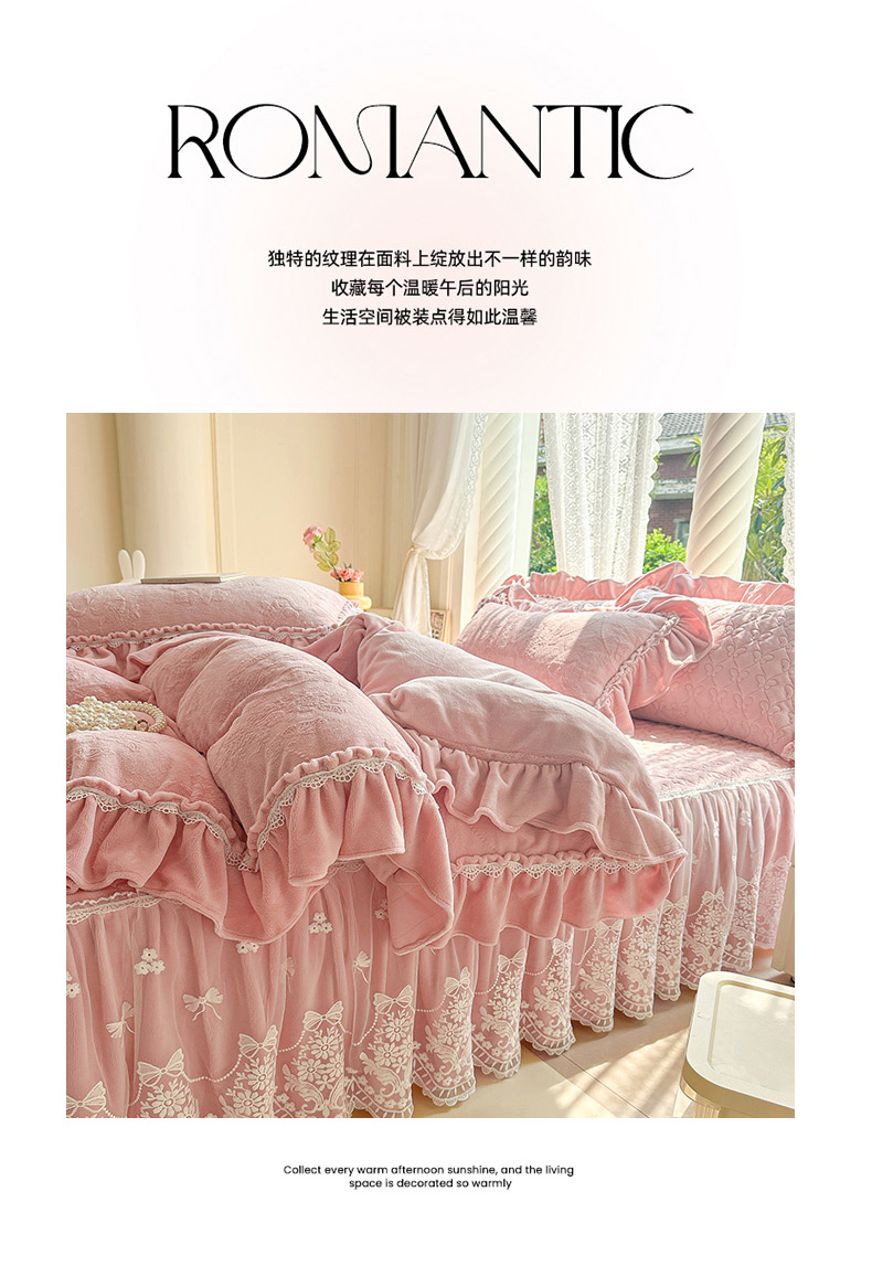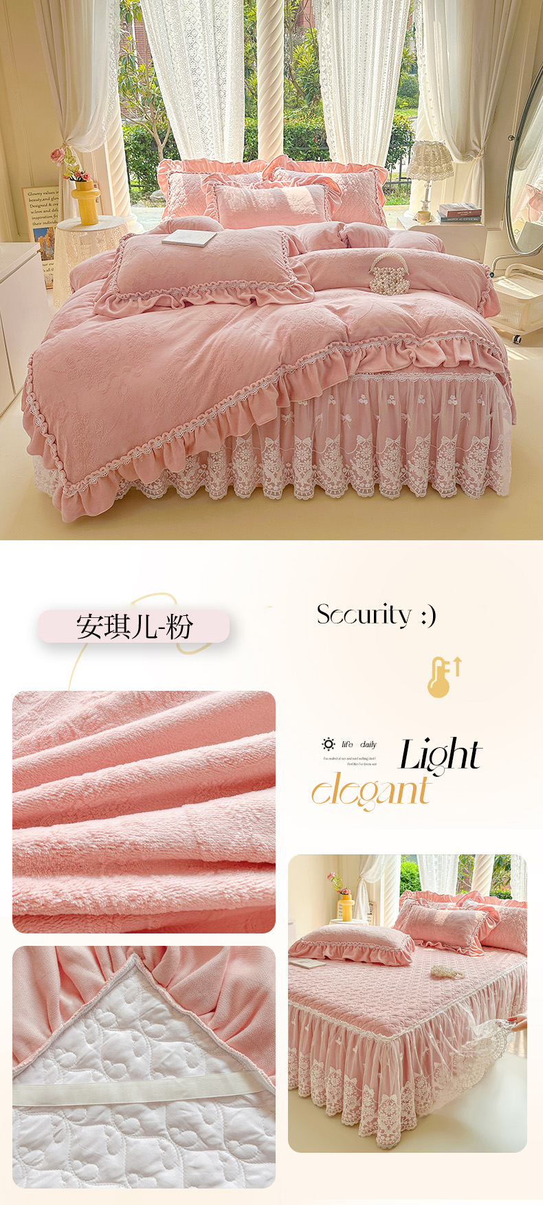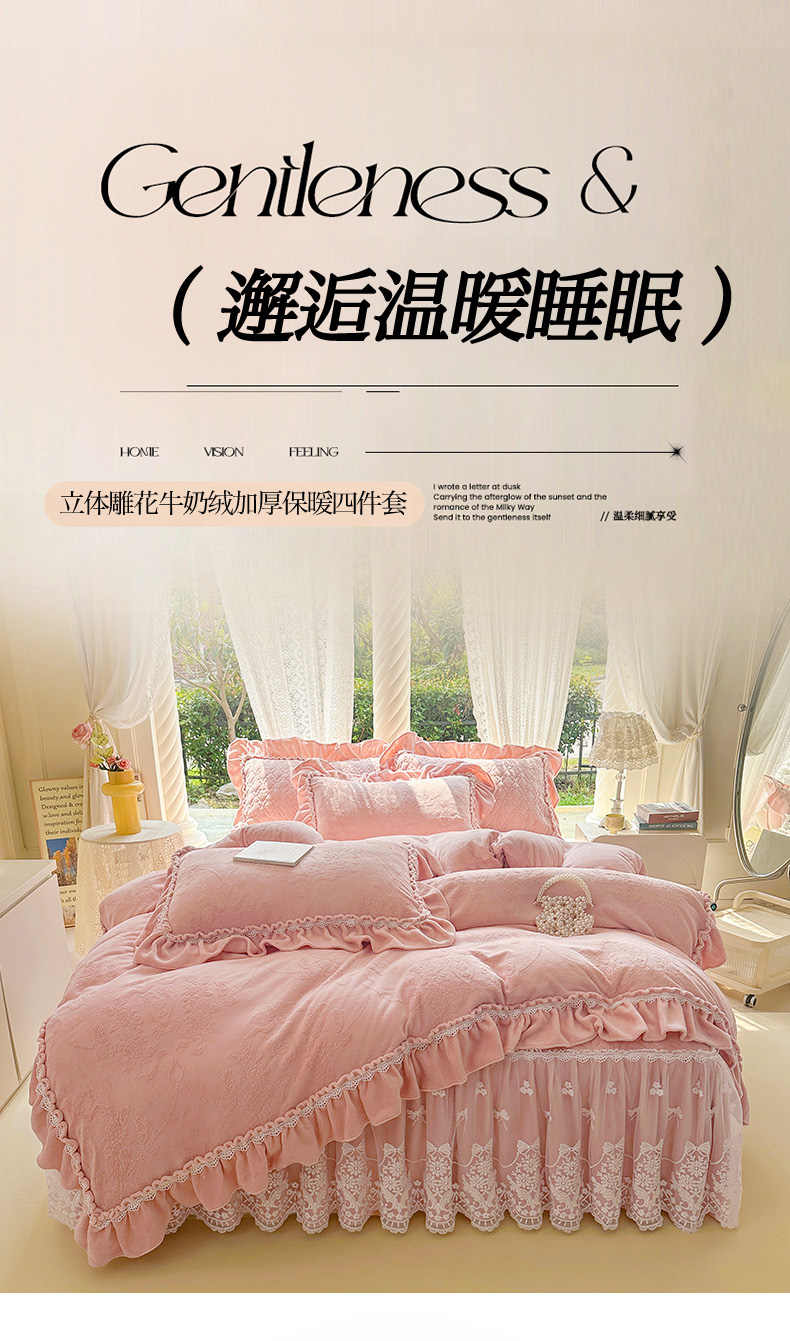 当前位置: 91家纺网 > 商品网购 > 床品套件 > 四件套 > 其它四件套 > 罗艺轩 【控价】2025新款立体雕花牛奶绒加厚保暖床裙款四件套-安琪儿 安琪儿-粉