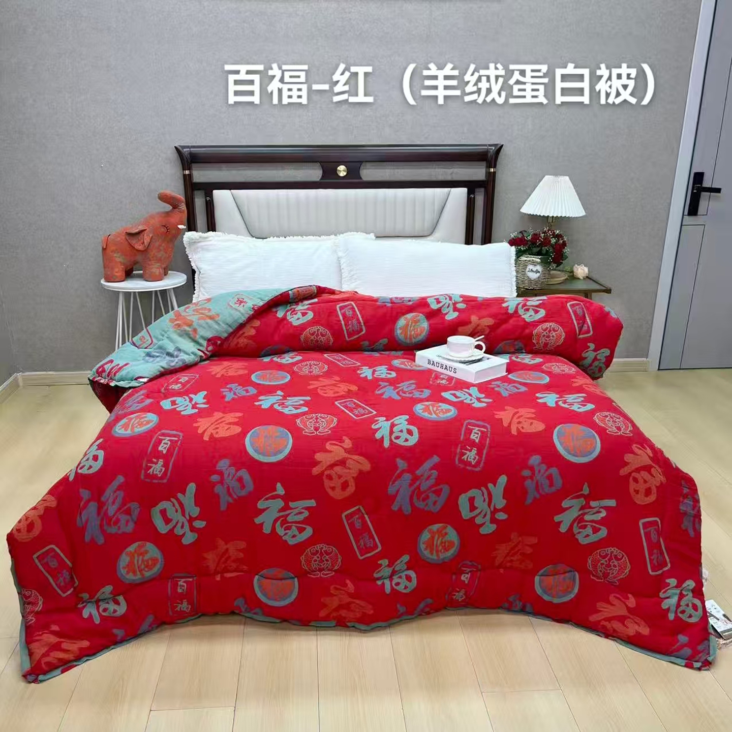 商品名称:鲁爱家纺供货 2025新款全棉色织提花羊绒蛋白秋冬被 百福-红