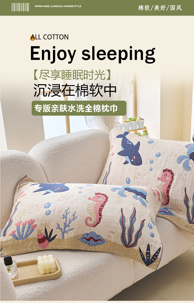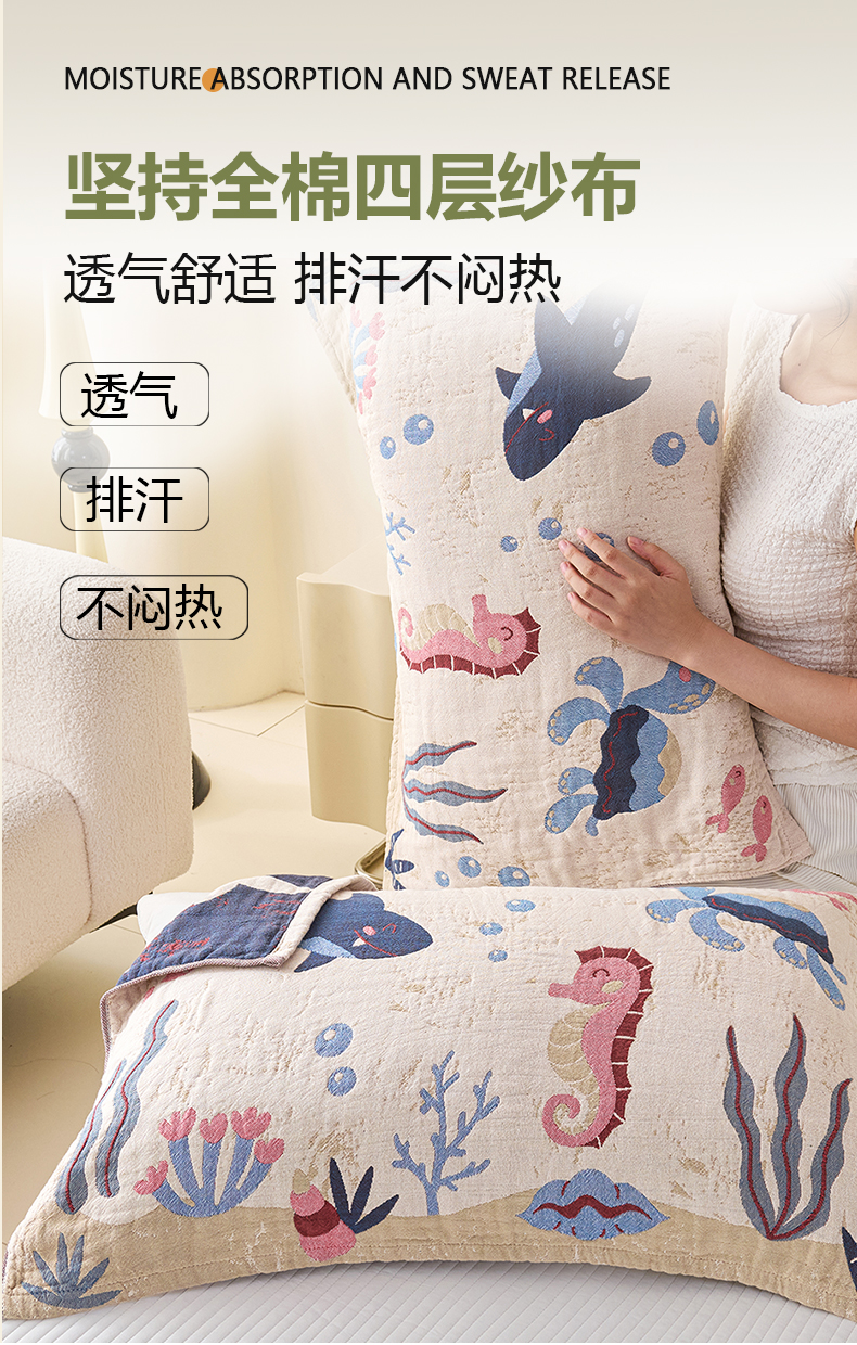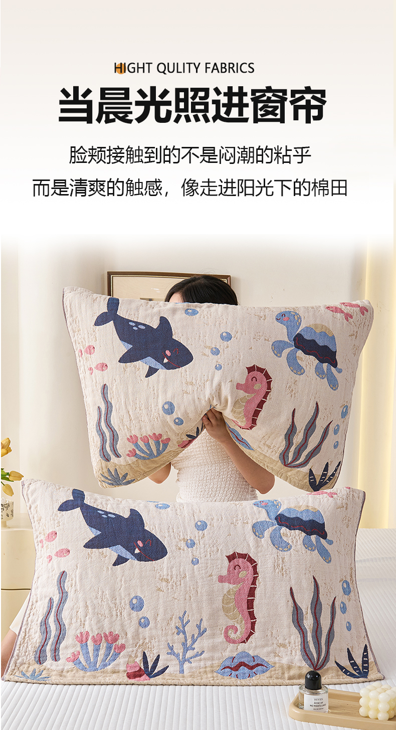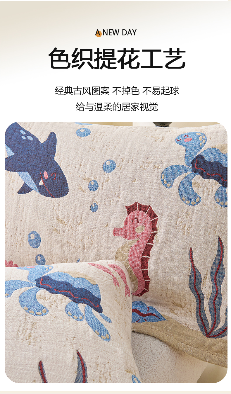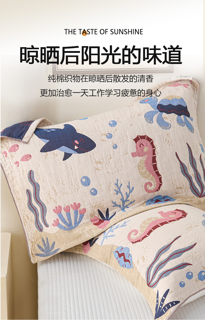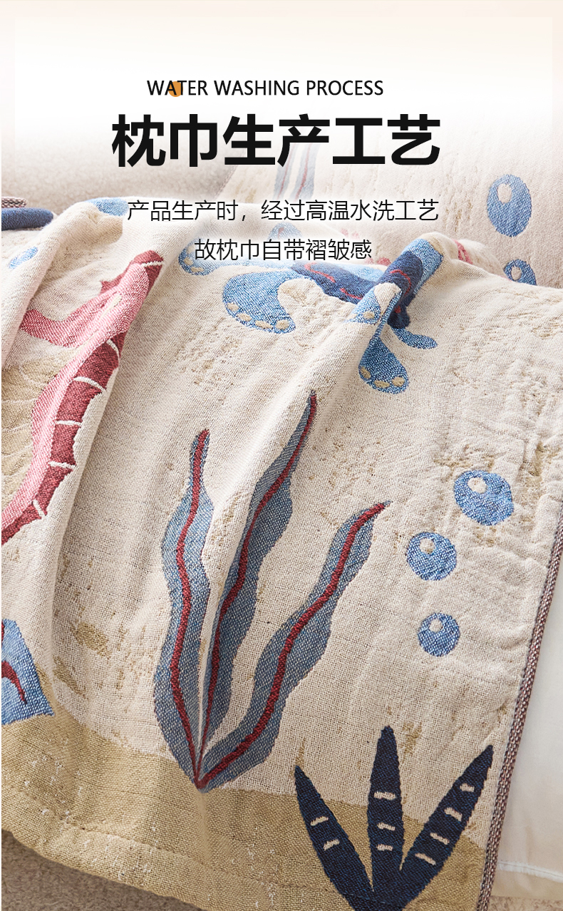 棠薇家纺 2025新款纯棉纱布枕巾水洗全棉枕巾色织提花透气排汗预缩水 海底世界