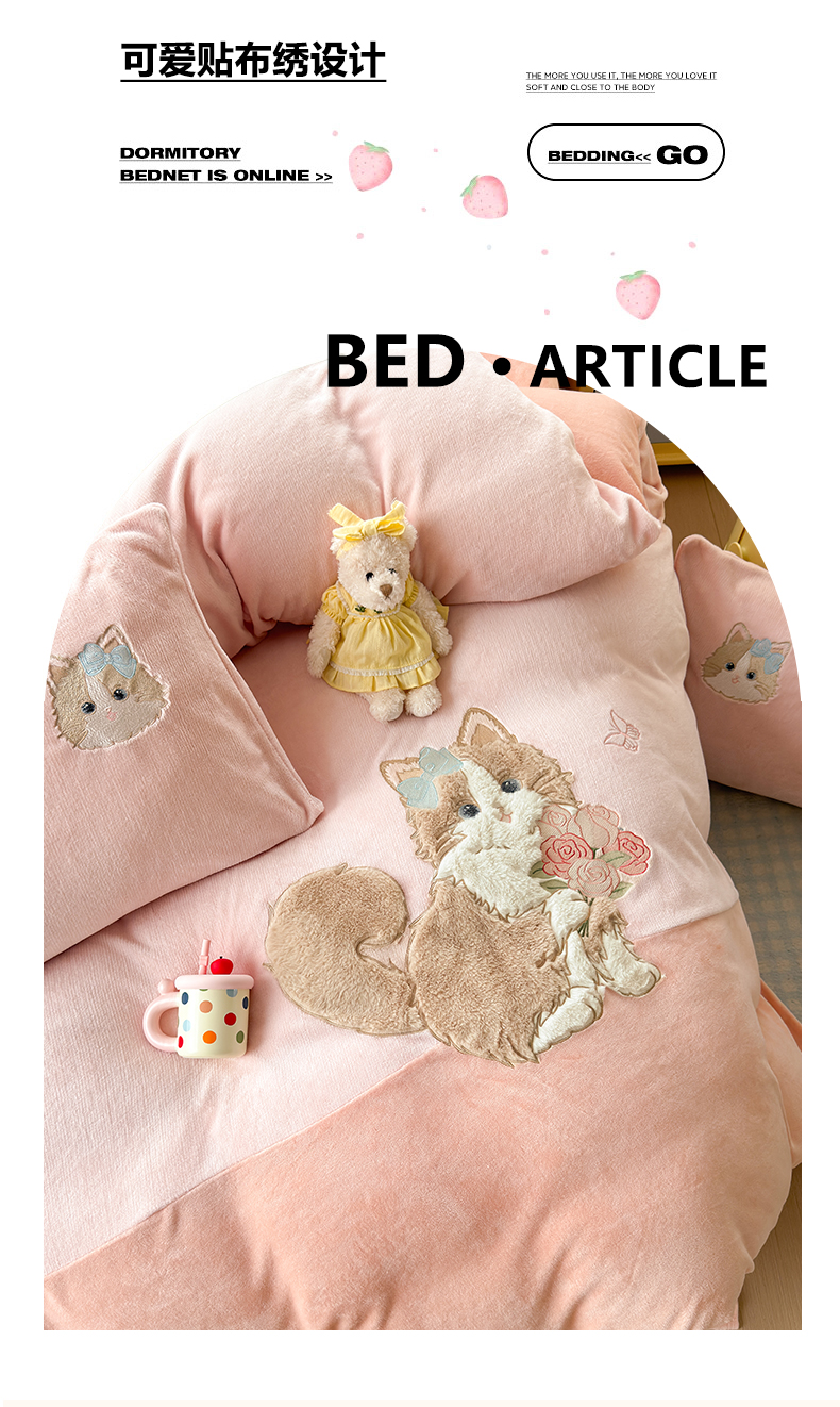 (总)寐居家纺 2025新款贴布绣高克重牛奶绒四件套,安吉拉喵,查理狗,粉糯kitty,皮皮布布