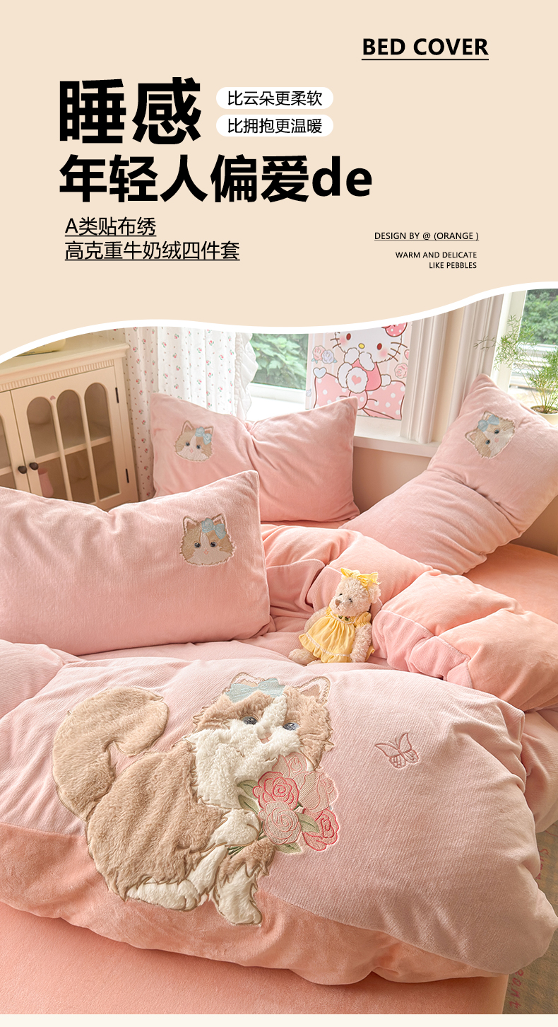 商品名称:寐居家纺 2025新款贴布绣高克重牛奶绒四件套 安吉拉喵