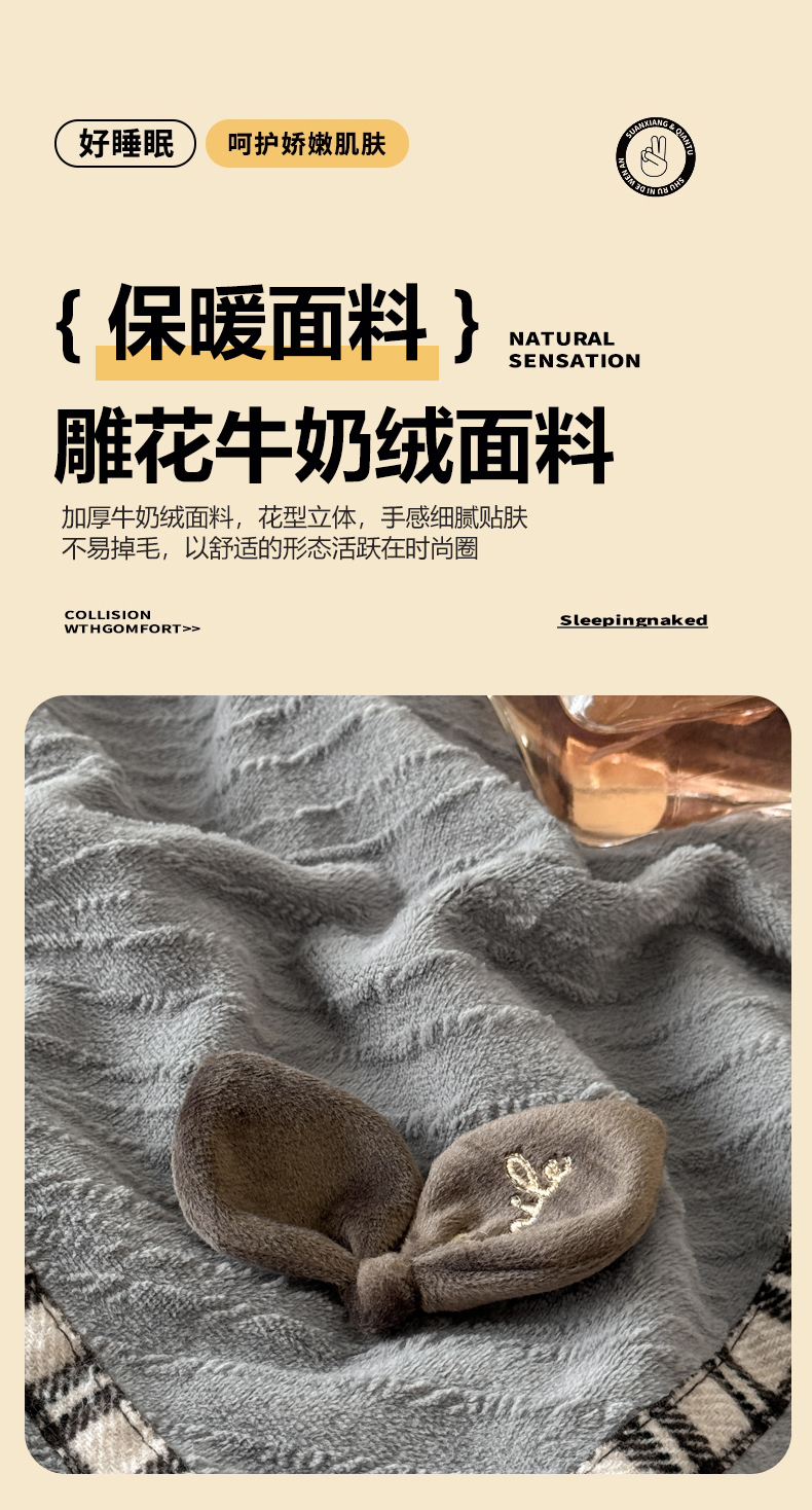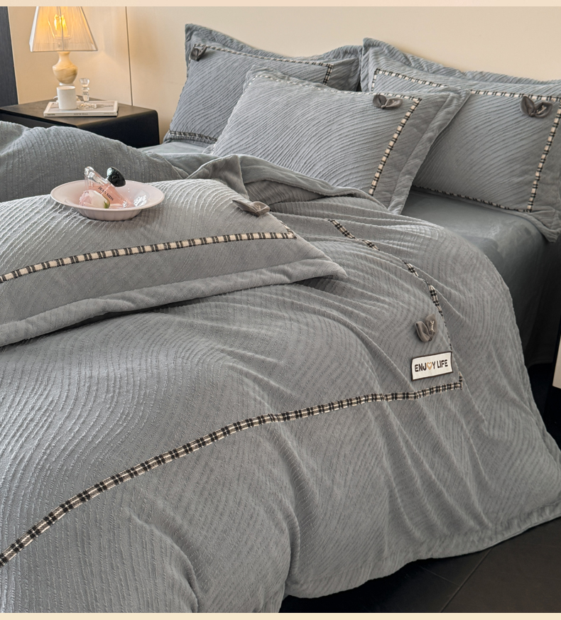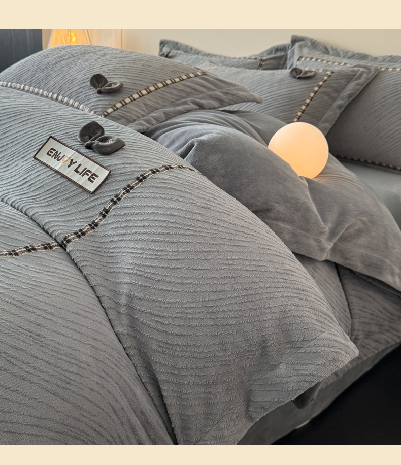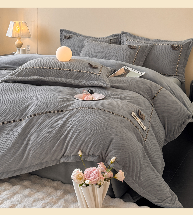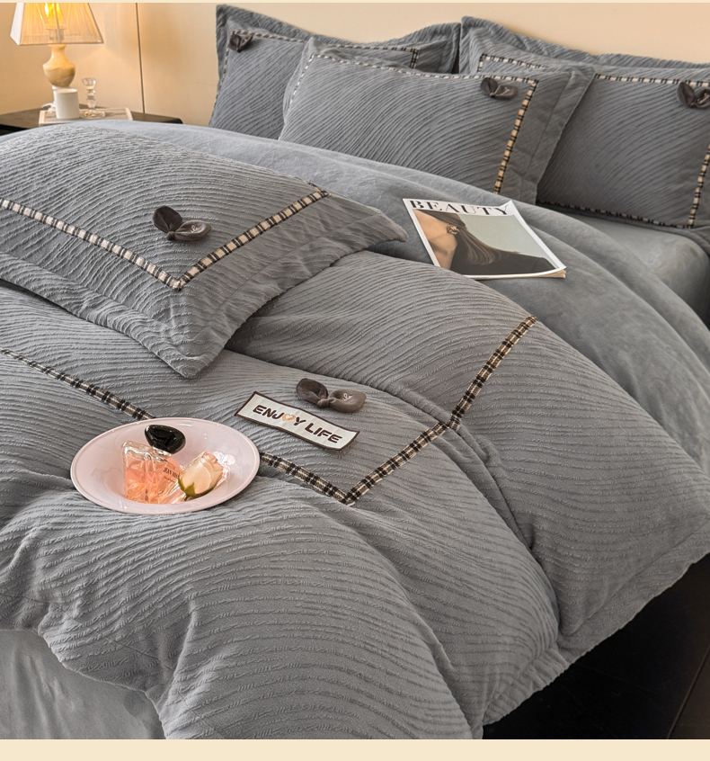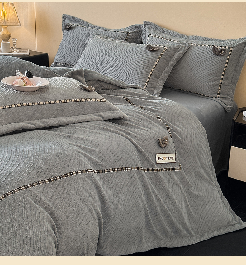 叠派家纺 2025新款高克重高端牛奶绒雕花织带工艺款梦巢系列四件套(直播热款)提供买家秀 梦巢-金典灰