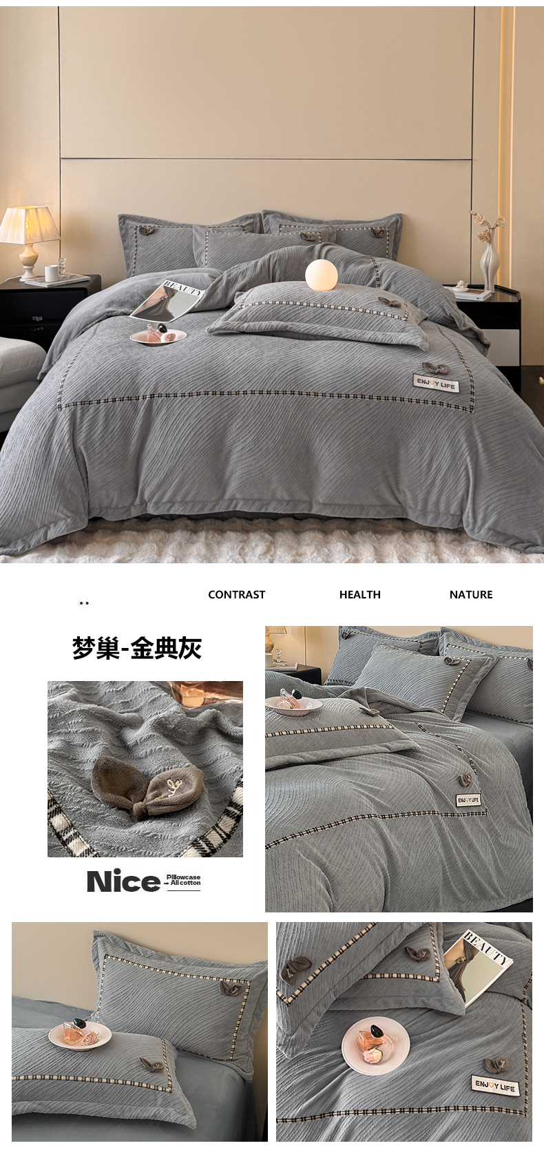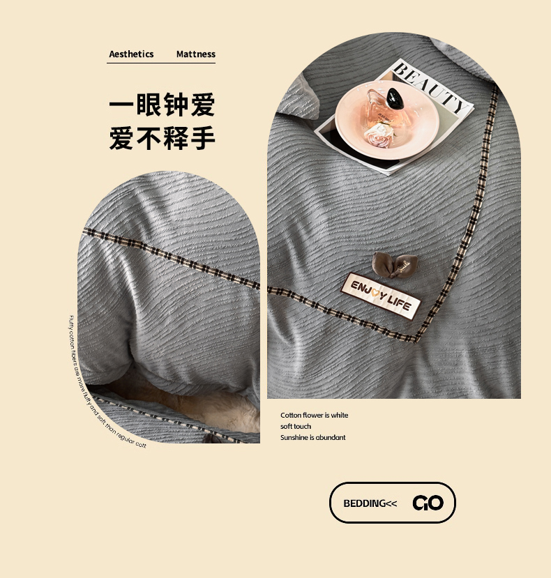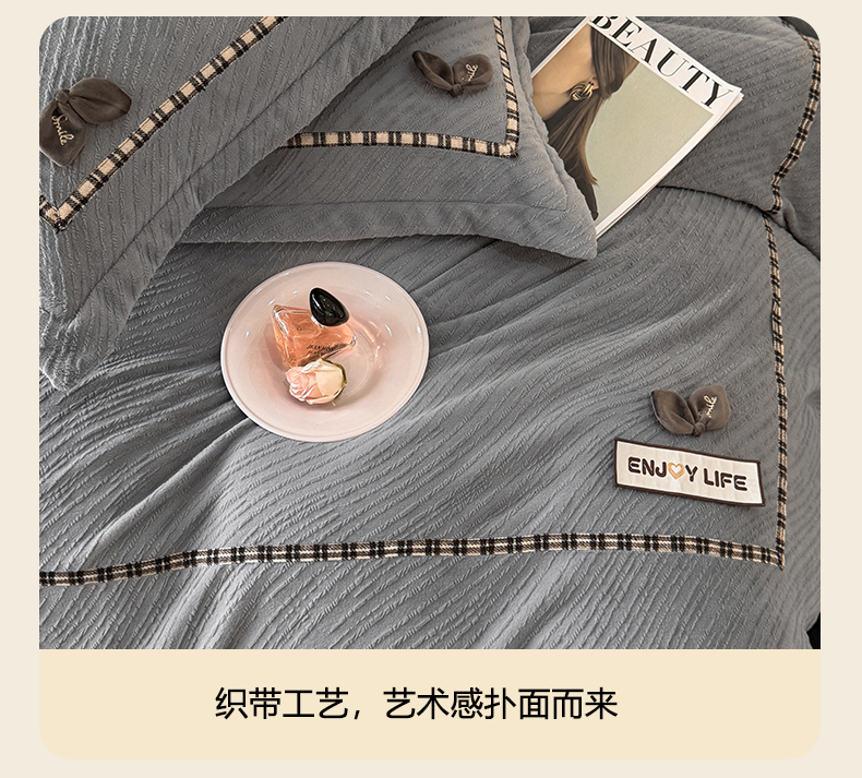 商品名称:叠派家纺 2025新款高克重高端牛奶绒雕花织带工艺款梦巢系列四件套(直播热款)提供买家秀 梦巢-金典灰
